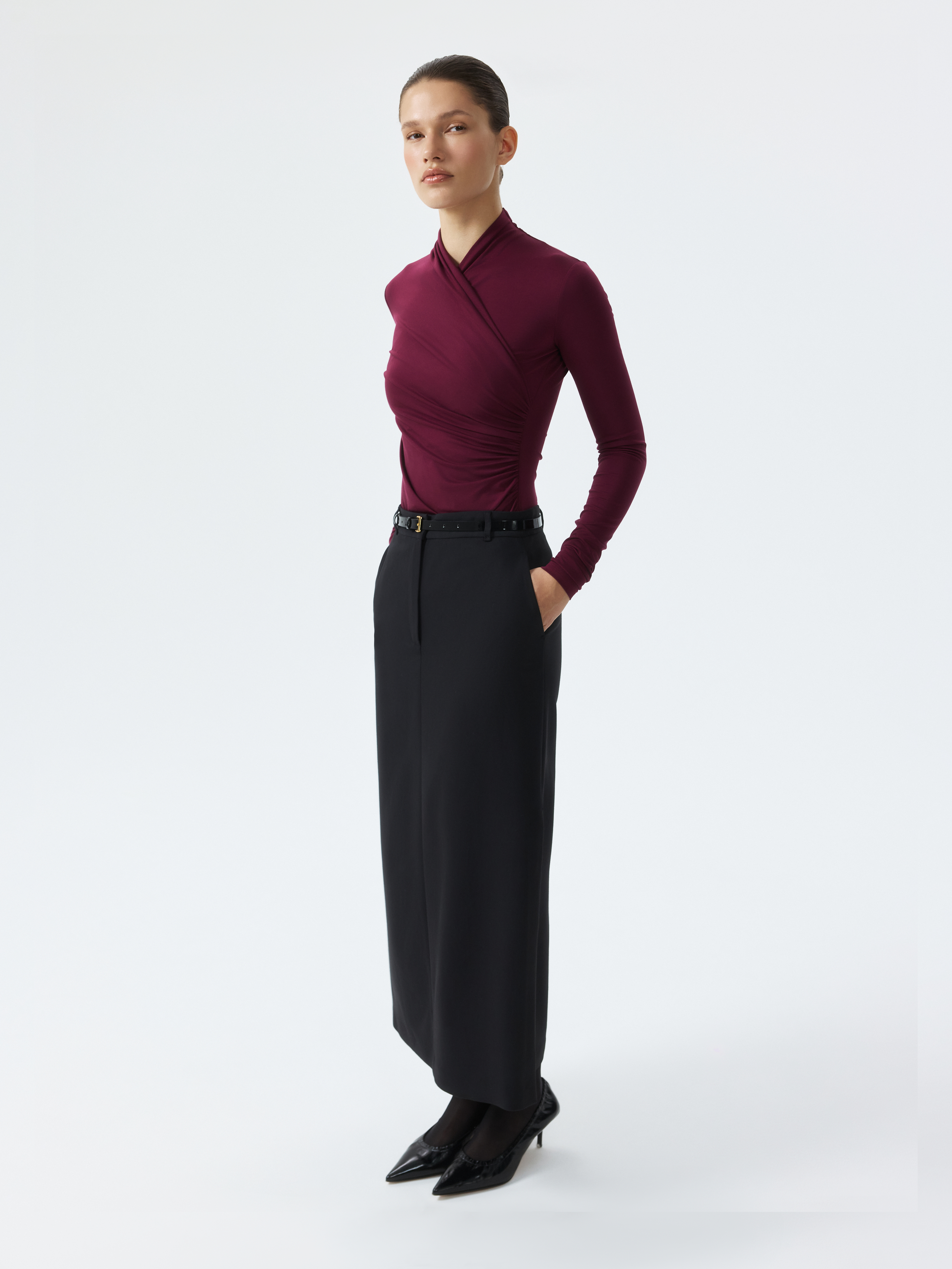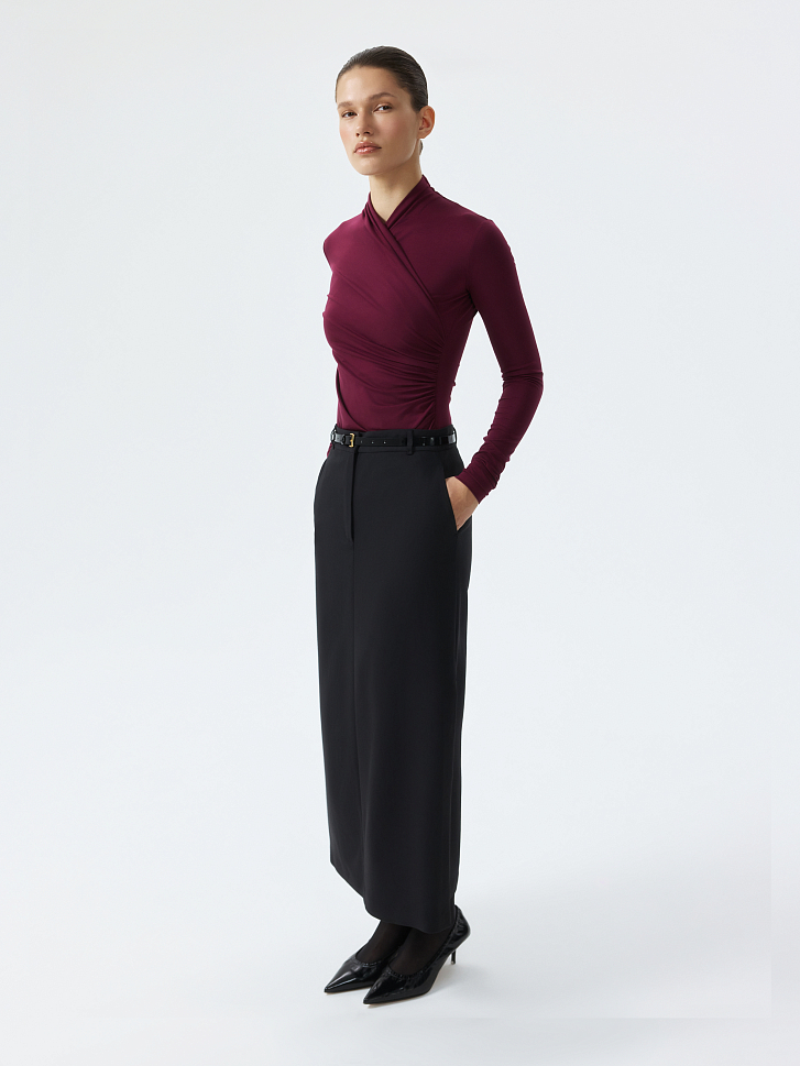 Приталенный лонгслив на запах станет стильной альтернативой базовым моделям. Легкий гладкий трикотаж с эффектом лайкры приятно прилегает к телу и хорошо тянется, не сковывая движения. Центральным акцентом модели выступают изящные драпировки, которые придают фактурности.
