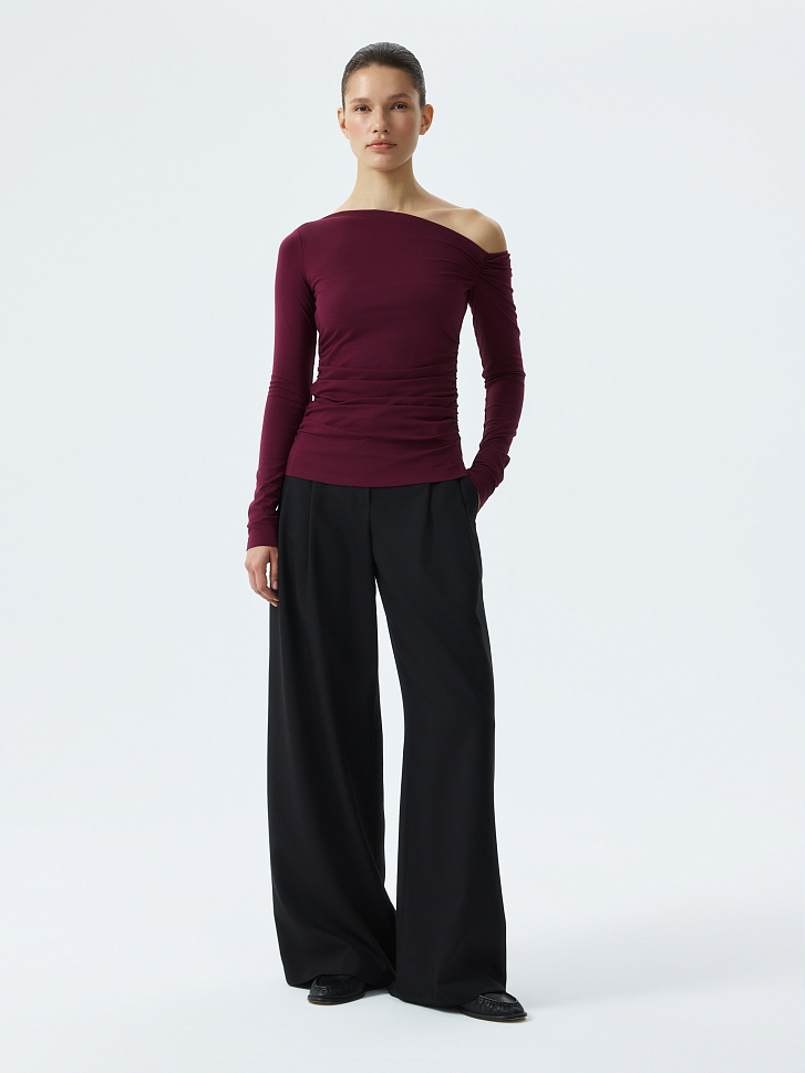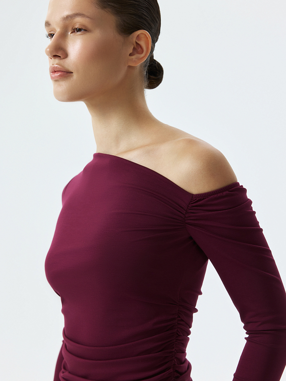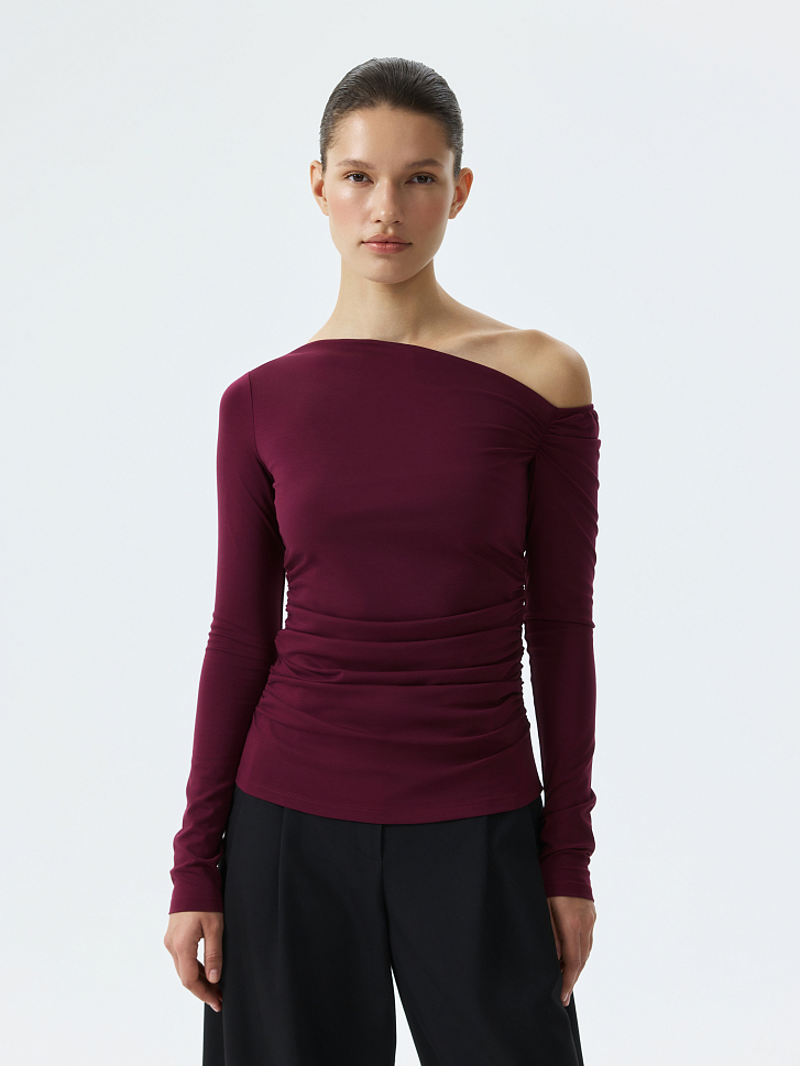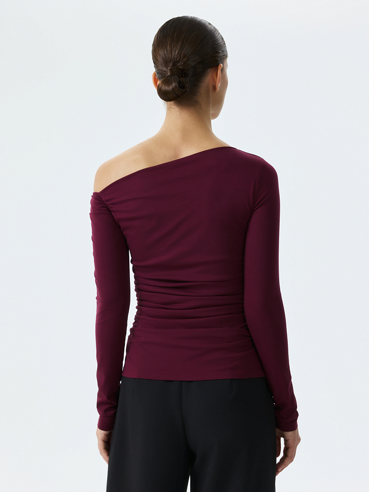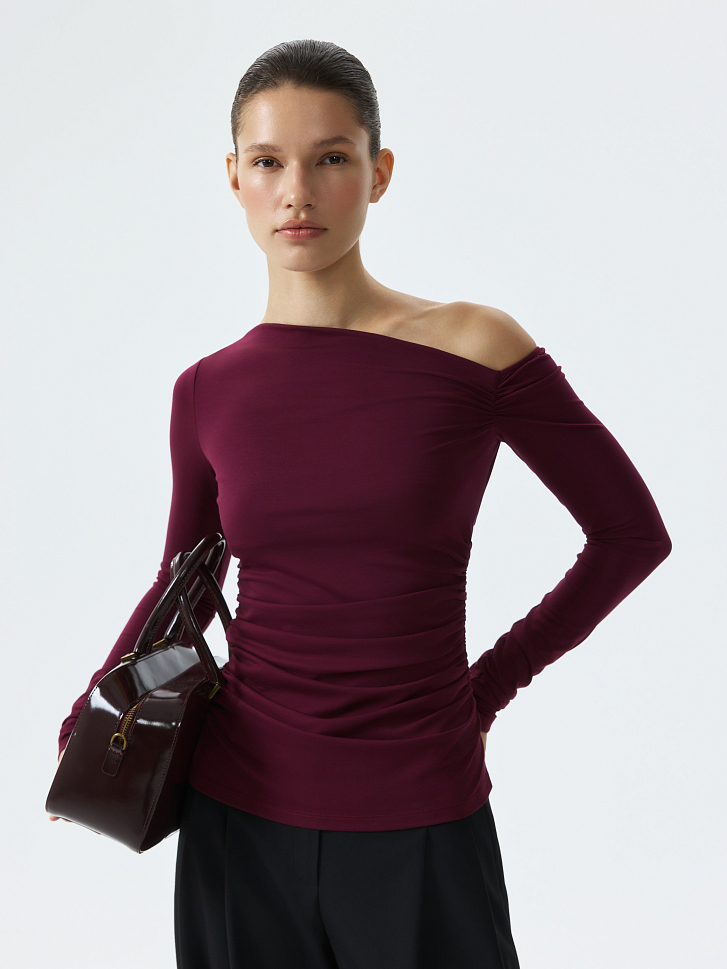 Облегающий лонгслив с драпировками – это эффектная альтернатива базовым моделям. Легкий гладкий трикотаж с эффектом лайкры приятно прилегает к телу и хорошо тянется, не сковывая движения. Асимметричный вырез имеет неожиданную траекторию, изящно открывая одно плечо.
