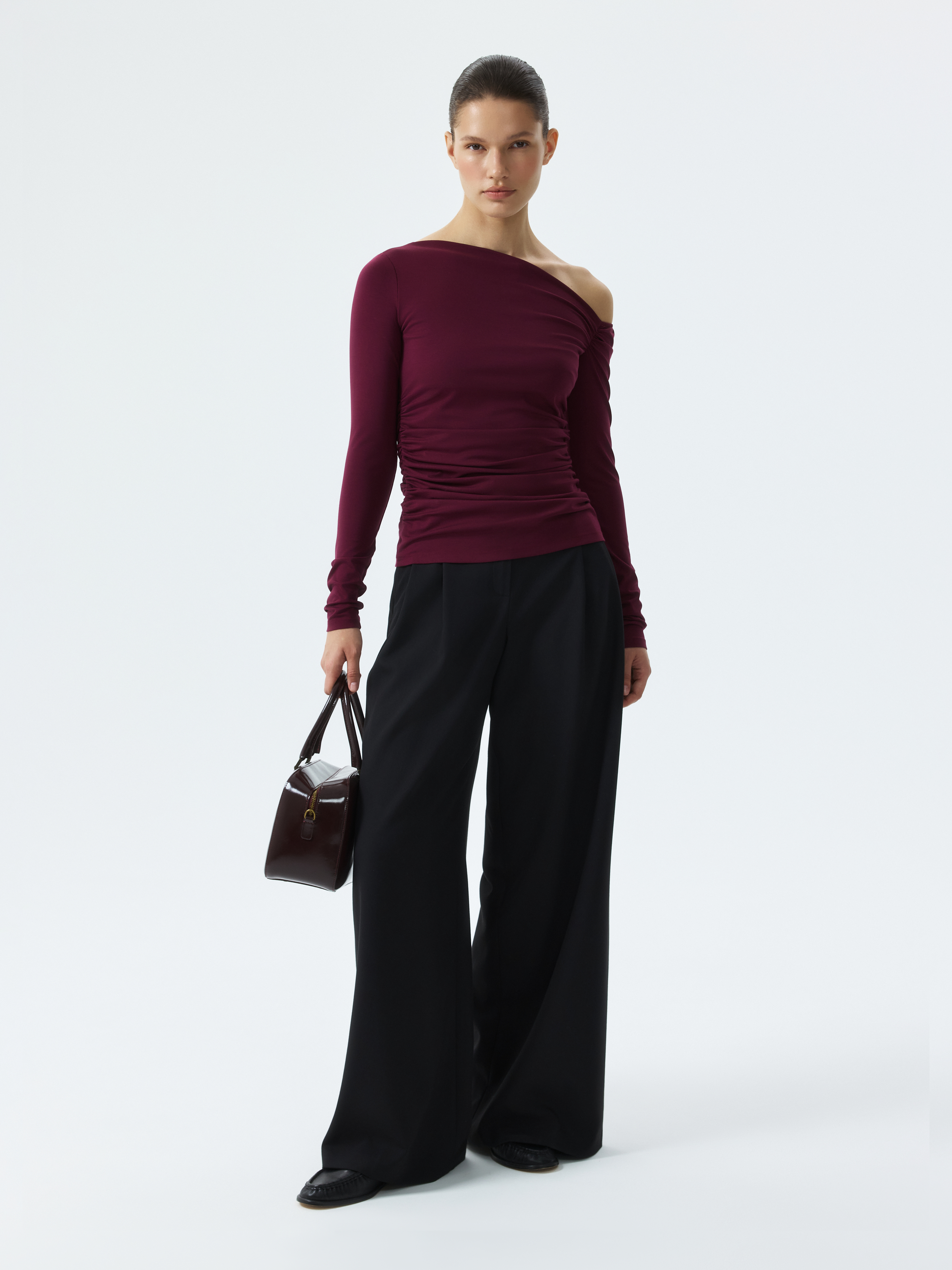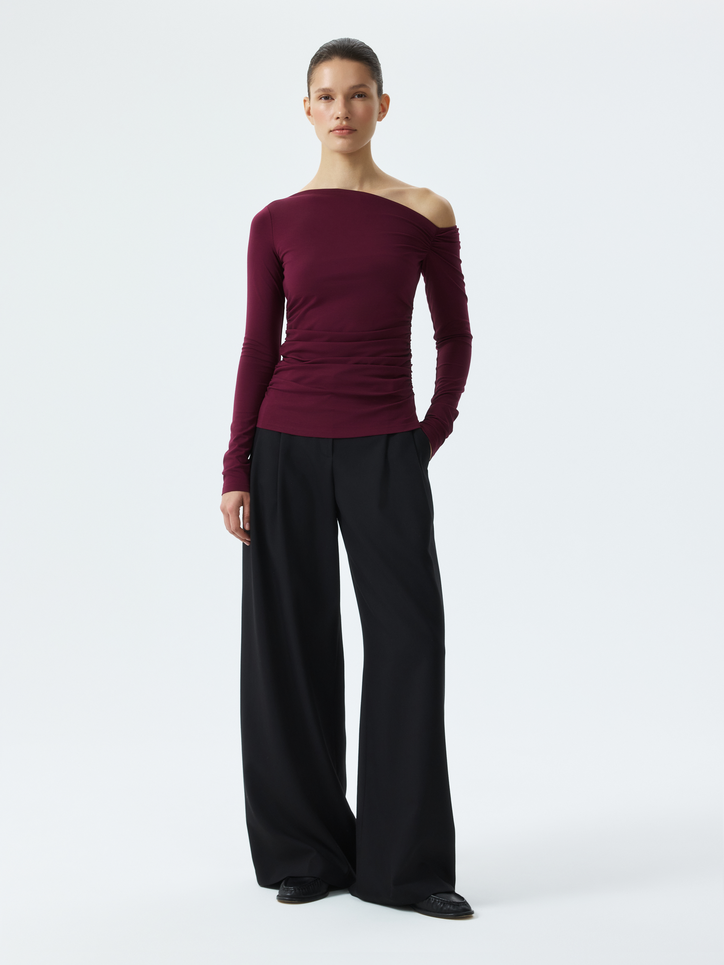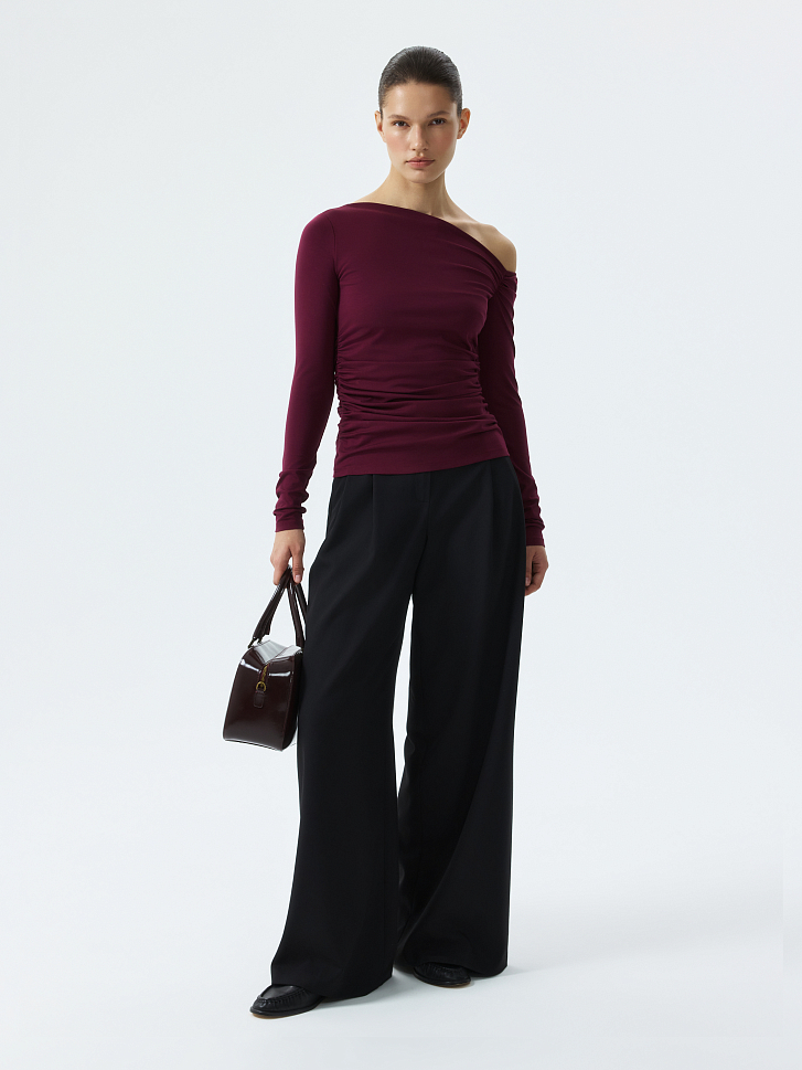 Облегающий лонгслив с драпировками – это эффектная альтернатива базовым моделям. Легкий гладкий трикотаж с эффектом лайкры приятно прилегает к телу и хорошо тянется, не сковывая движения. Асимметричный вырез имеет неожиданную траекторию, изящно открывая одно плечо.