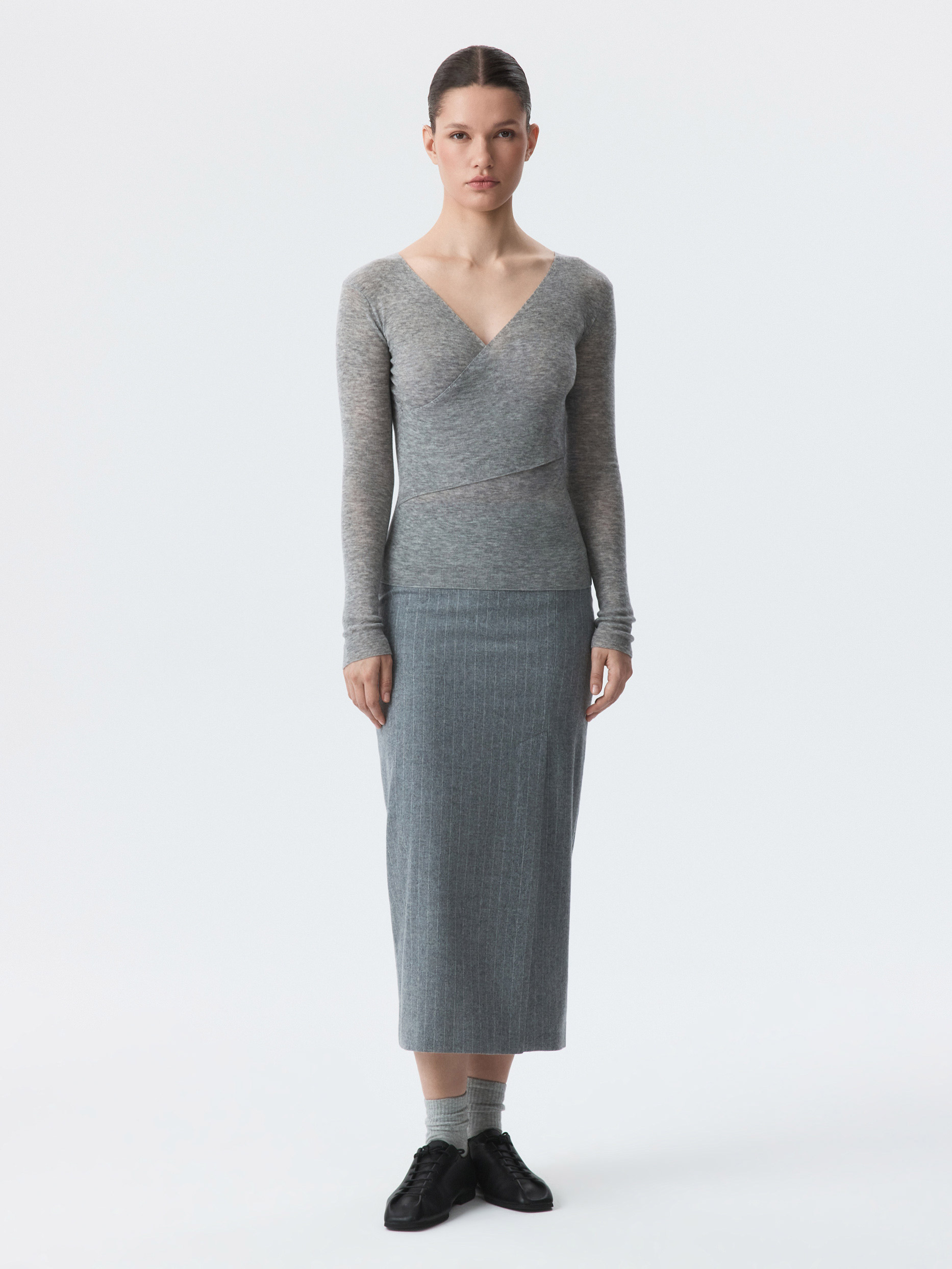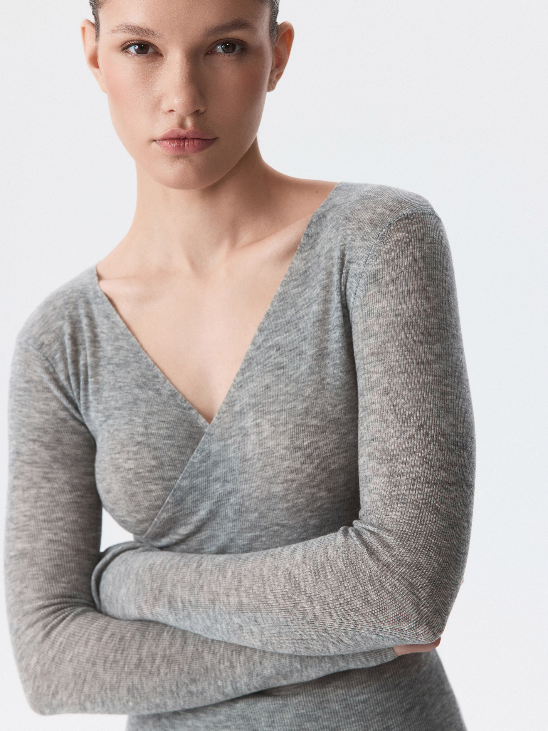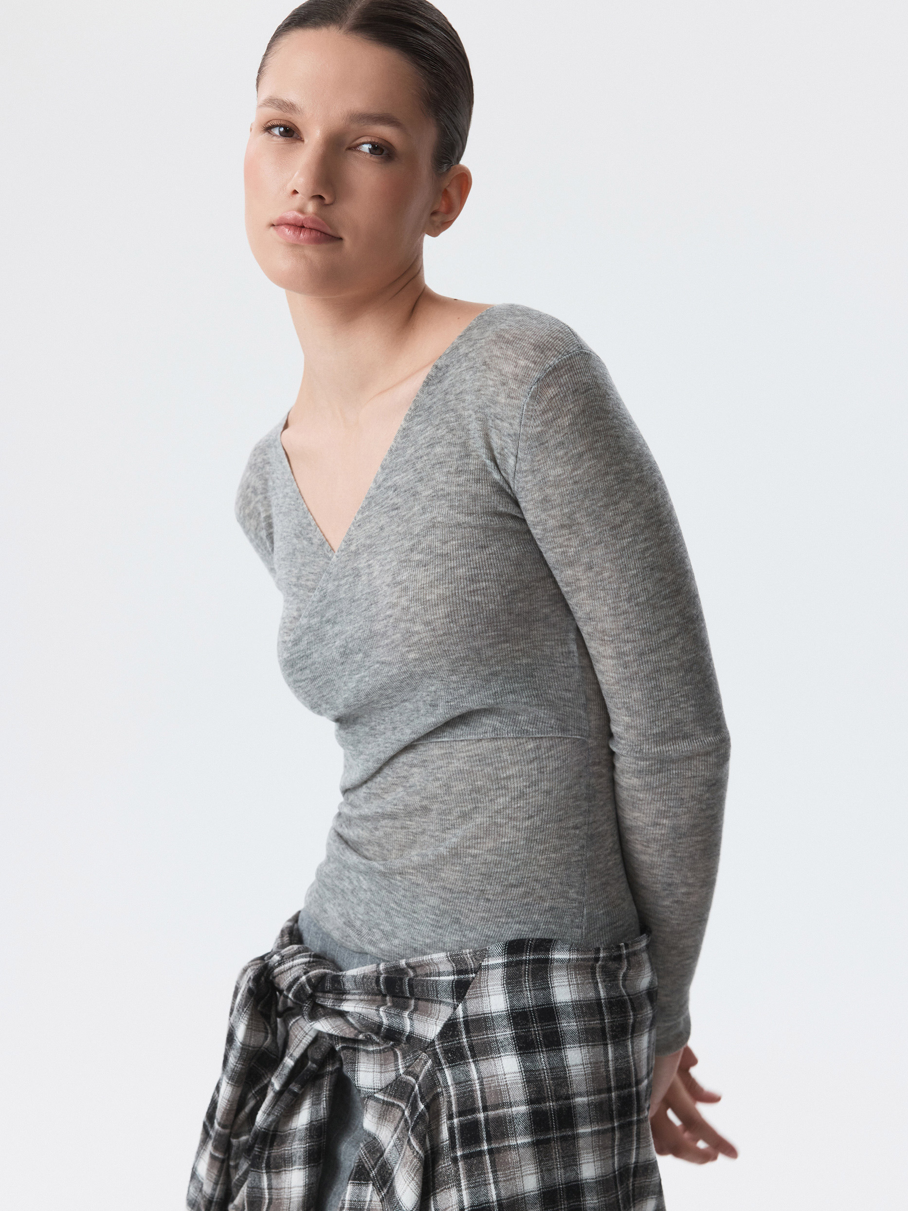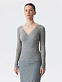 Тонкий джемпер пригодится в любое время года. Полупрозрачный трикотаж из натуральной шерсти в рубчик мягко прилегает и не колется, деликатно согревая. V-вырез на запах создает современный акцент.