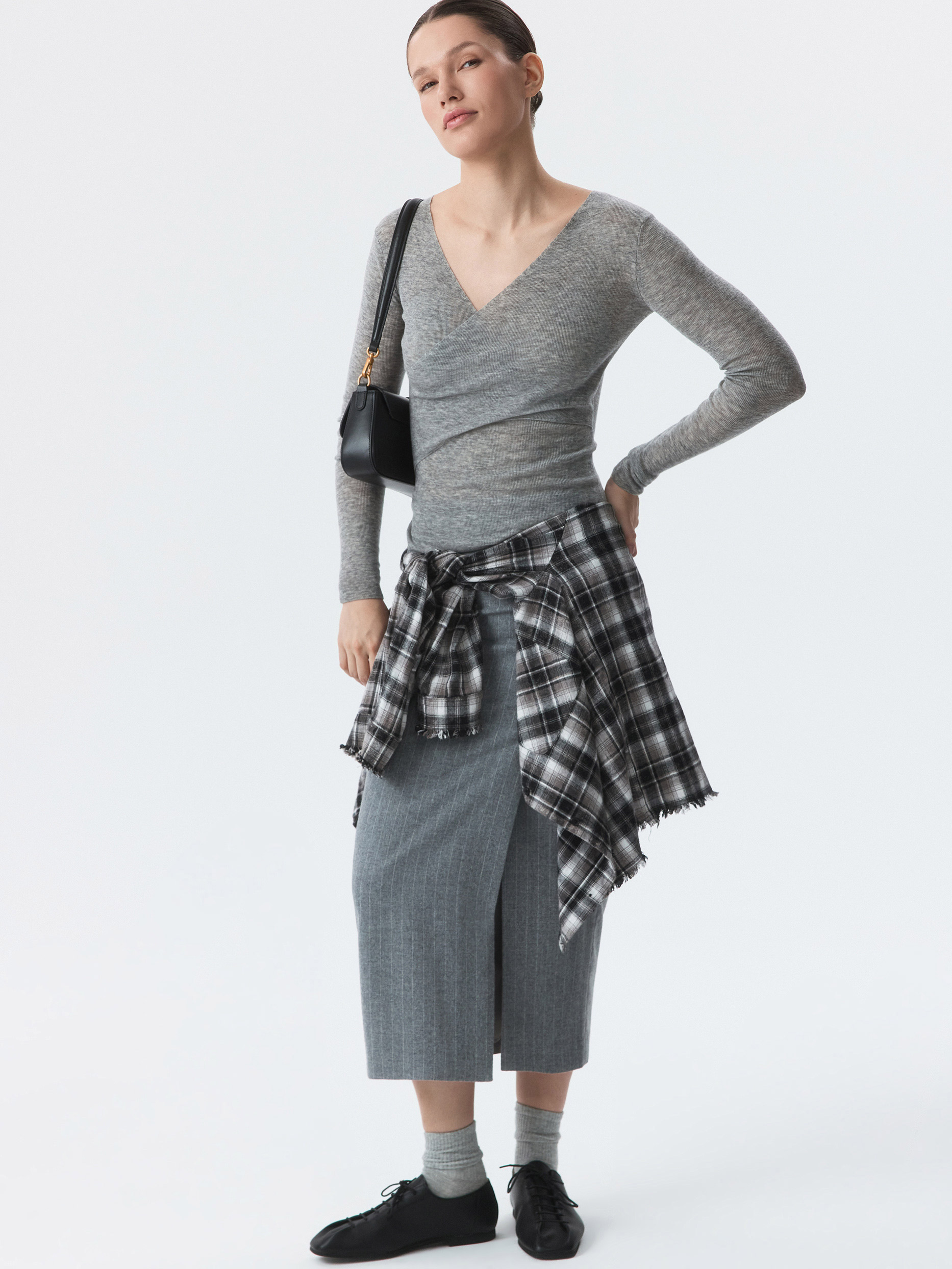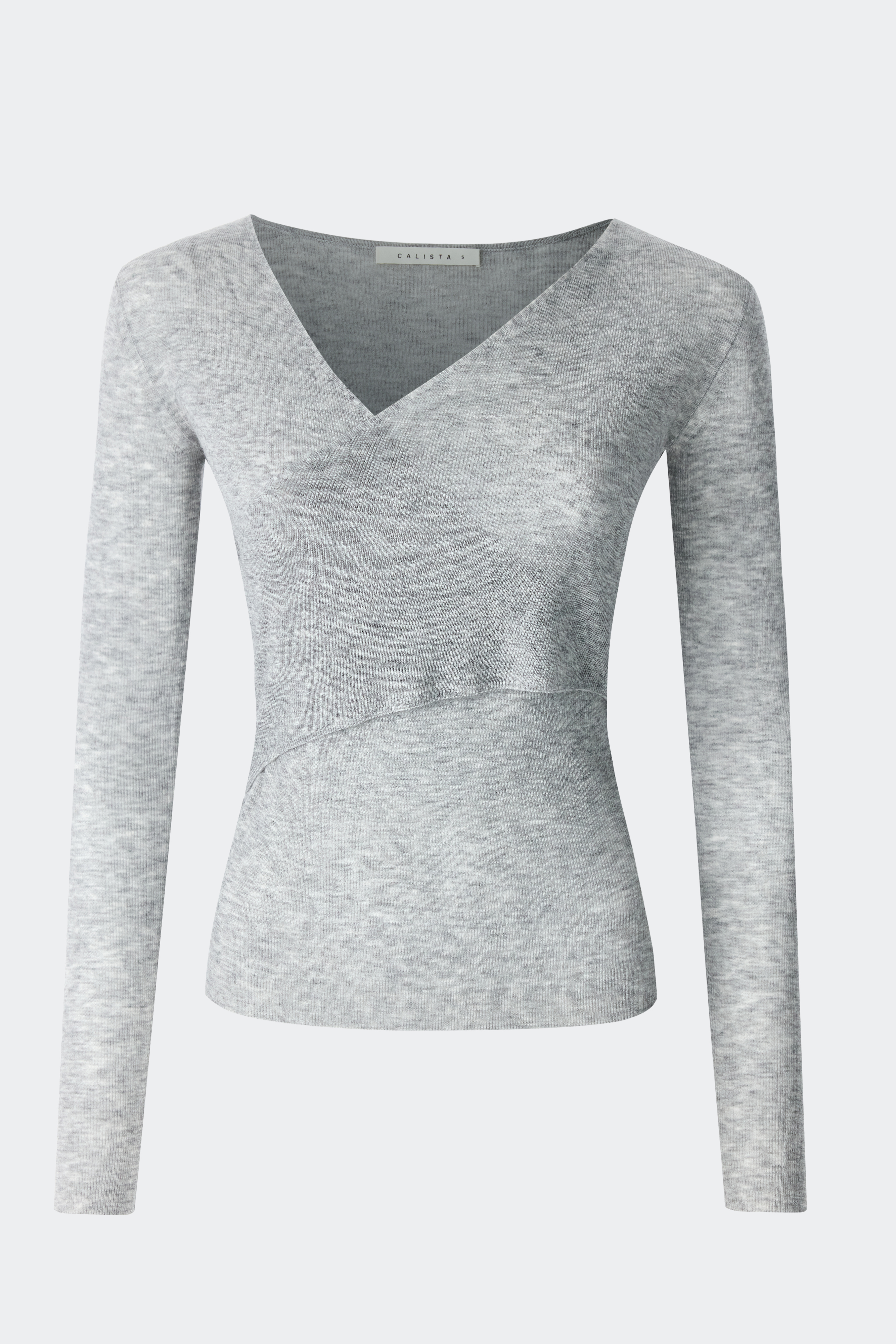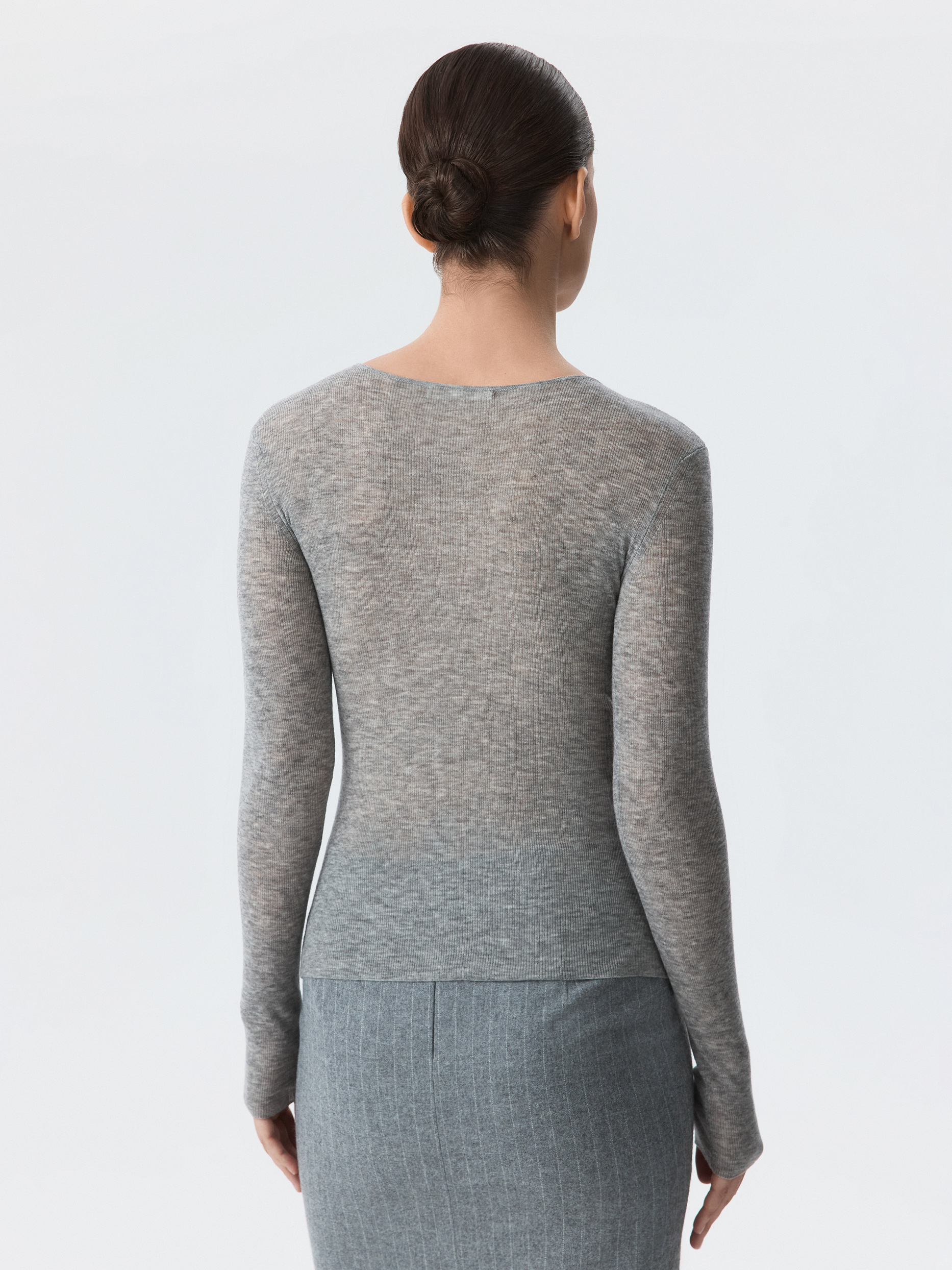 Тонкий джемпер пригодится в любое время года. Полупрозрачный трикотаж из натуральной шерсти в рубчик мягко прилегает и не колется, деликатно согревая. V-вырез на запах создает современный акцент.