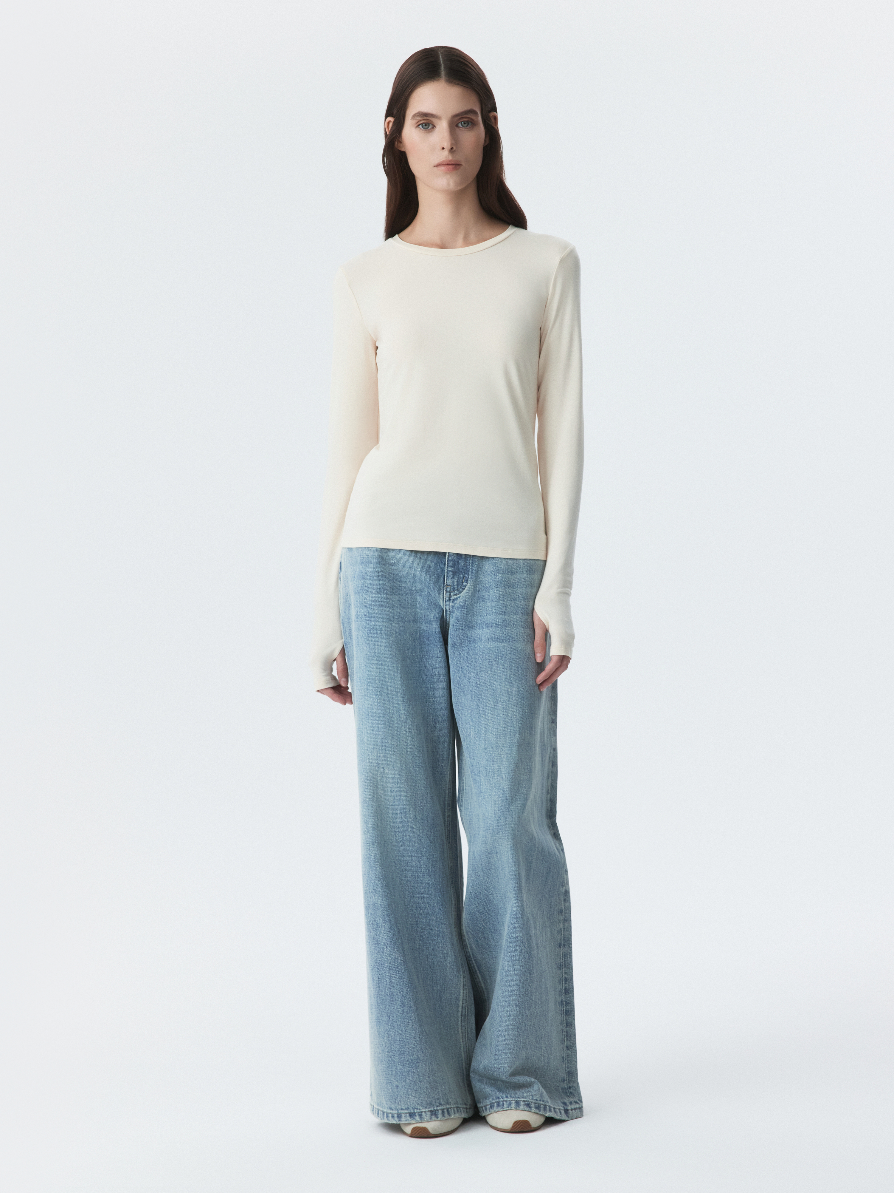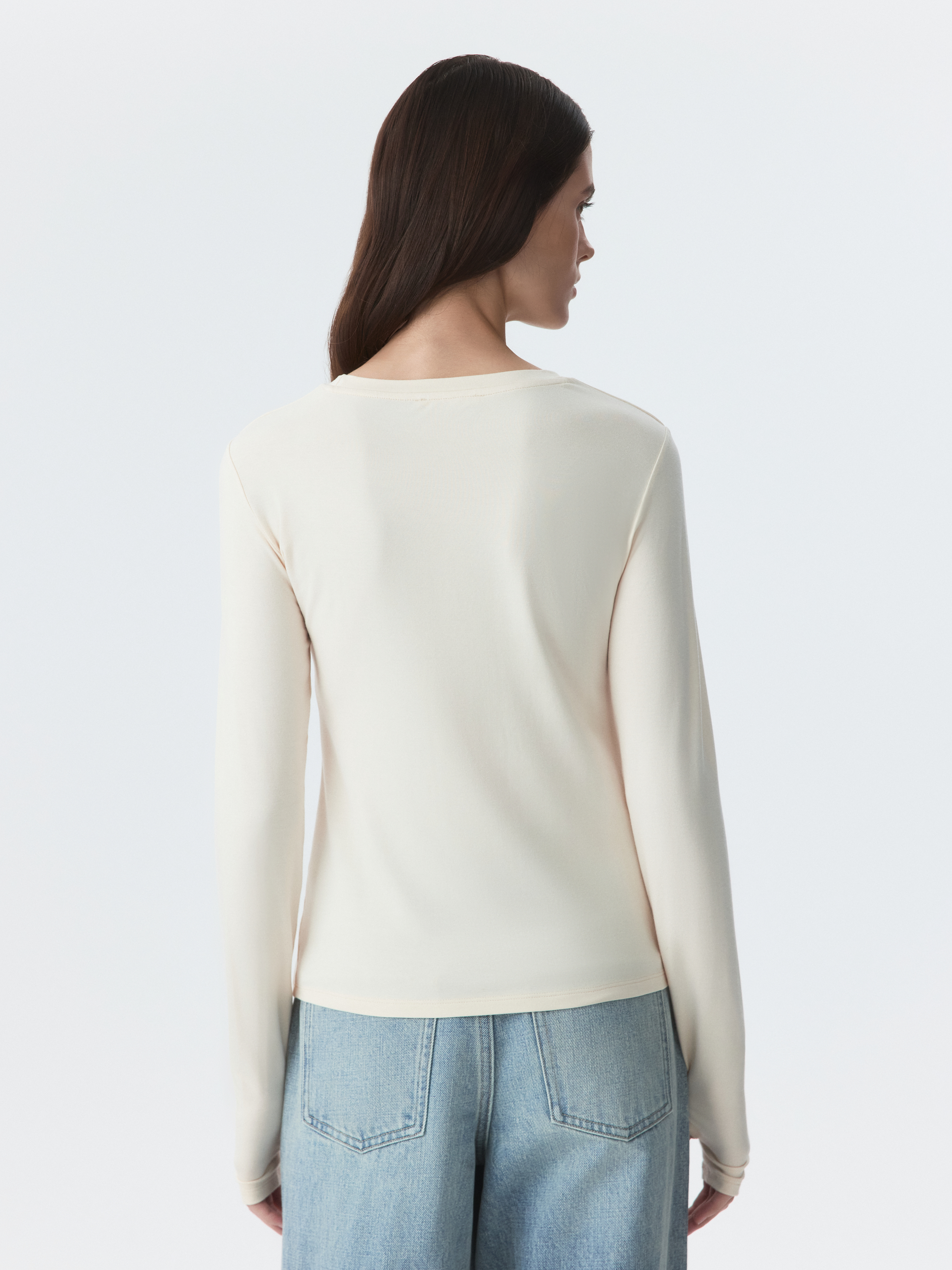 Тонкий базовый лонгслив почти невесомый и совершенно не ощущается на теле. Гладкий трикотаж на основе вискозы с эффектом лайкры хорошо тянется и облегает силуэт. Вырез для большого пальца создает комфортную и оптимальную посадку рукава.