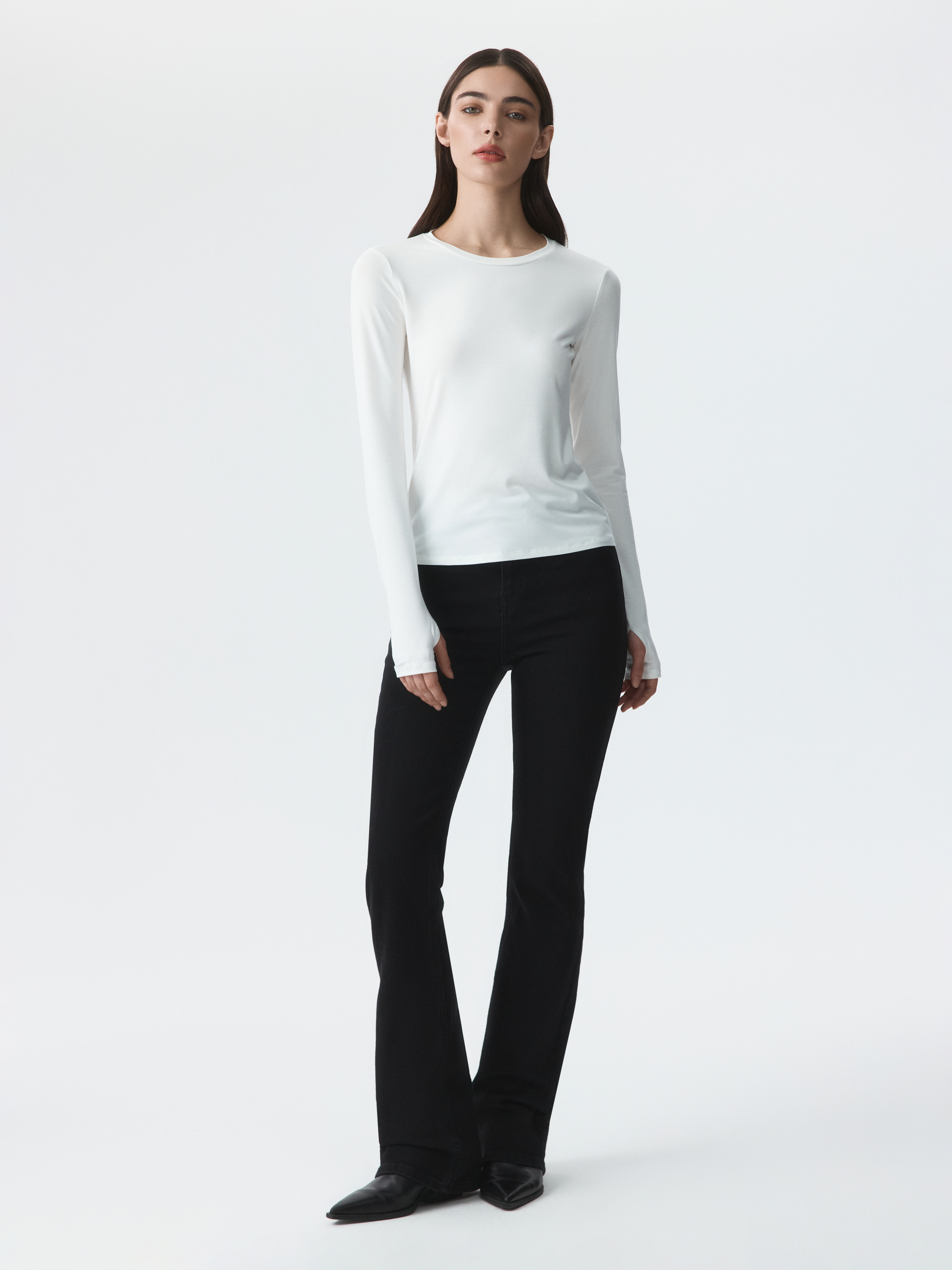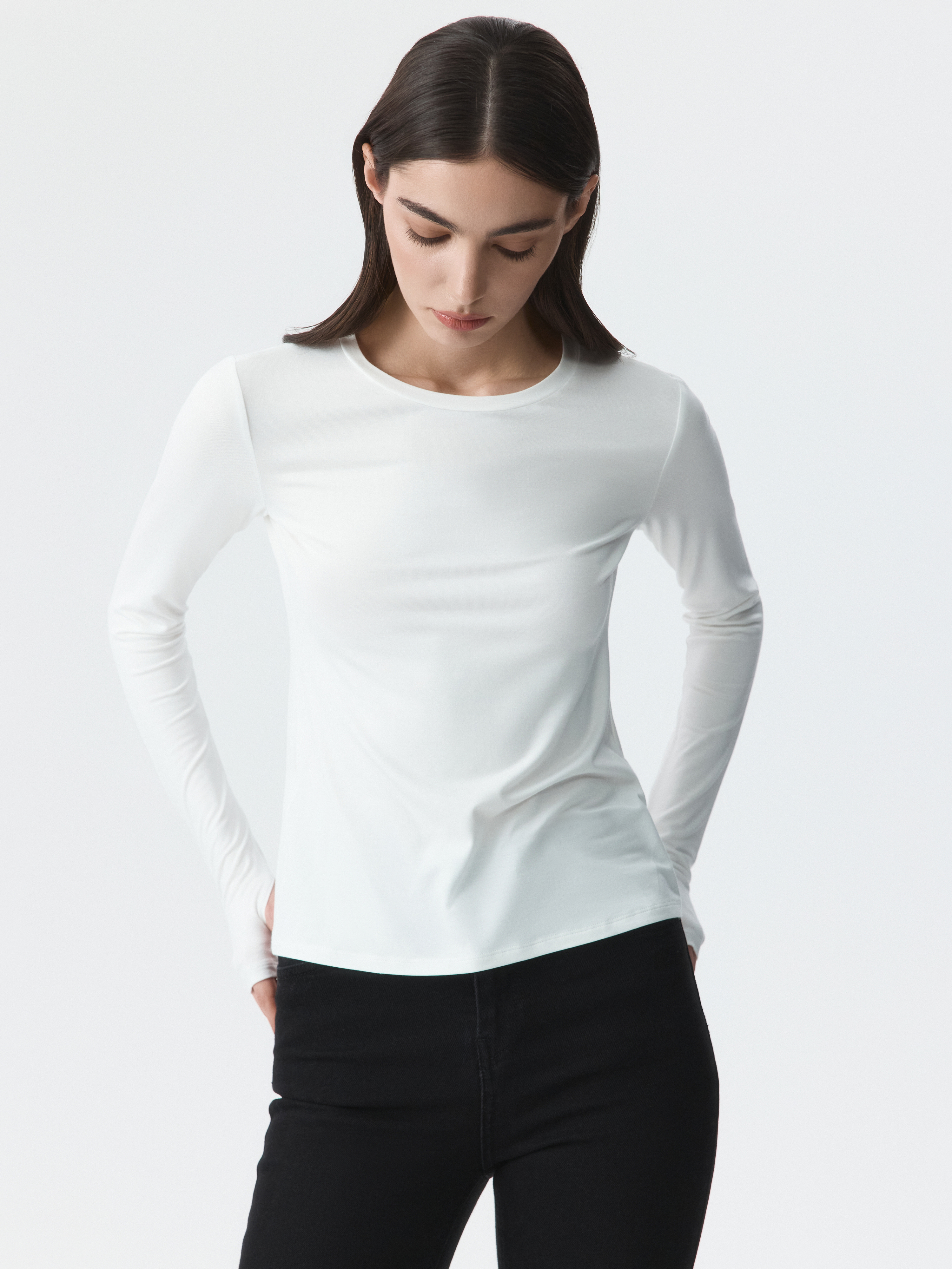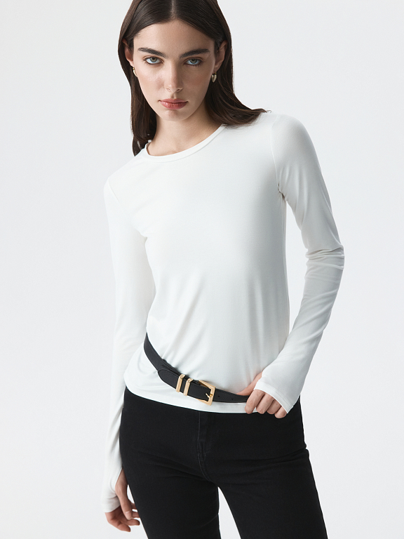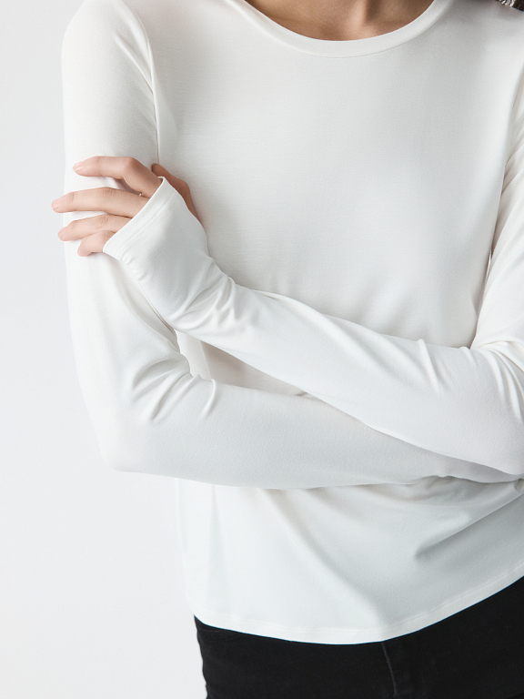 Тонкий базовый лонгслив почти невесомый и совершенно не ощущается на теле. Гладкий трикотаж на основе вискозы с эффектом лайкры хорошо тянется и облегает силуэт. Вырез для большого пальца создает комфортную и оптимальную посадку рукава.