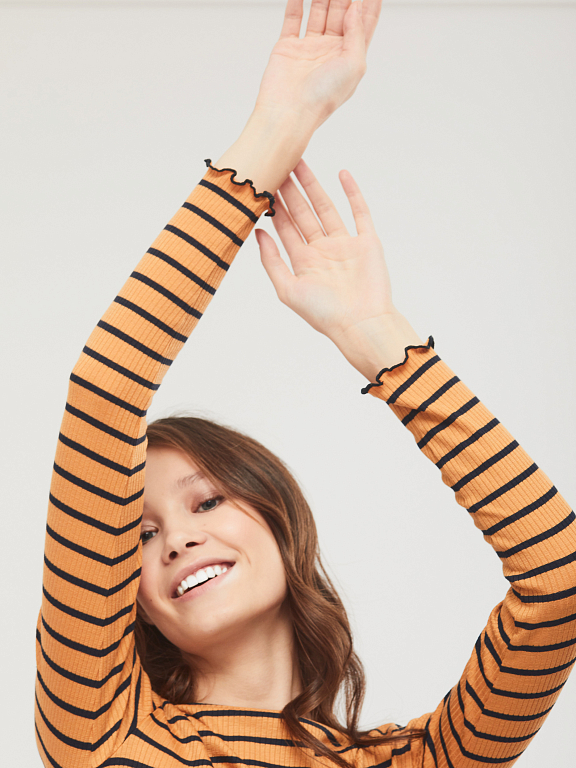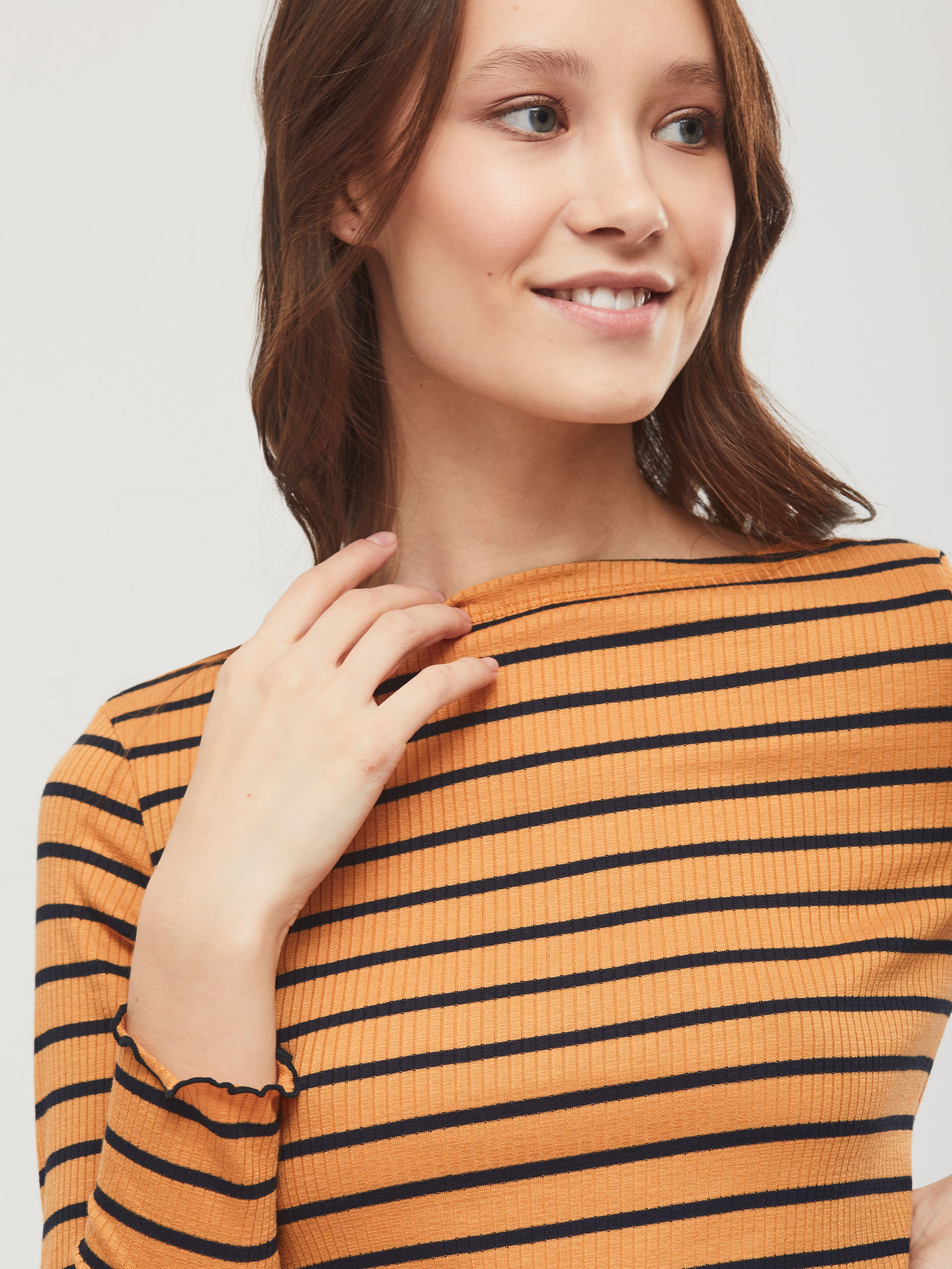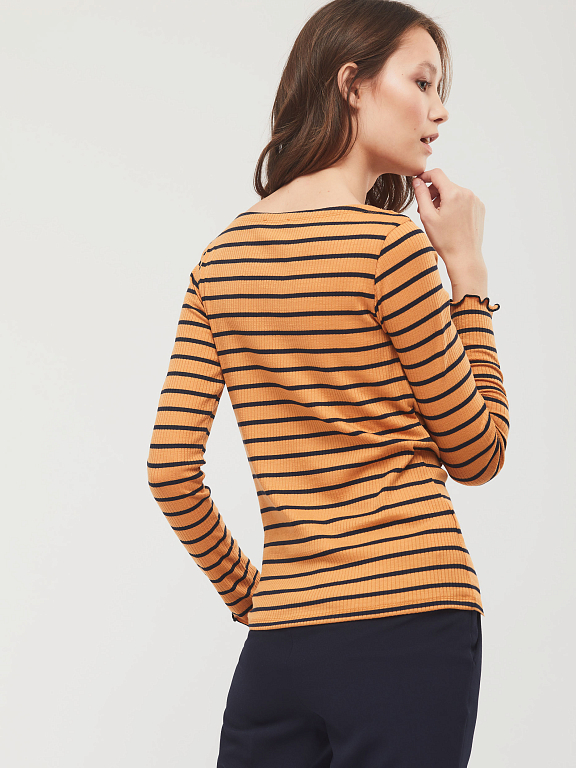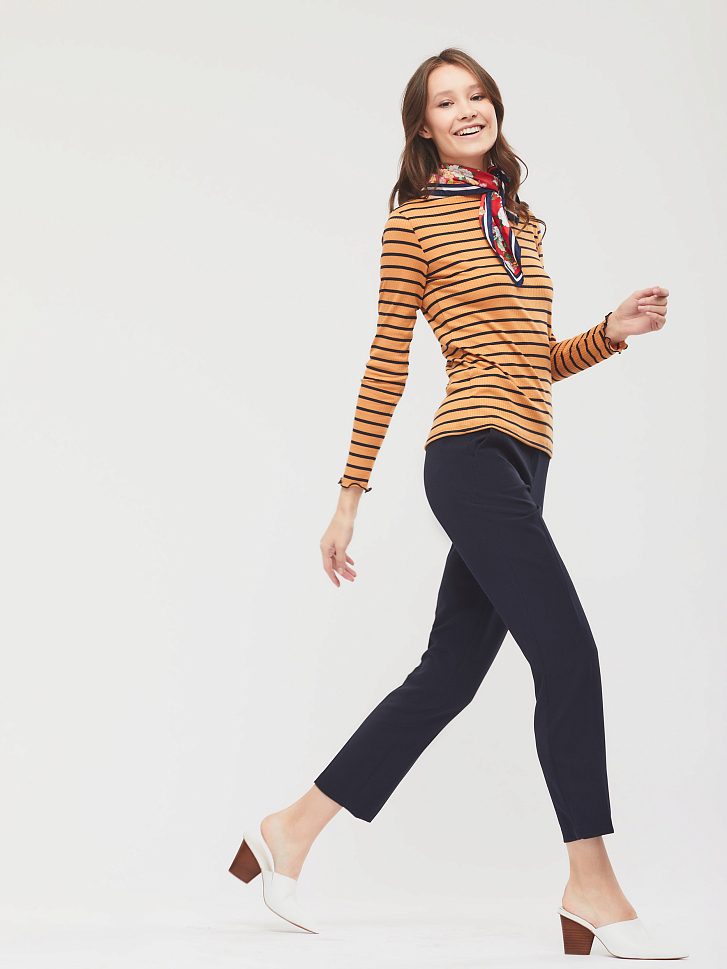 Джемпер в полоску из поливискозы облегающего силуэта. Вырез горловины "лодочка", длинные рукава. Изделие без подкладки. Рост модели 173 см, размер 42 (российский). Плотность ткани: 200 г/м2
