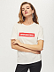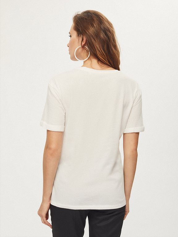 Свободная футболка, выполненная из смесового хлопка. Надпись, округлый вырез, рукава с отворотами.
