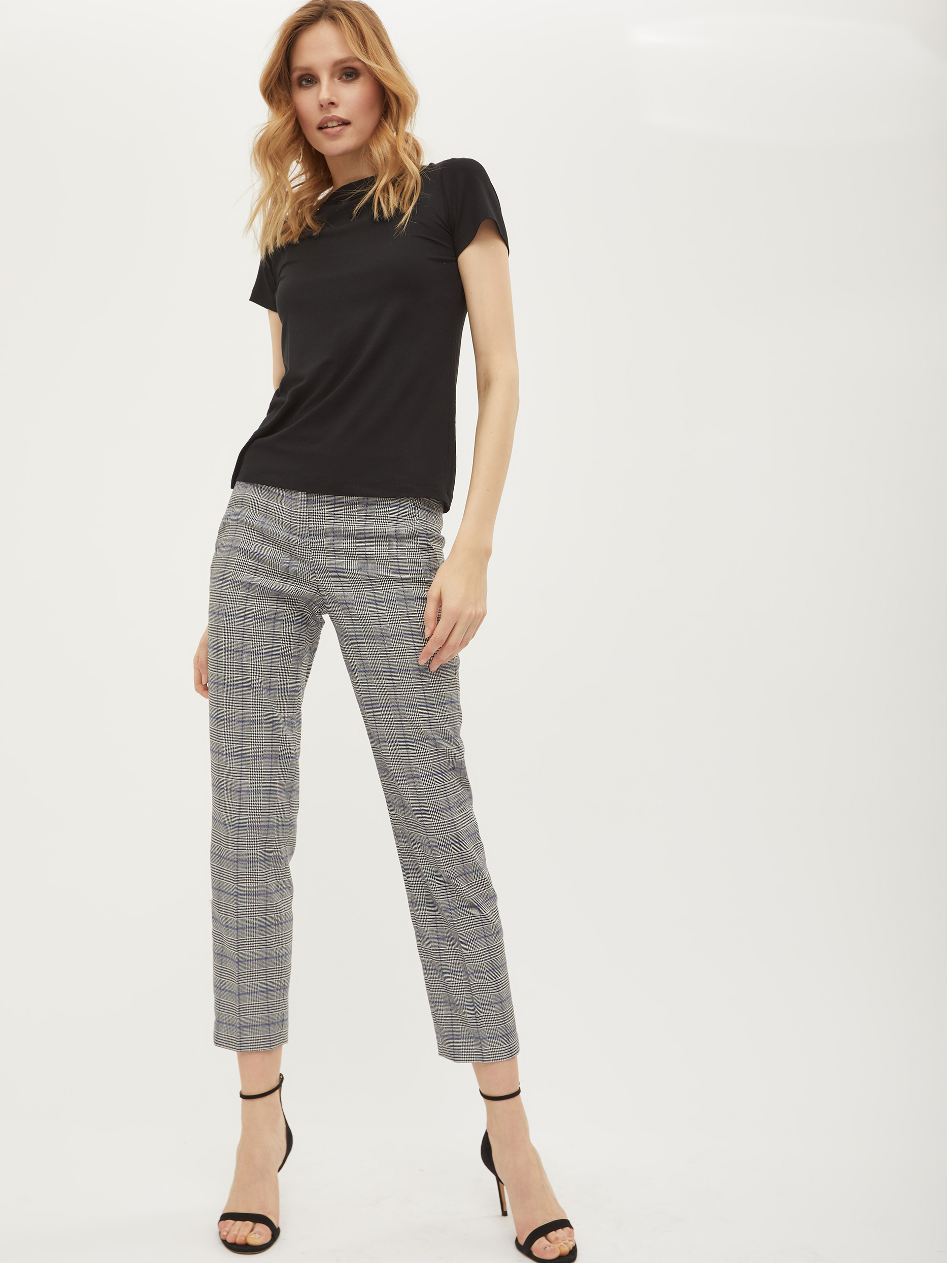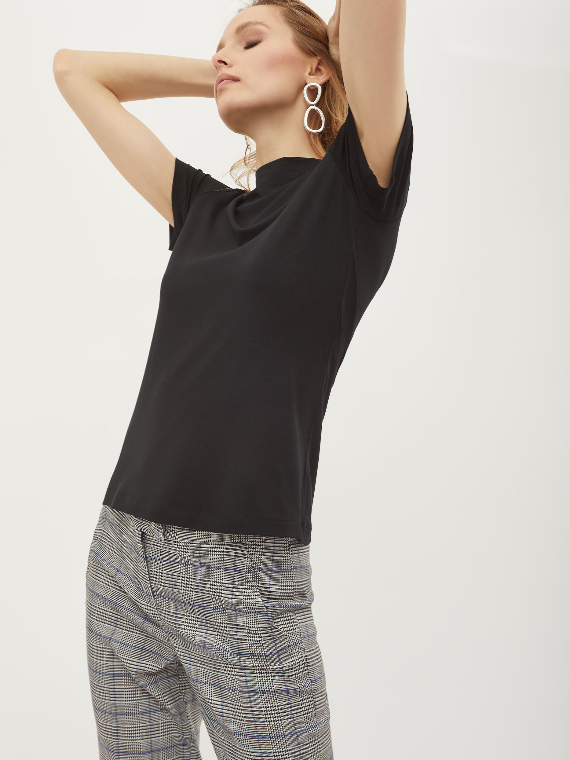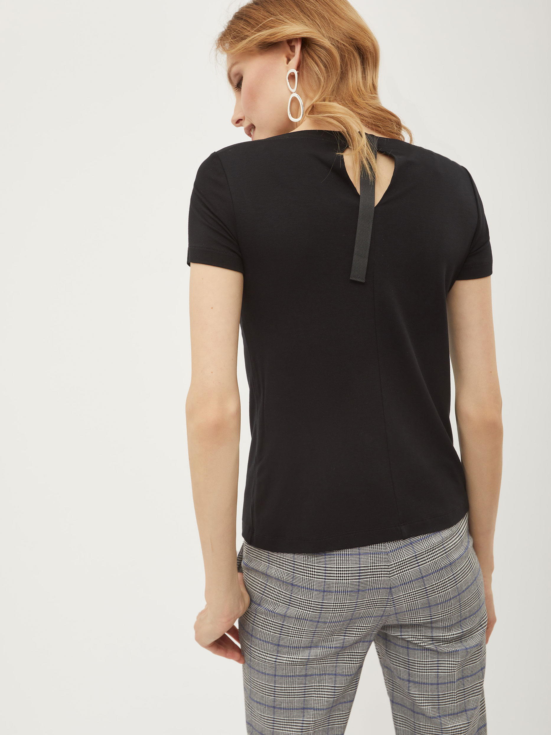 Футболка приталенного кроя. Вырез-стойка, контрастный ремешок в качестве застежки сзади на шее.