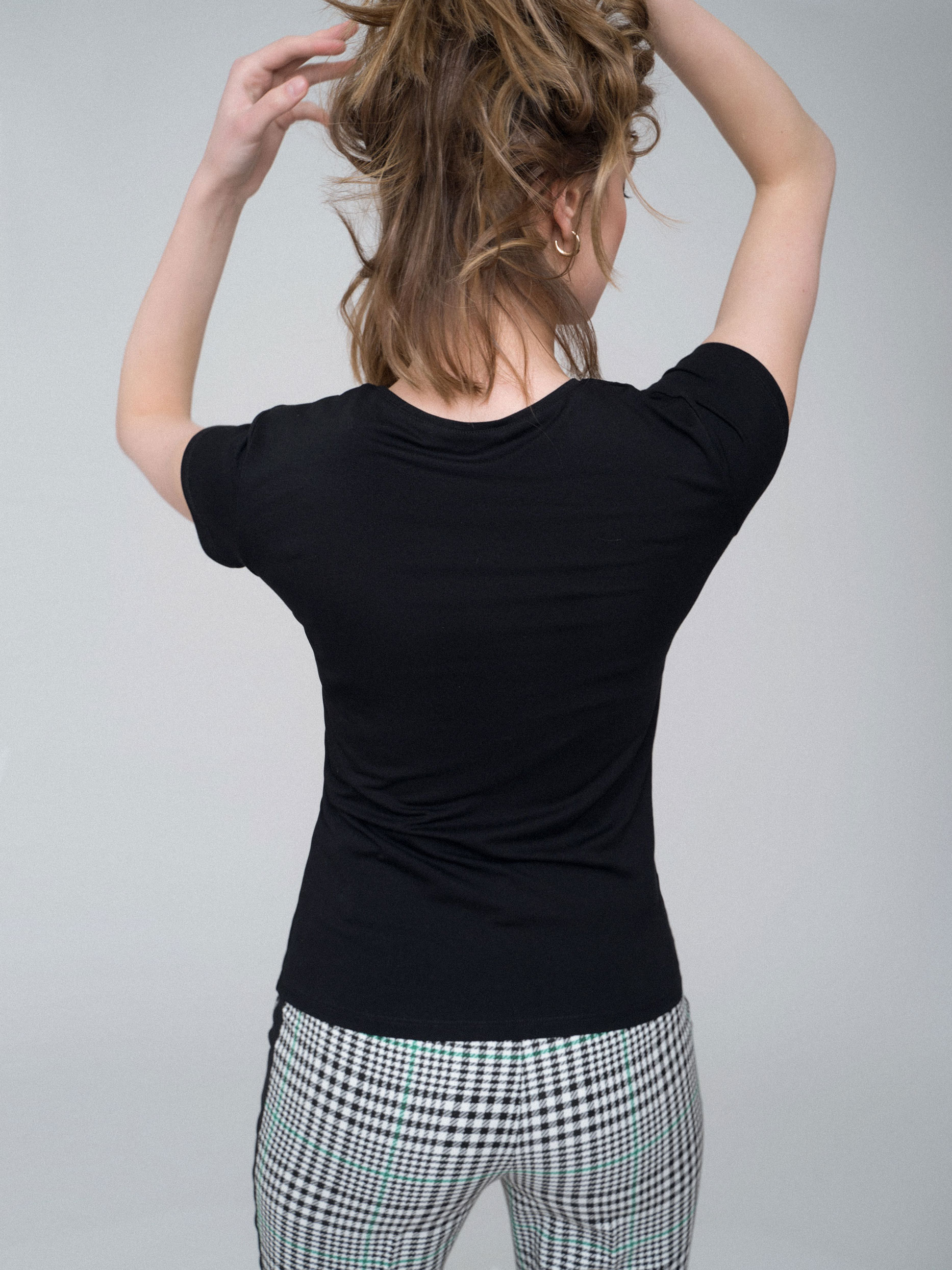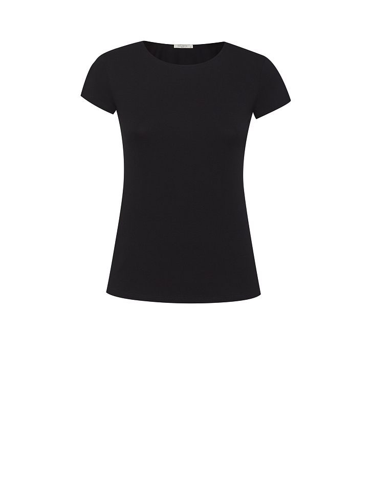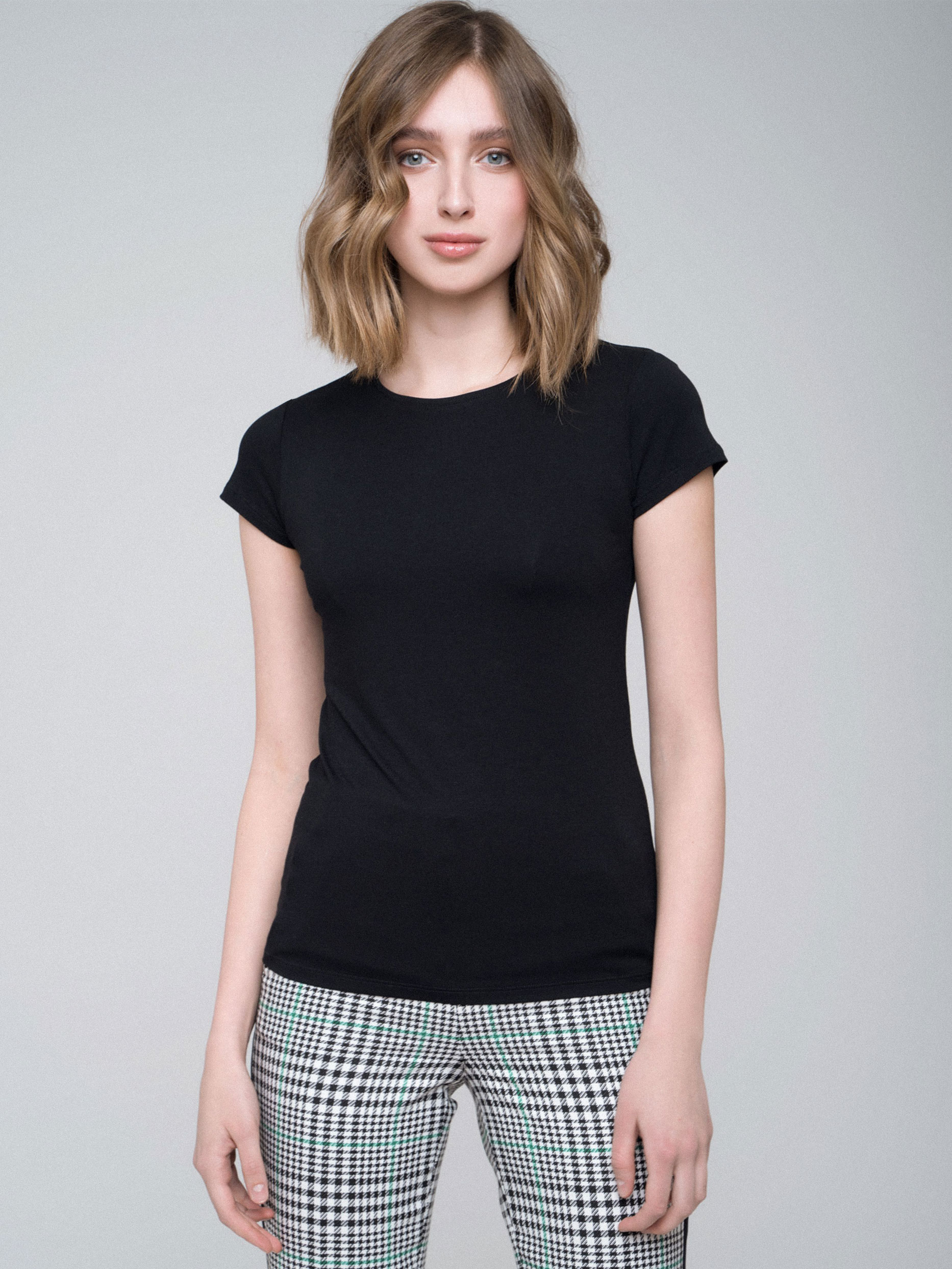 Футболка облегающего кроя. Округлый вырез, короткие отрезные рукава.