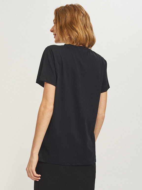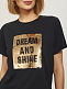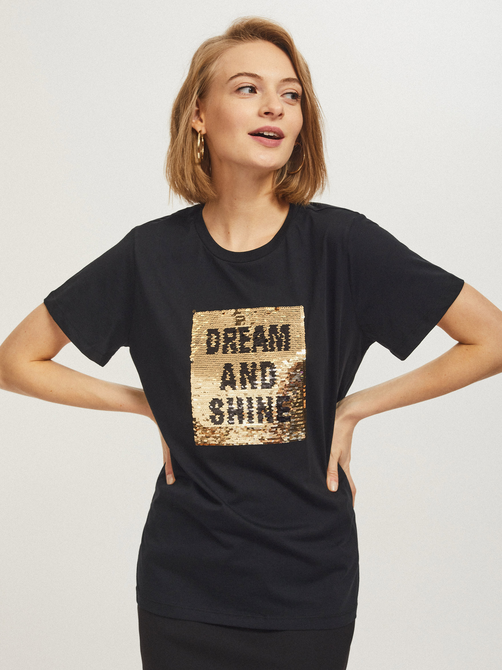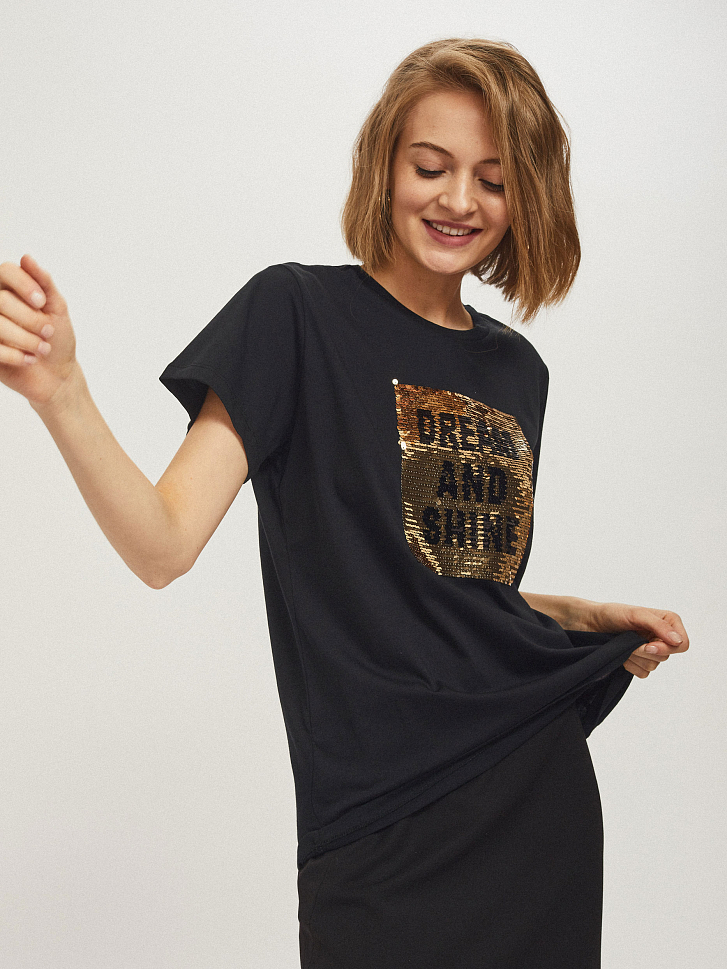 Футболка свободного силуэта, выполненная из 100% хлопка. Округлый вырез, надпись, выполненная из пайеток.