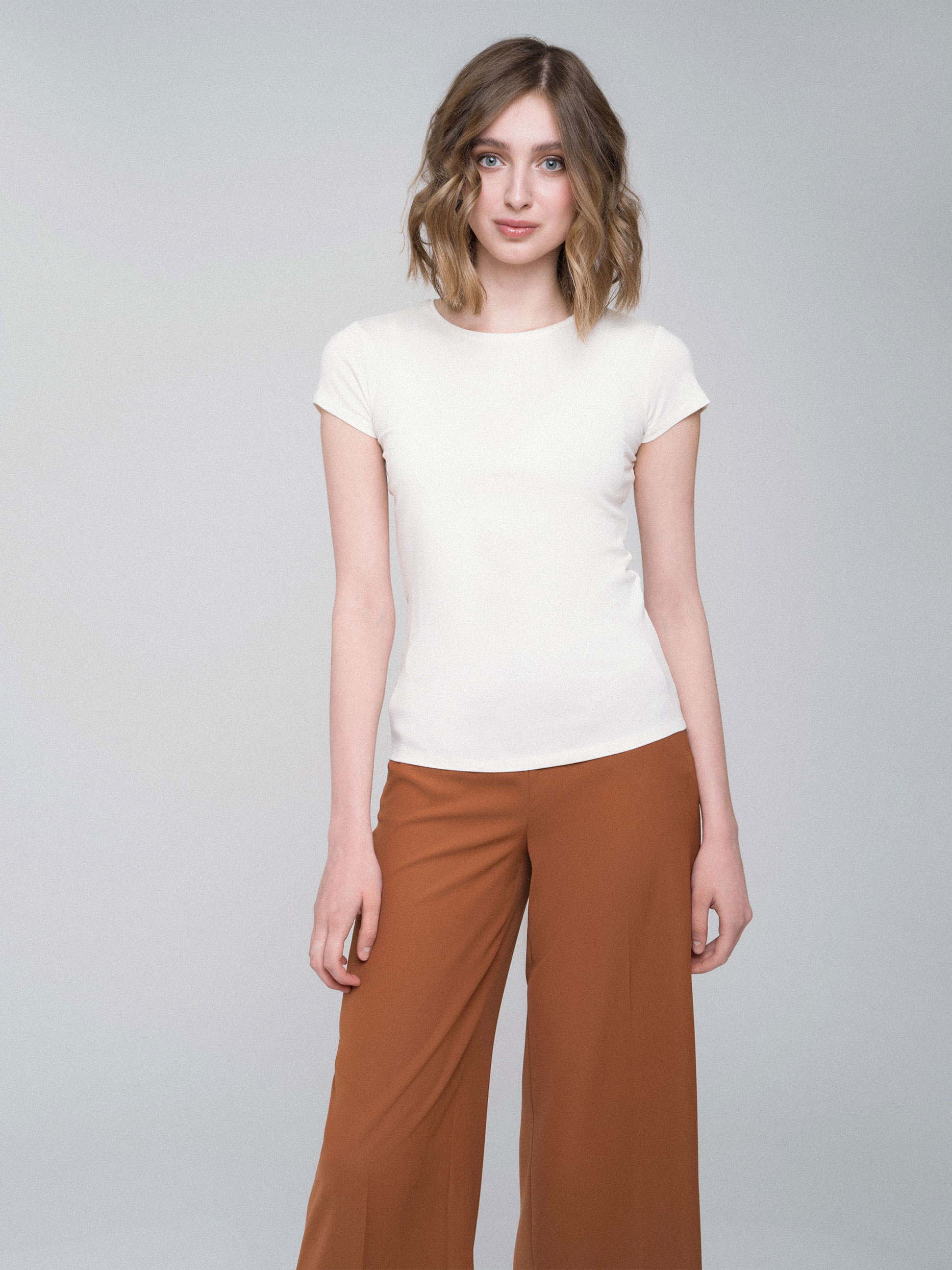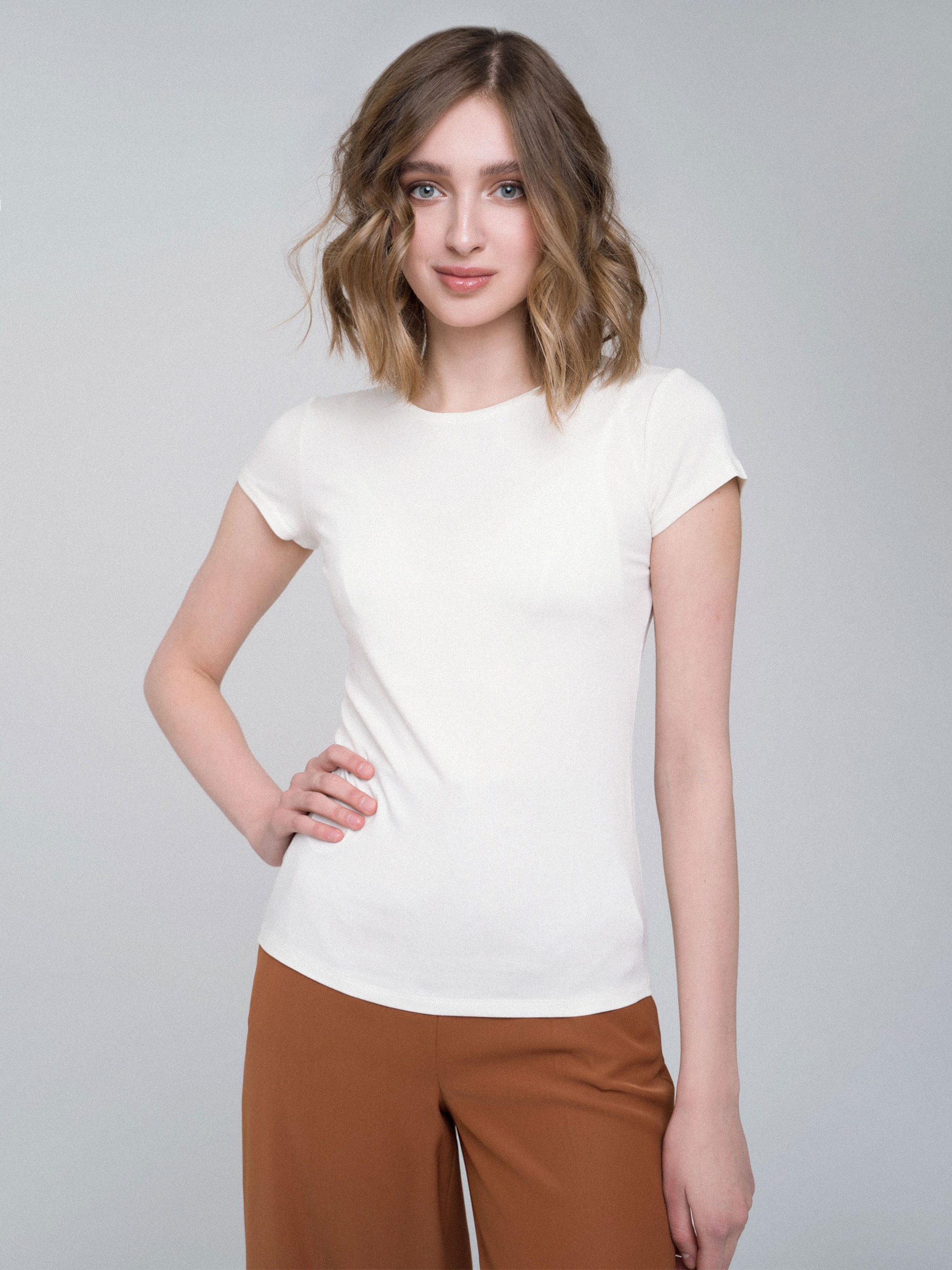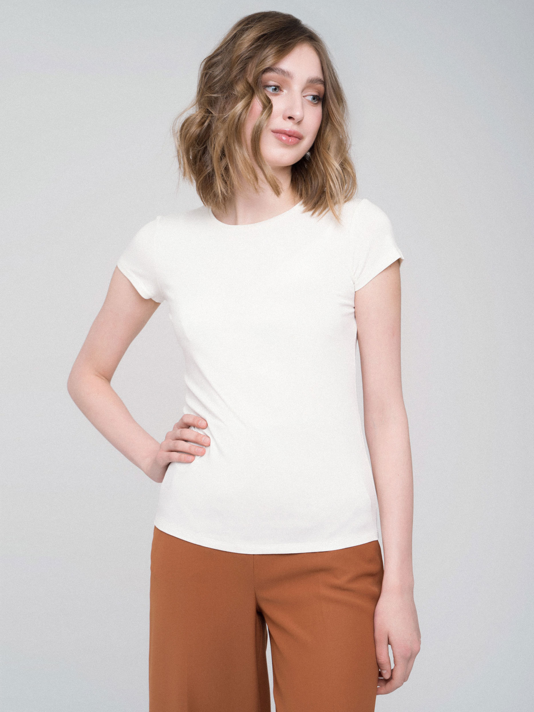 Футболка облегающего кроя. Округлый вырез, короткие отрезные рукава.