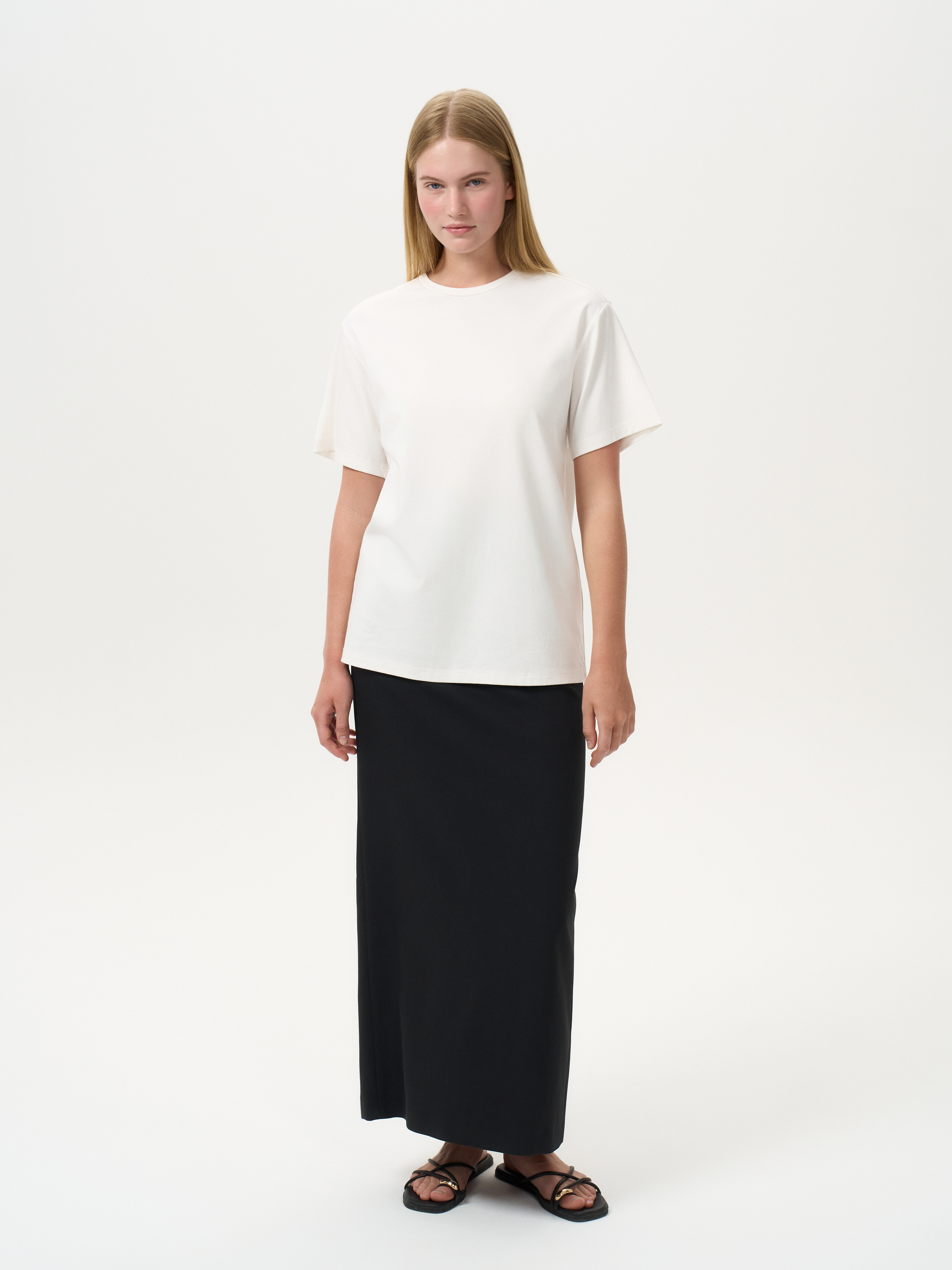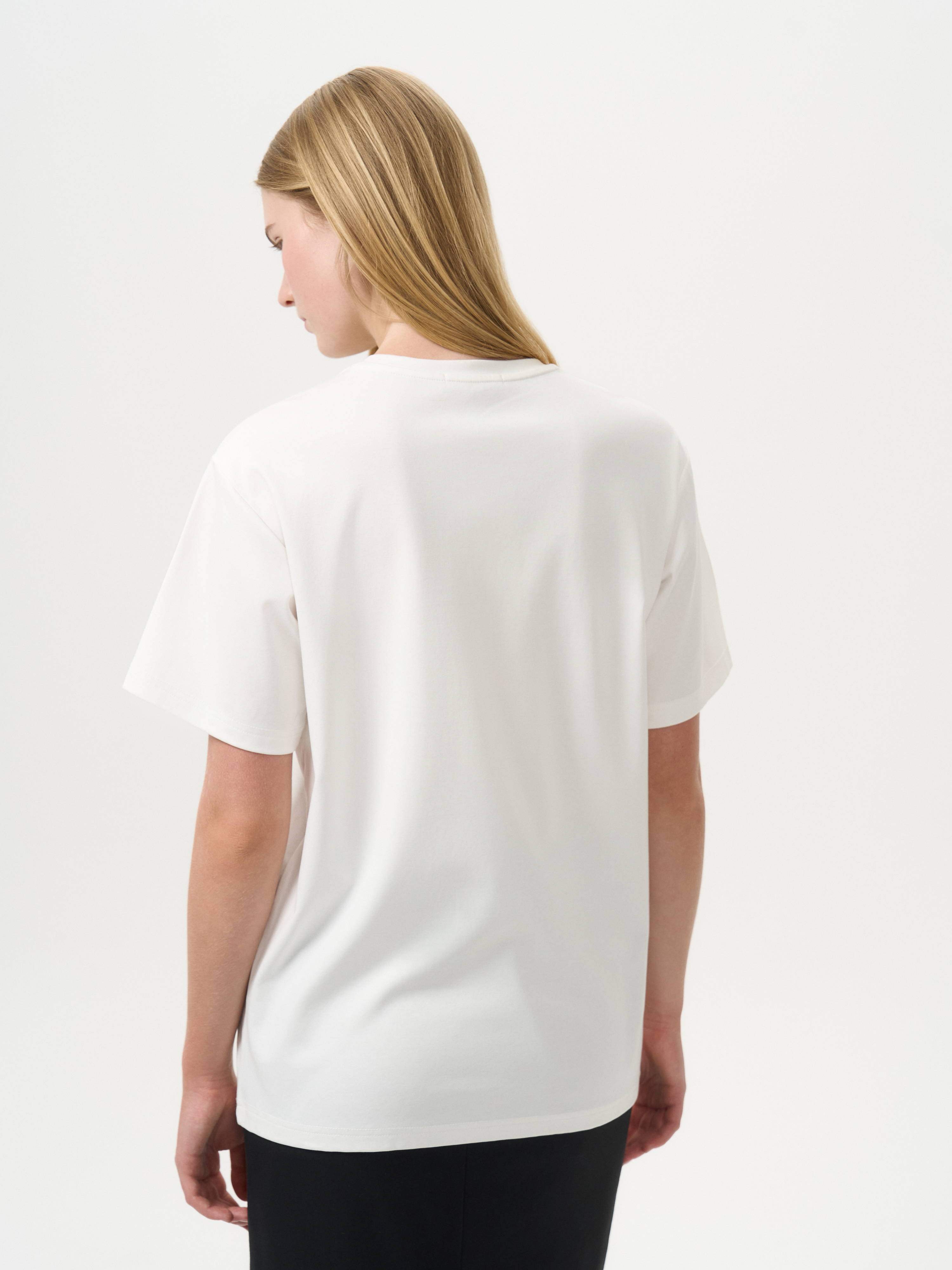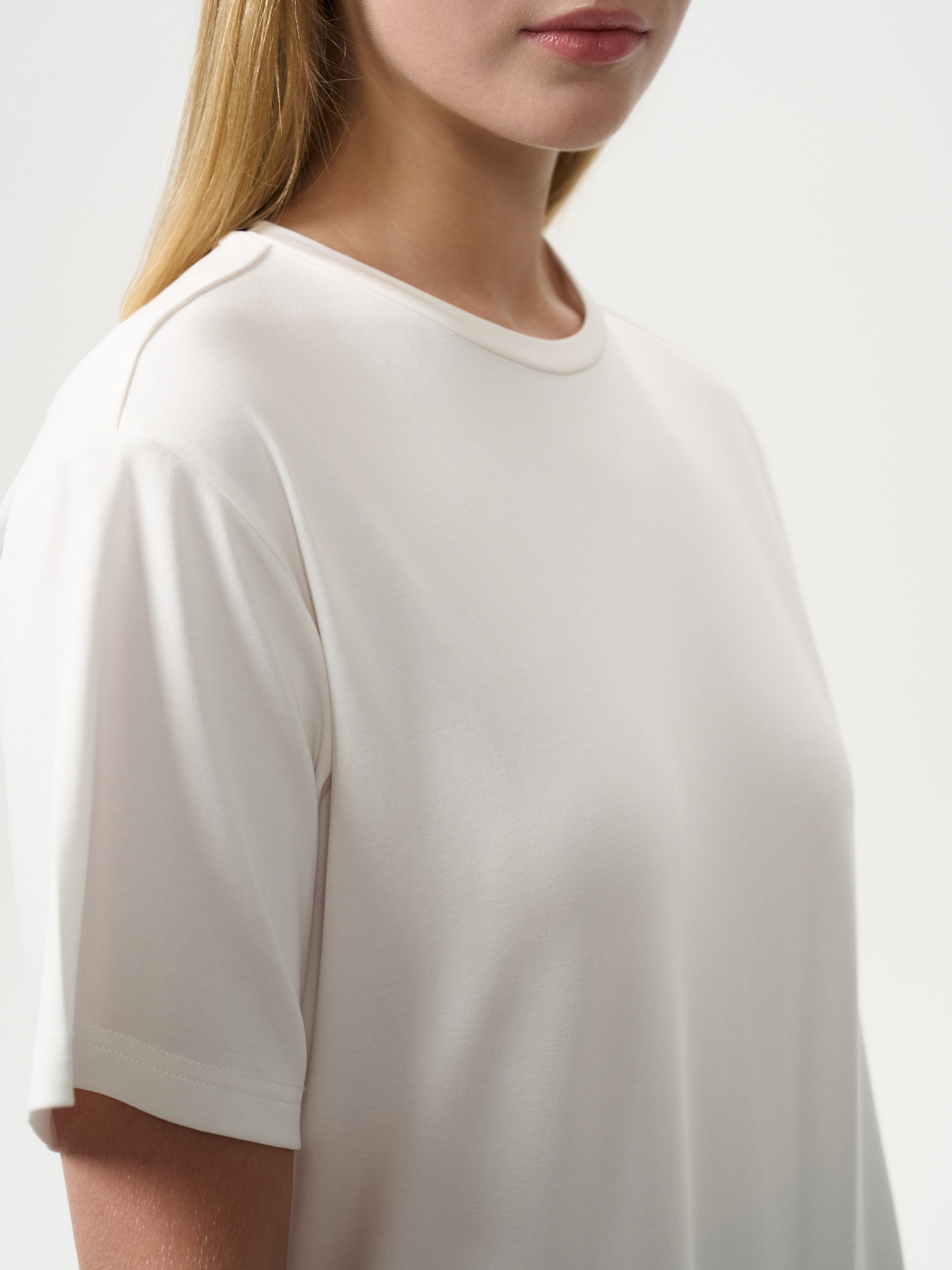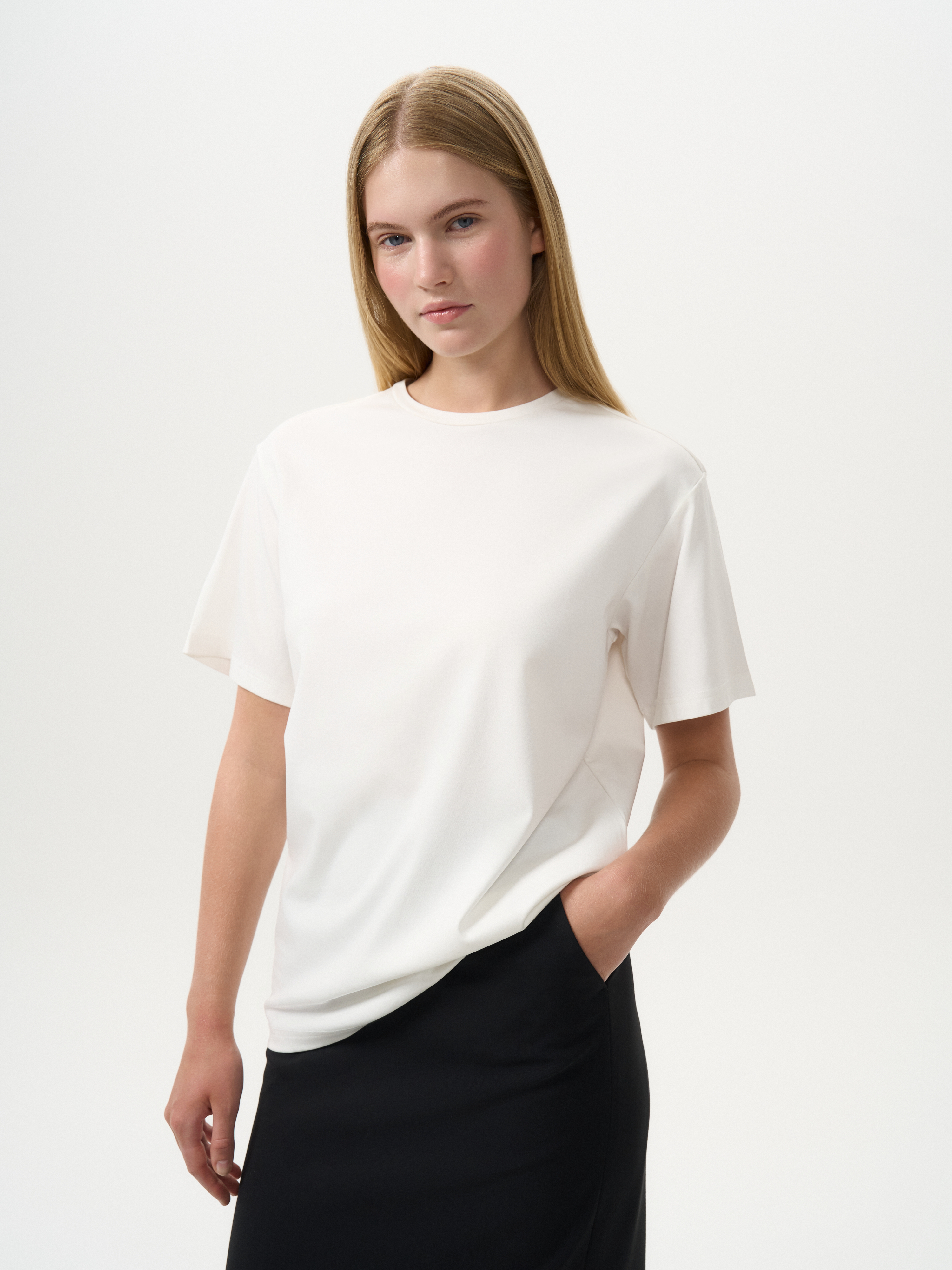 Прямая однотонная футболка – база, которая сочетается с любым стилем. Тонкий хлопковый трикотаж мягко прилегает к телу и дарит комфорт, а благодаря эластичным волокнам не вытягивается и долго сохраняет форму. Лаконичная модель без декора подчеркивает чистоту линий.