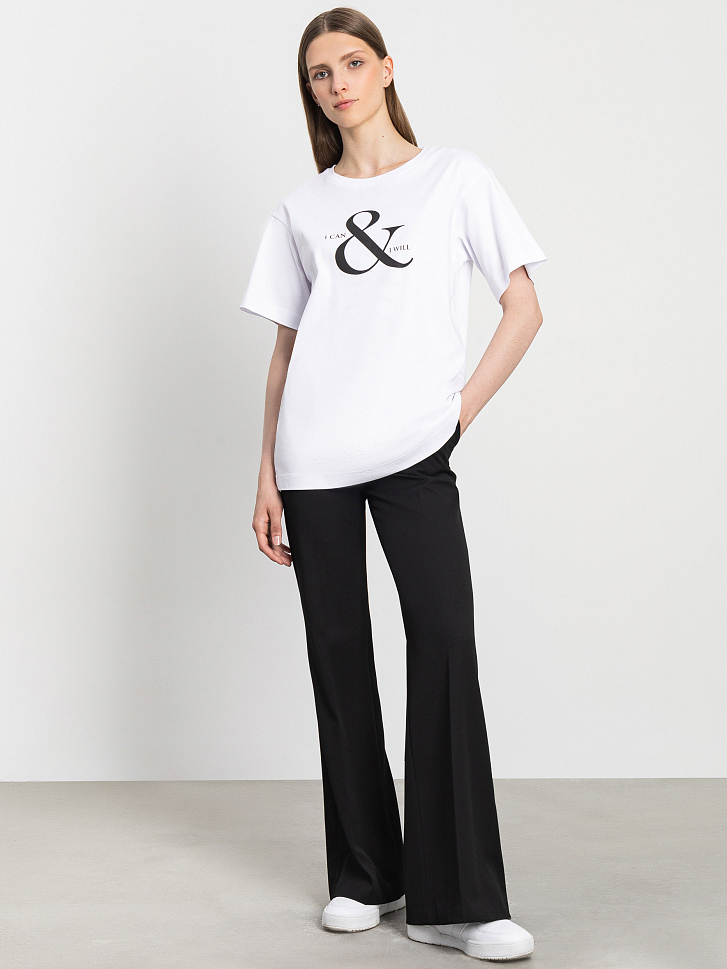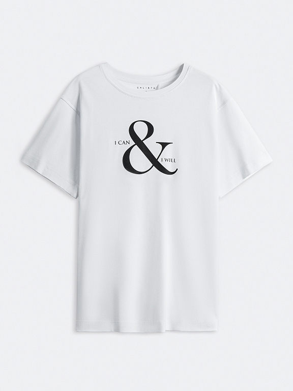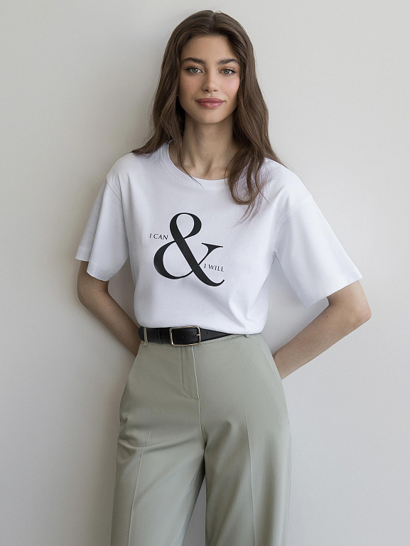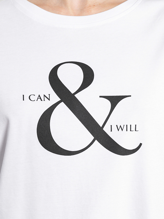 Свободную белую футболку украсили контрастной надписью «I can and I will» (я могу и я это сделаю). Модель с удлиненными рукавами легко впишется в любой неформальный образ. Изделие выполнено из легкого дышащего хлопка.