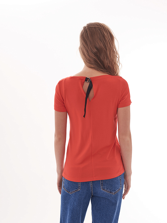 Футболка приталенного кроя. Вырез-стойка, контрастный ремешок в качестве застежки сзади на шее.