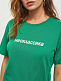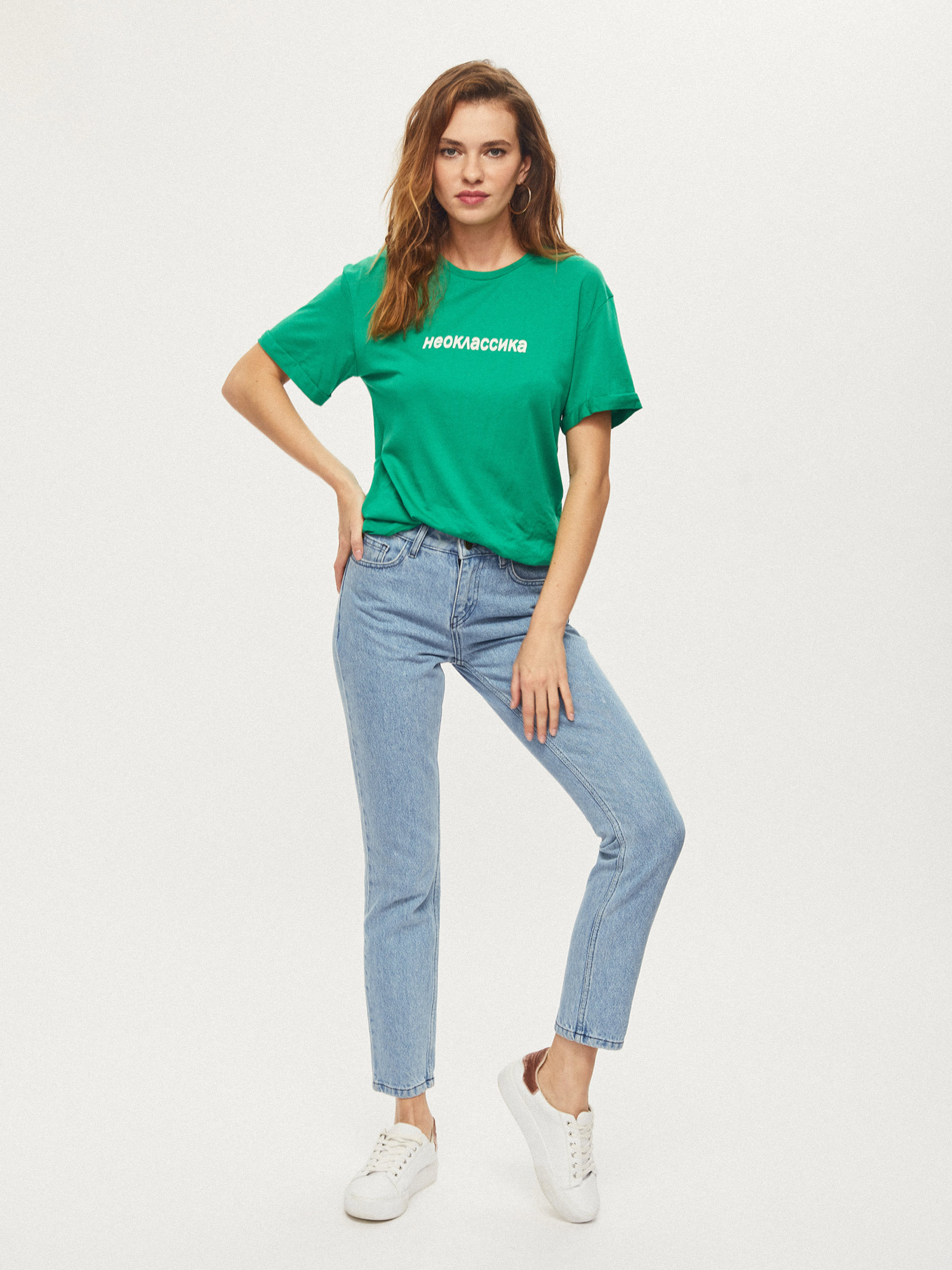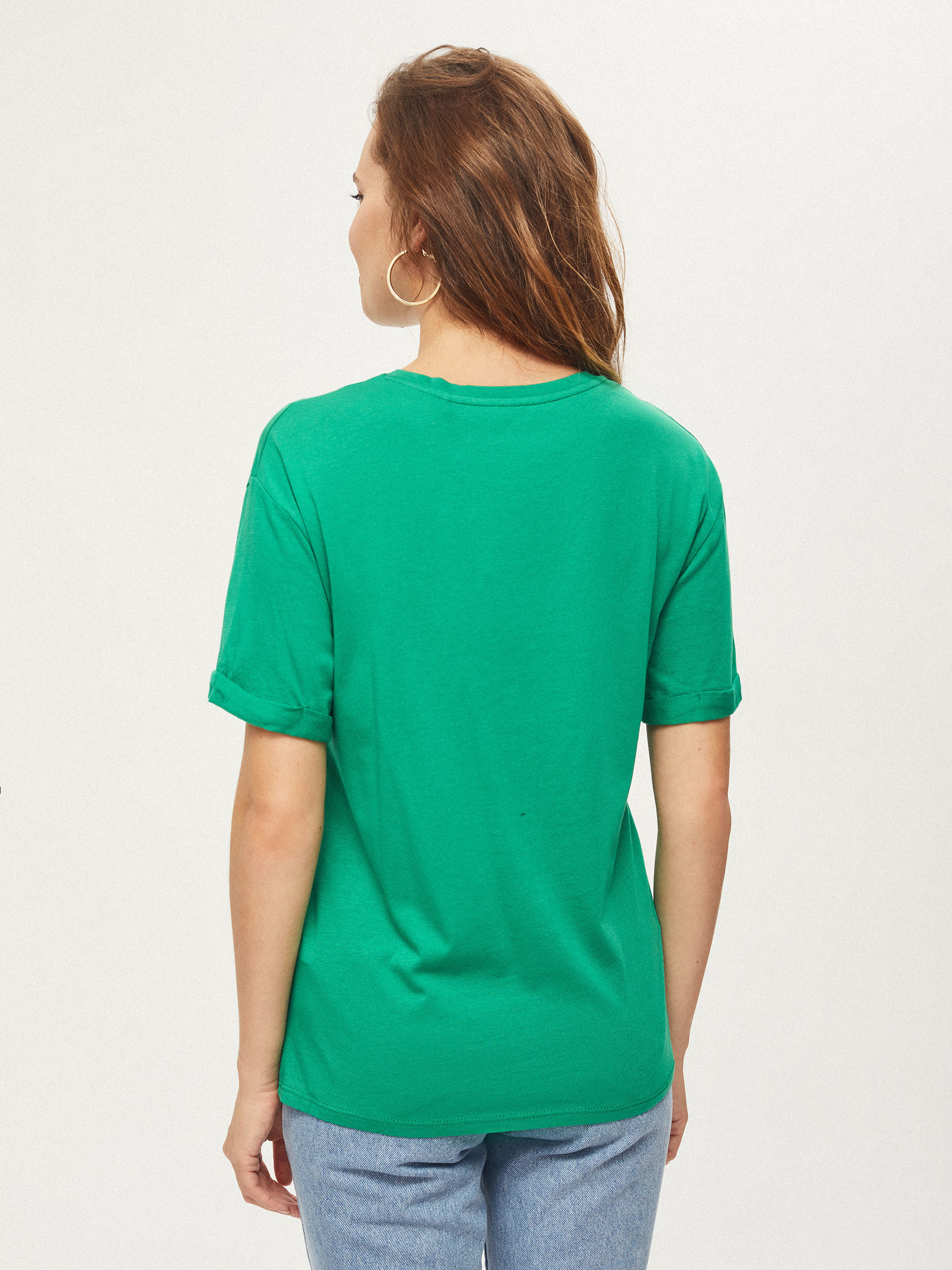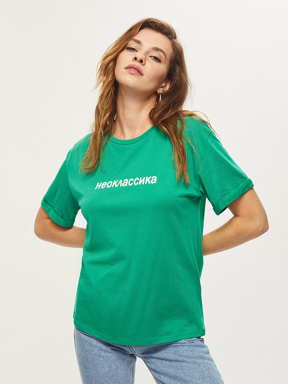 Свободная футболка, выполненная из смесового хлопка. Надпись, округлый вырез, рукава с отворотами.