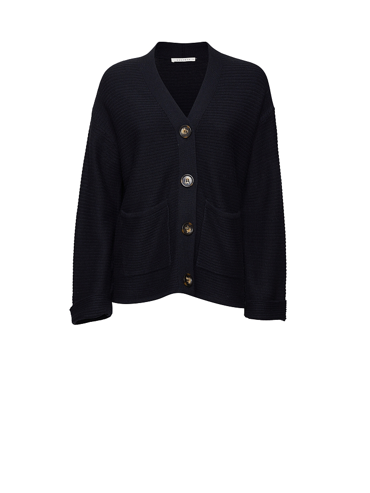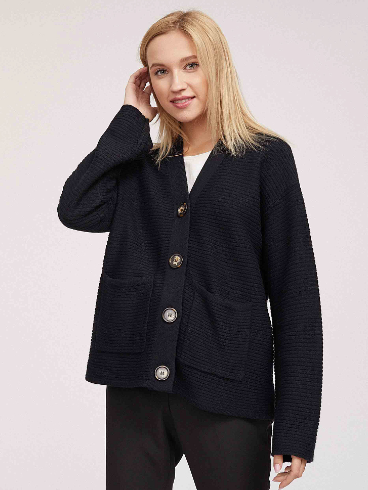 Кардиган английской вязки, выполненный из смесовой шерсти с добавлением кашемира. Округлый вырез, свободный силуэт, накладные карманы, спущенная линия плеч. Застегивается на крупные пуговицы.