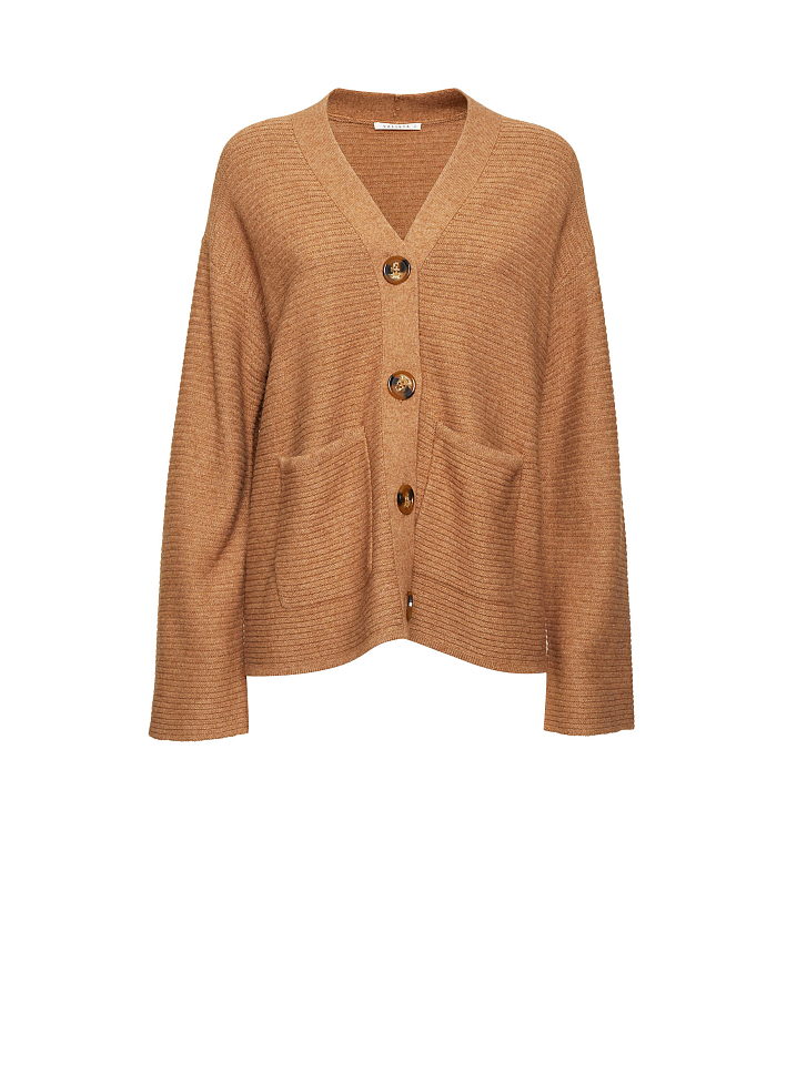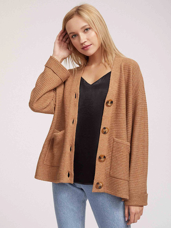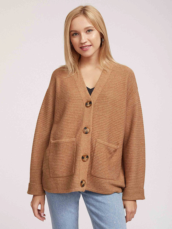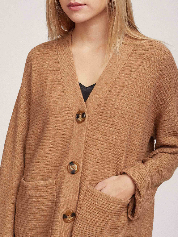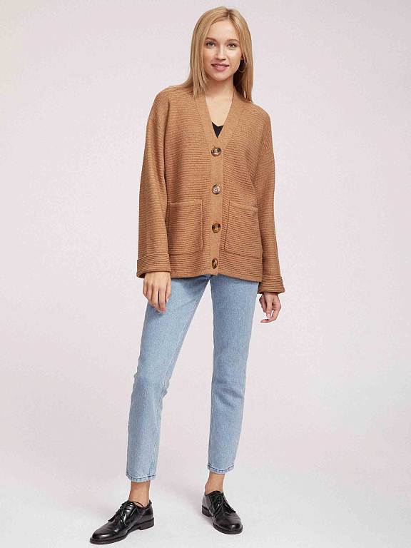 Кардиган английской вязки, выполненный из смесовой шерсти с добавлением кашемира. Округлый вырез, свободный силуэт, накладные карманы, спущенная линия плеч. Застегивается на крупные пуговицы.