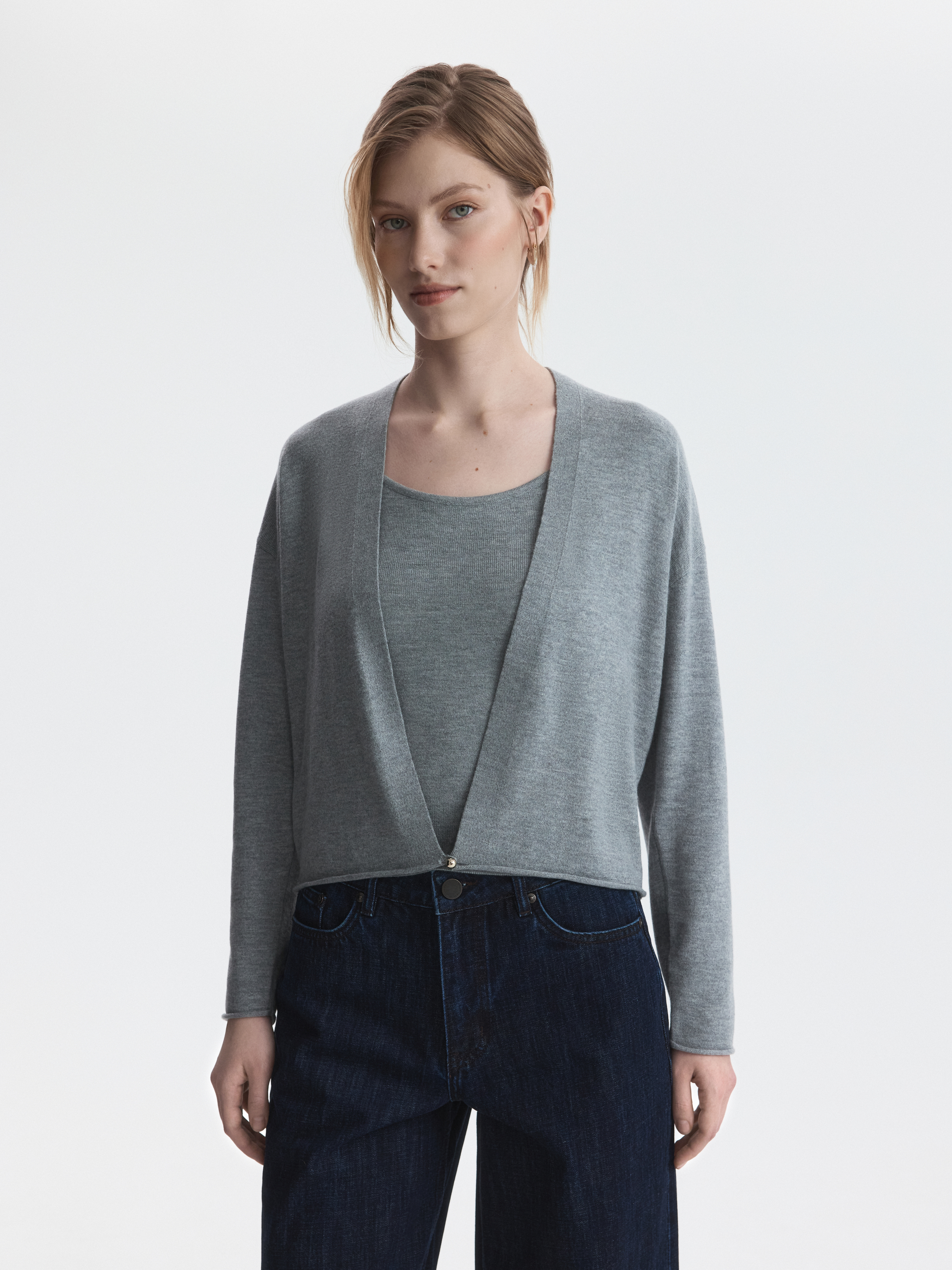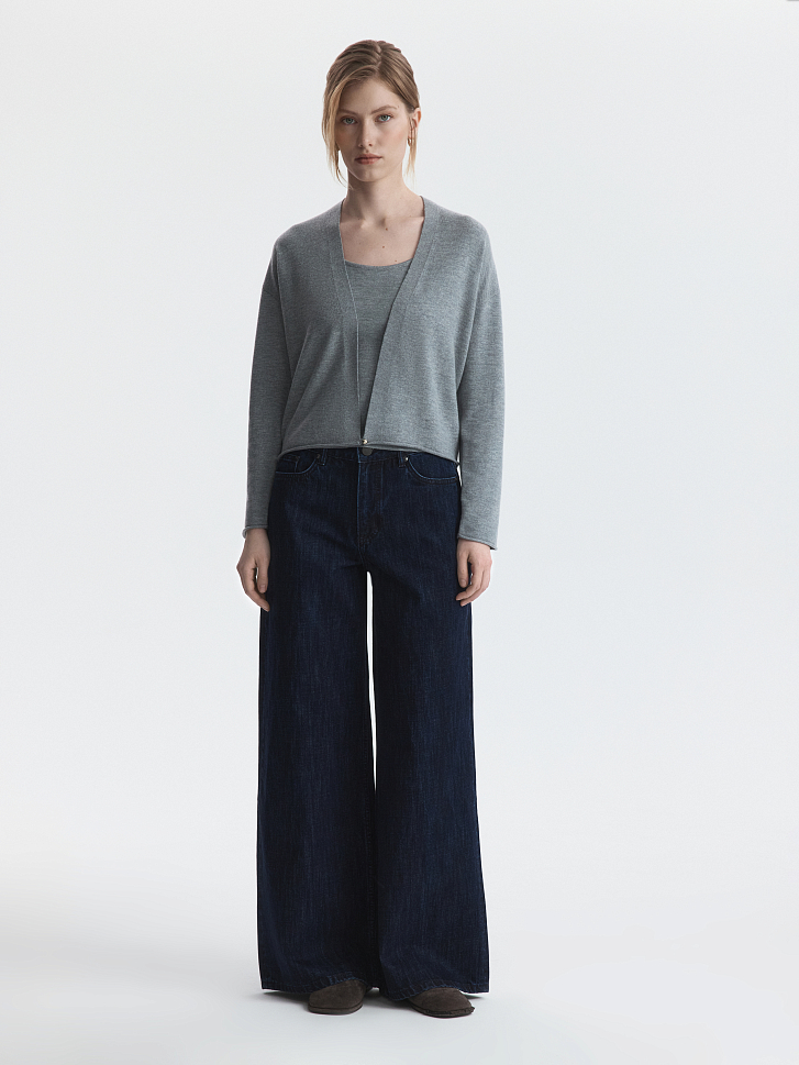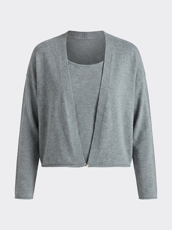 Твинсет из топа на бретелях и кардигана можно носить вместе или по-отдельности. Тонкий гладкий трикотаж с содержанием натуральной шерсти мягко прилегает и не колется, а волокна нейлона придают пластичности. Кардиган свободного кроя расслабленно сидит по фигуре и не сковывает движения.