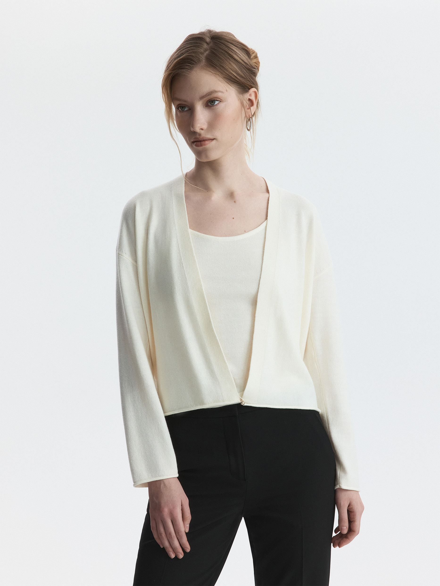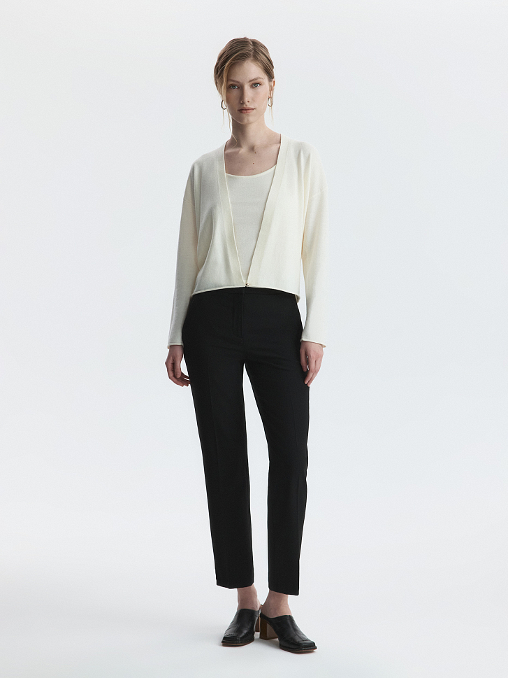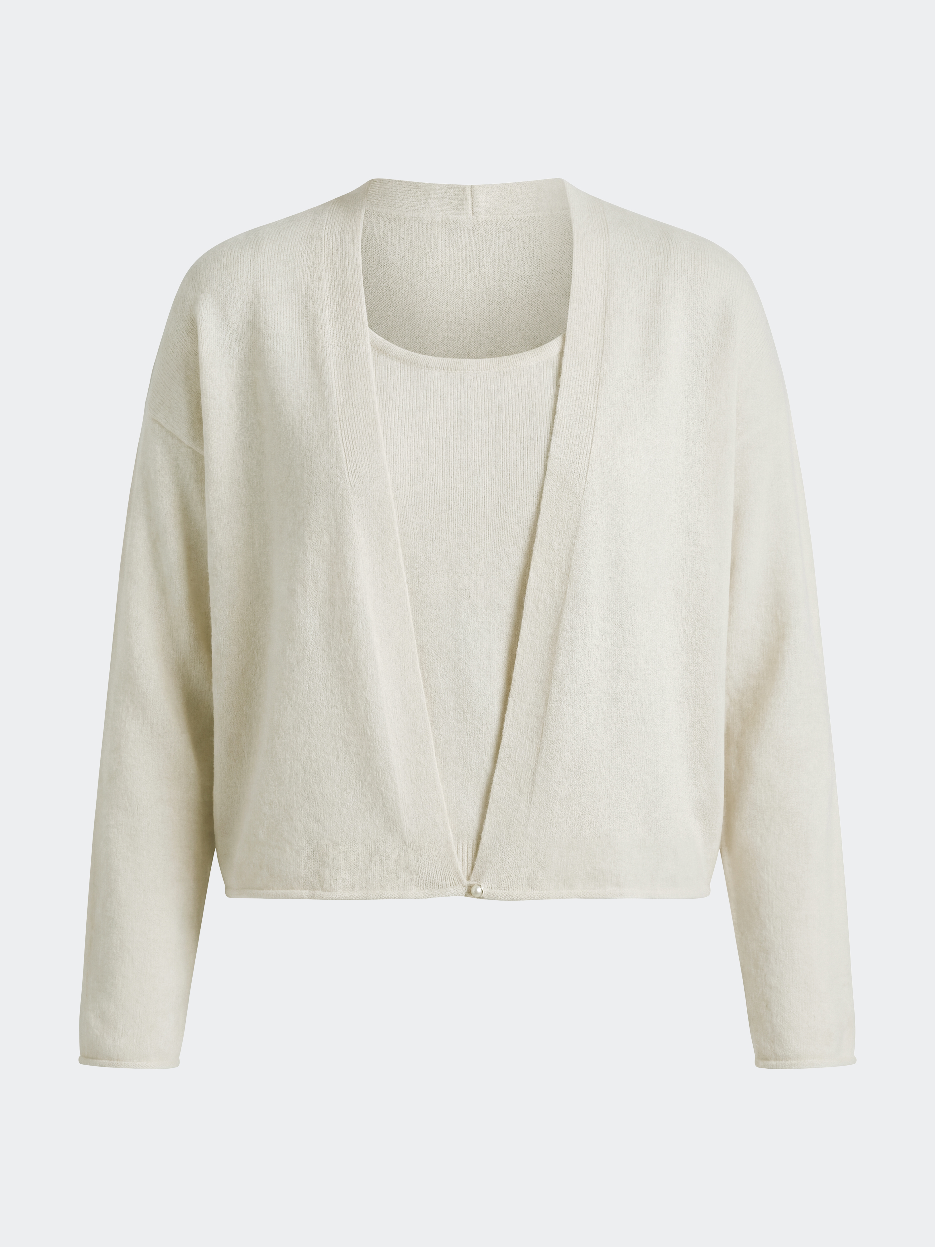 Твинсет из топа на бретелях и кардигана можно носить вместе или по-отдельности. Тонкий гладкий трикотаж с содержанием натуральной шерсти мягко прилегает и не колется, а волокна нейлона придают пластичности. Кардиган свободного кроя расслабленно сидит по фигуре и не сковывает движения.