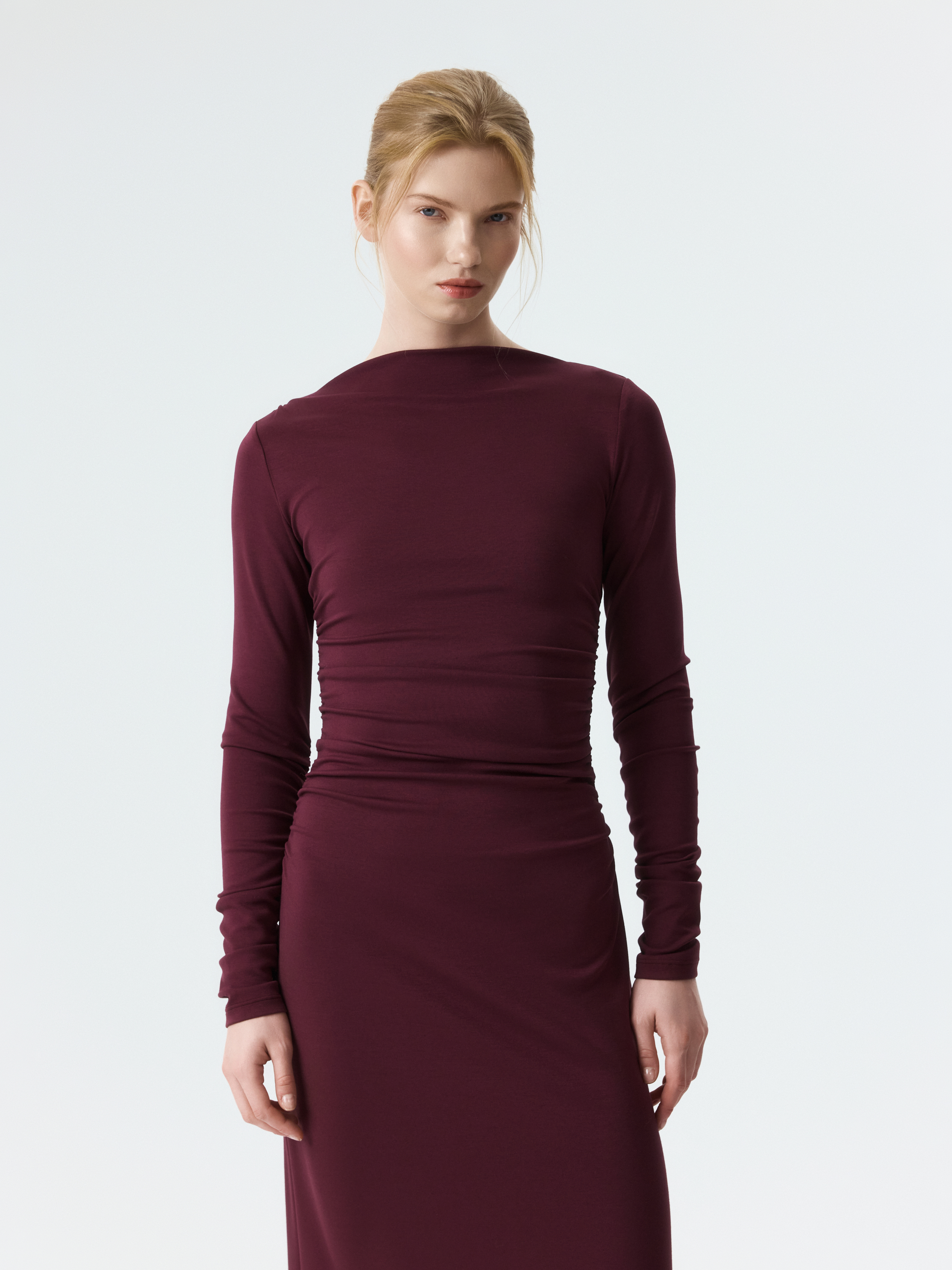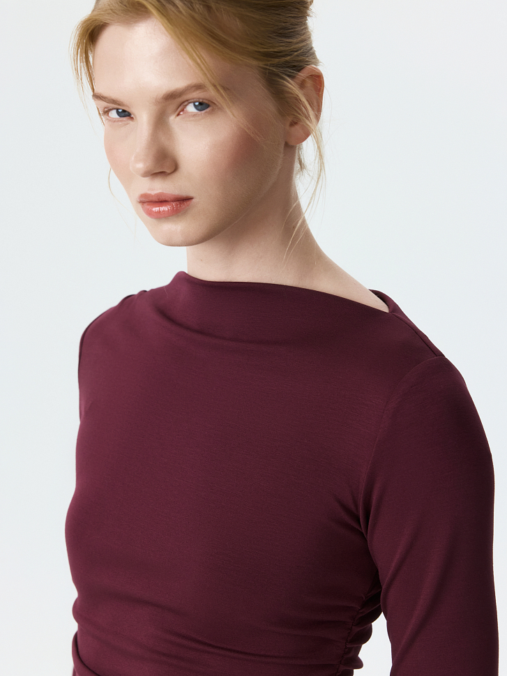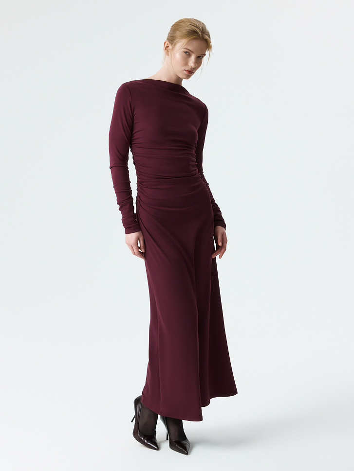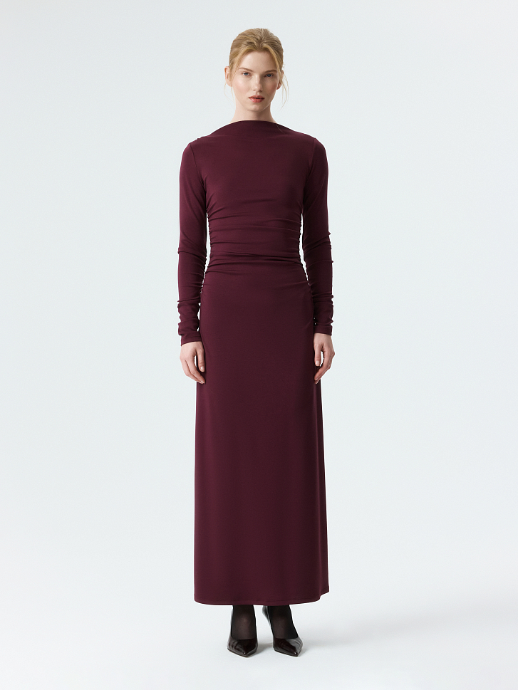 Тонкое платье с длинными рукавами пригодится в любом сезоне. Трикотаж на основе вискозы мягко прилегает и хорошо тянется благодаря эластичным волокнам. Облегающая модель комфортно сидит по фигуре и не сковывает движения, а драпировки создают трендовые акценты в расслабленном стиле.
