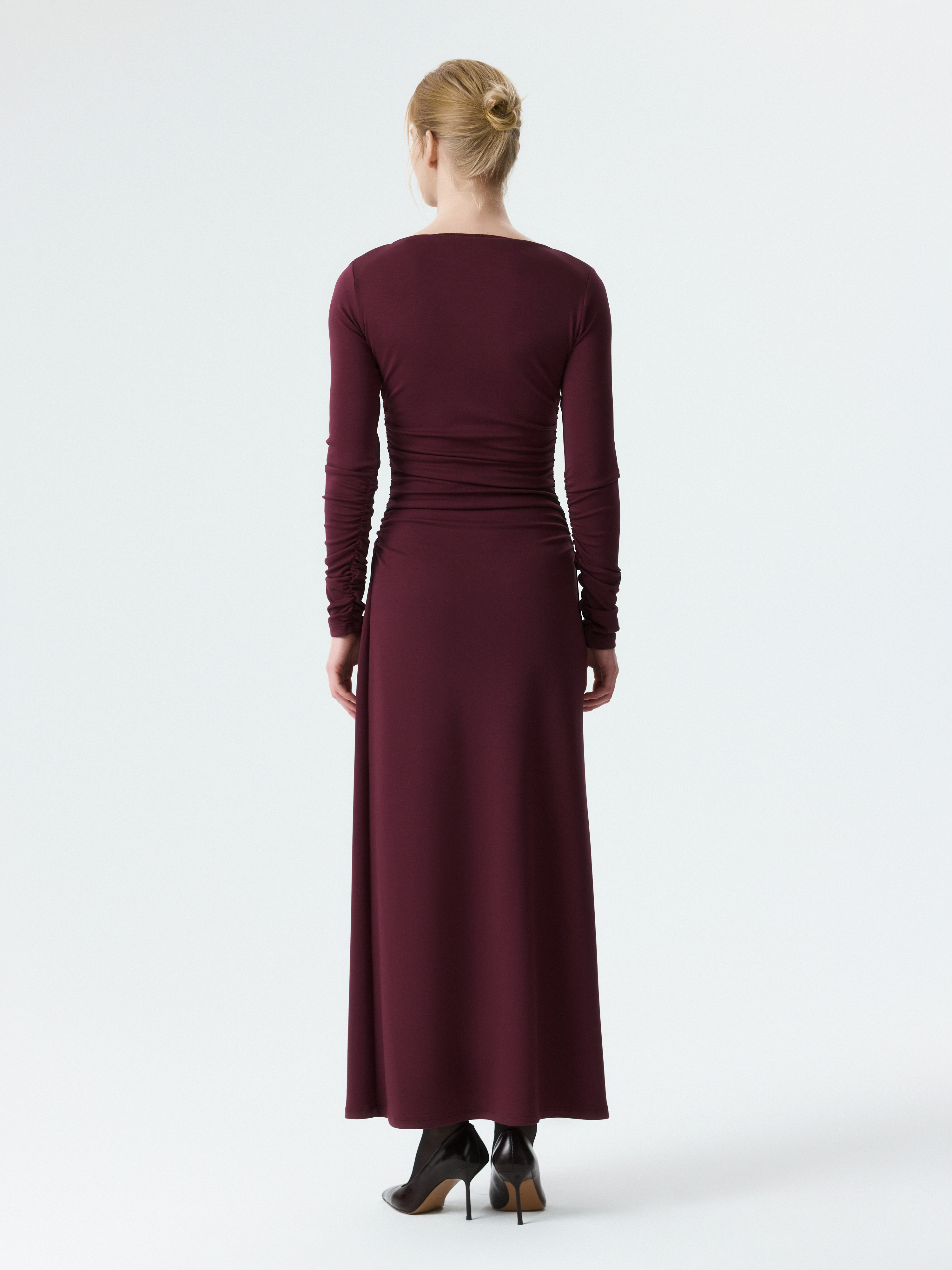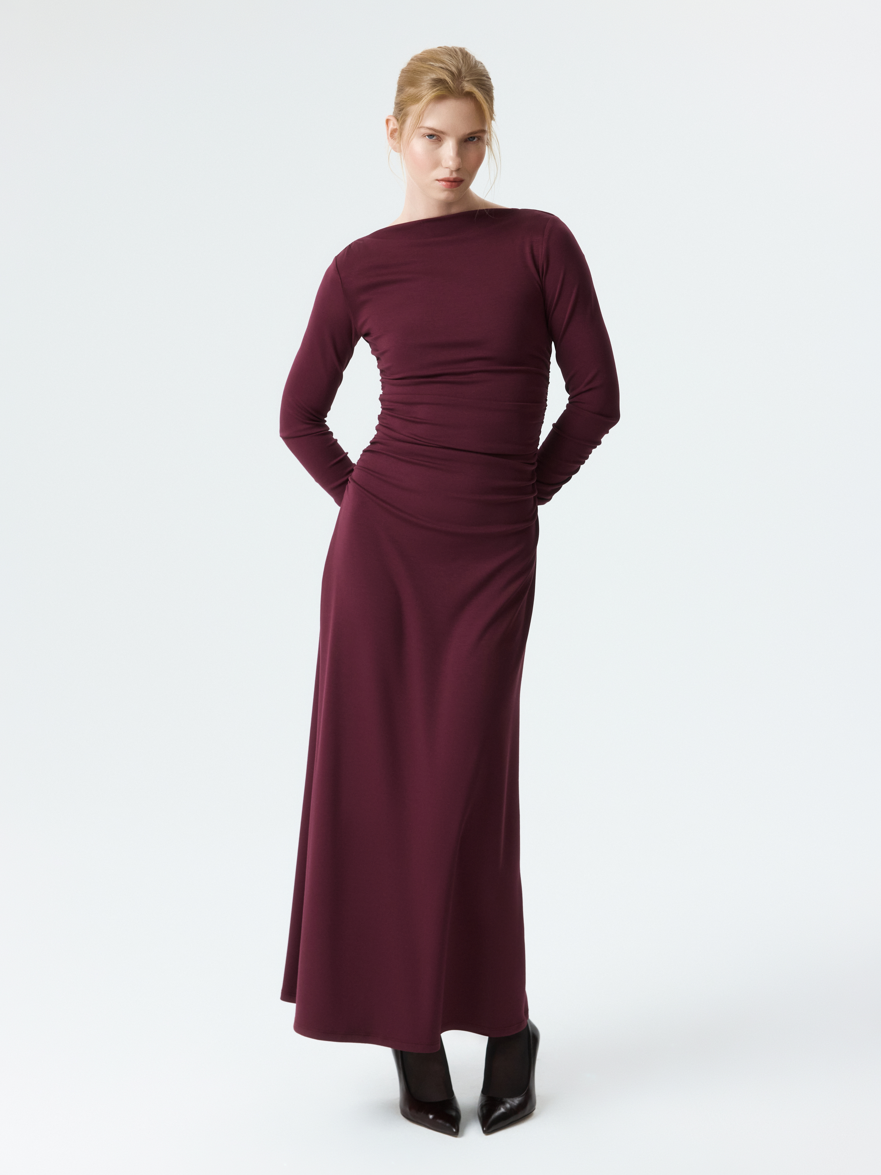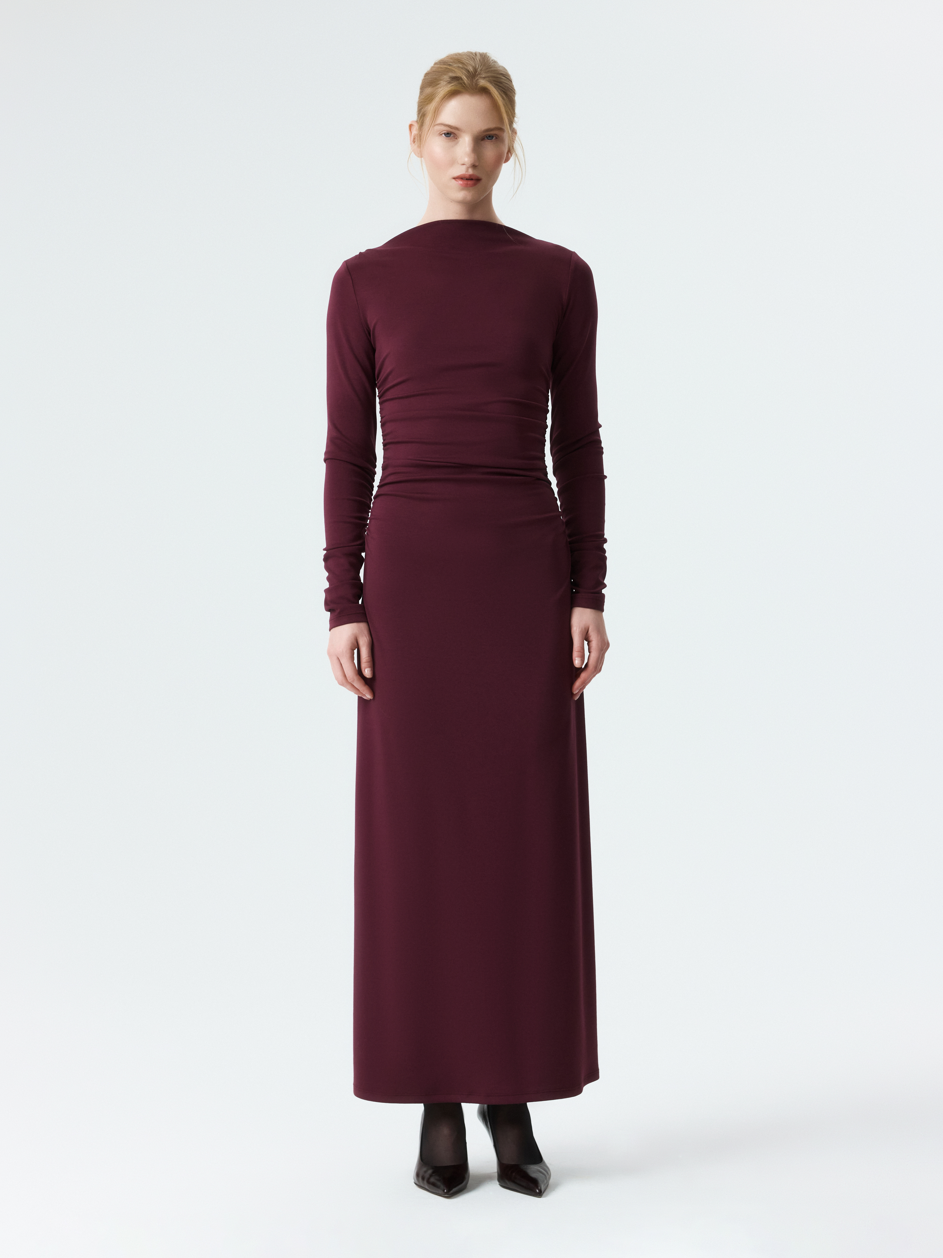 Тонкое платье с длинными рукавами пригодится в любом сезоне. Трикотаж на основе вискозы мягко прилегает и хорошо тянется благодаря эластичным волокнам. Облегающая модель комфортно сидит по фигуре и не сковывает движения, а драпировки создают трендовые акценты в расслабленном стиле.