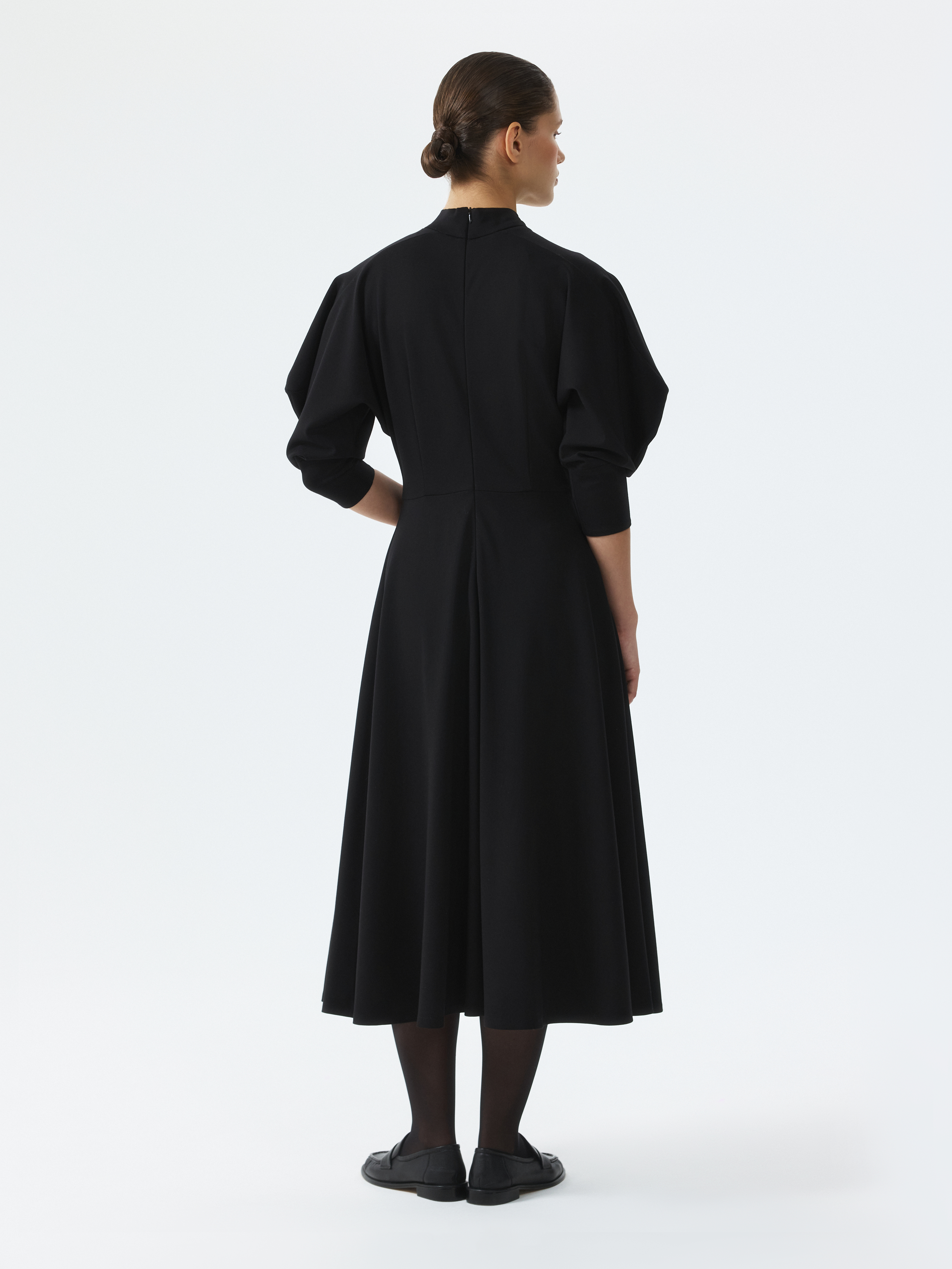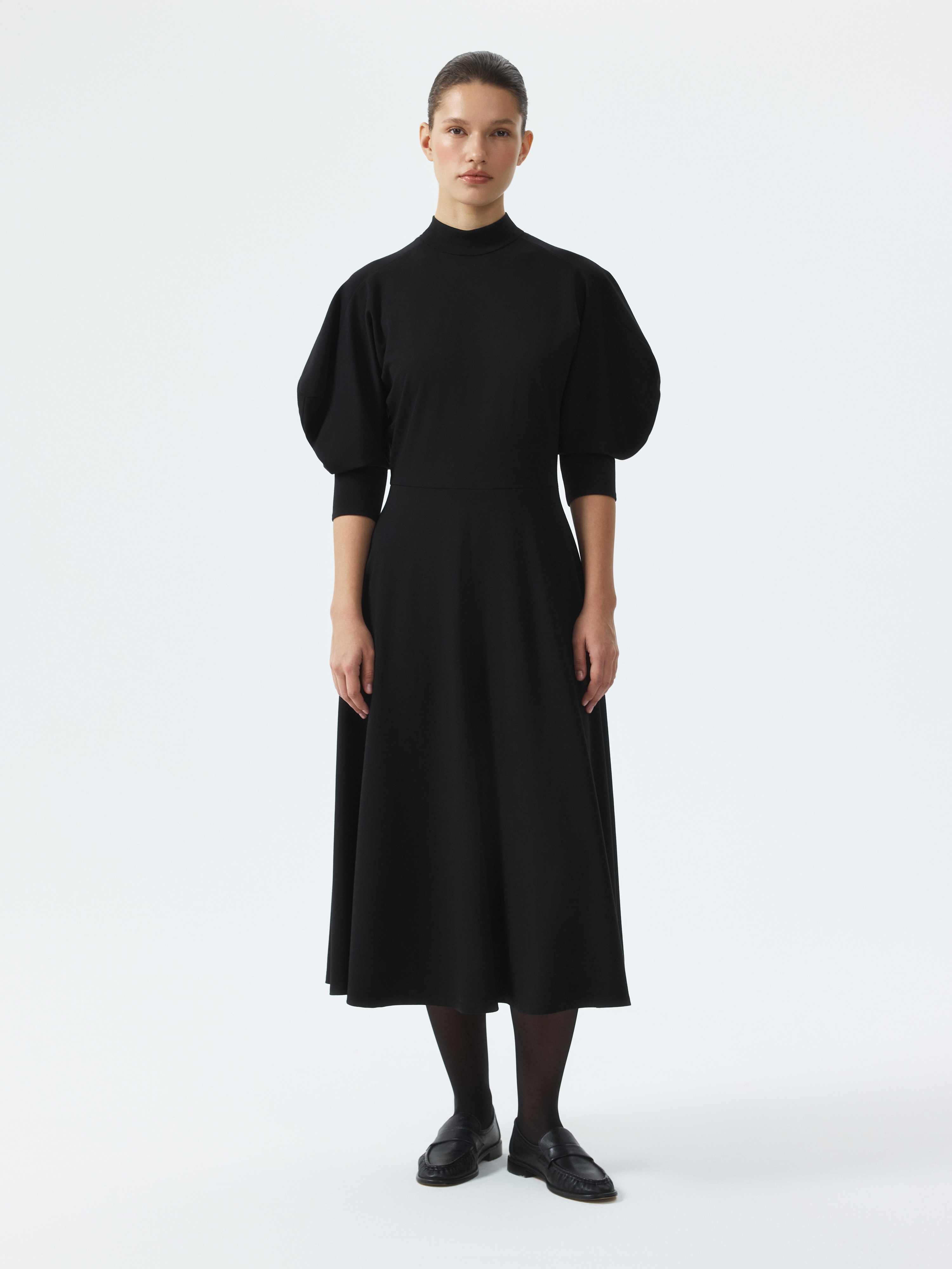 Расклешенное платье с рукавами ¾ легко впишется в гардероб и останется актуальным надолго. Плотный гладкий трикотаж с эффектом лайкры приятно прилегает к телу даже без подкладки и хорошо тянется, не сковывая движения. Объемные рукава сделают образ более интересным.