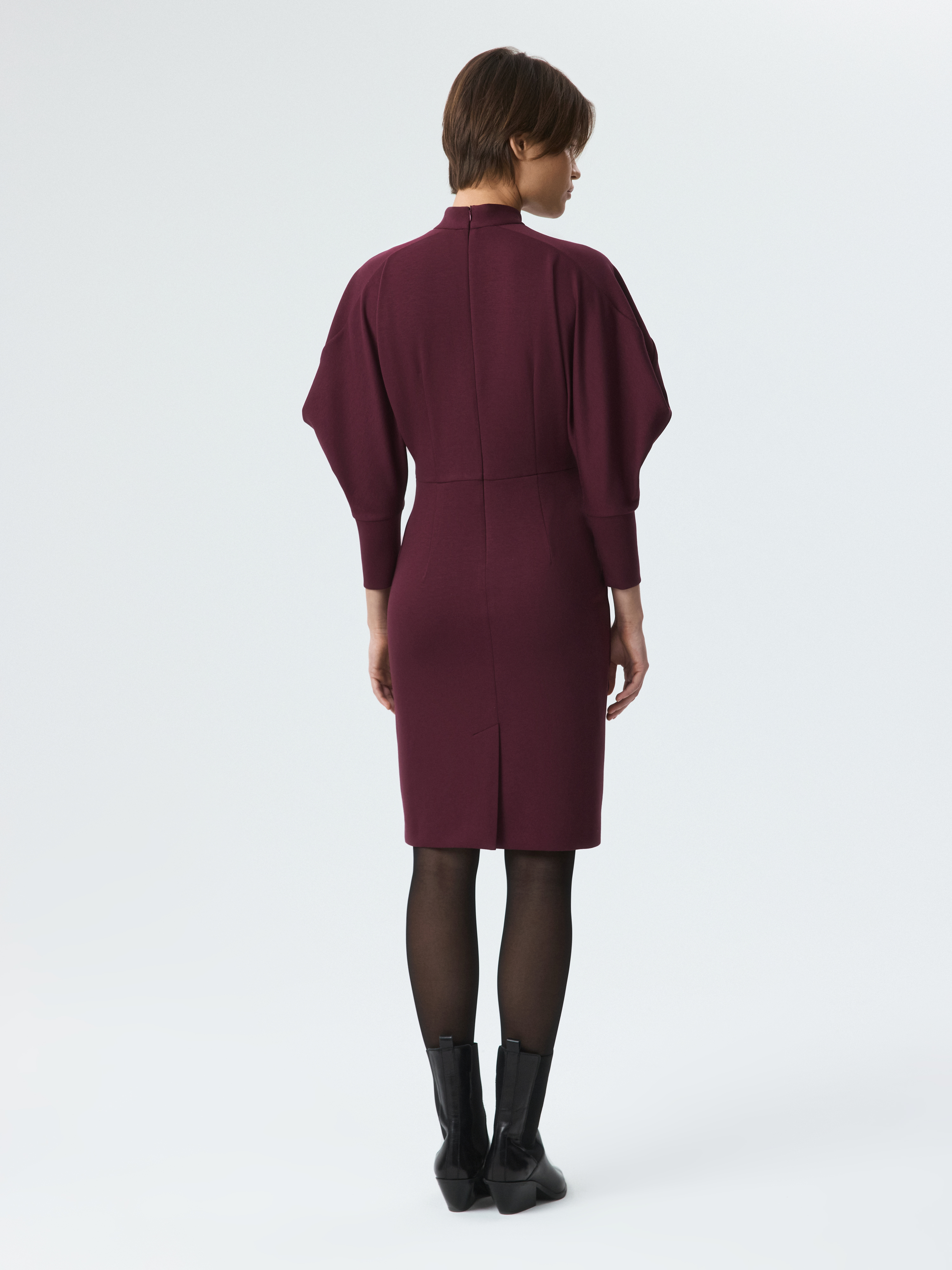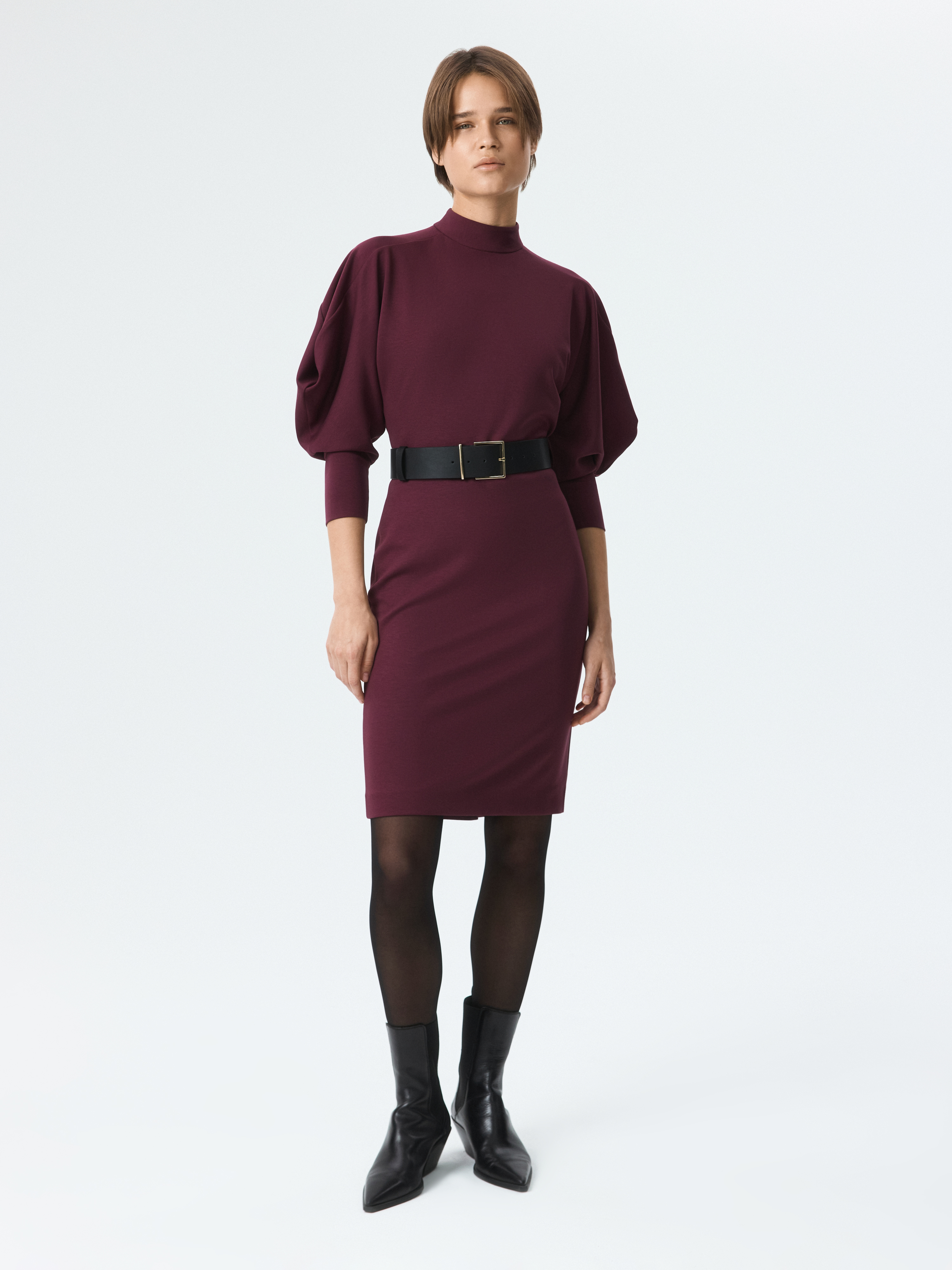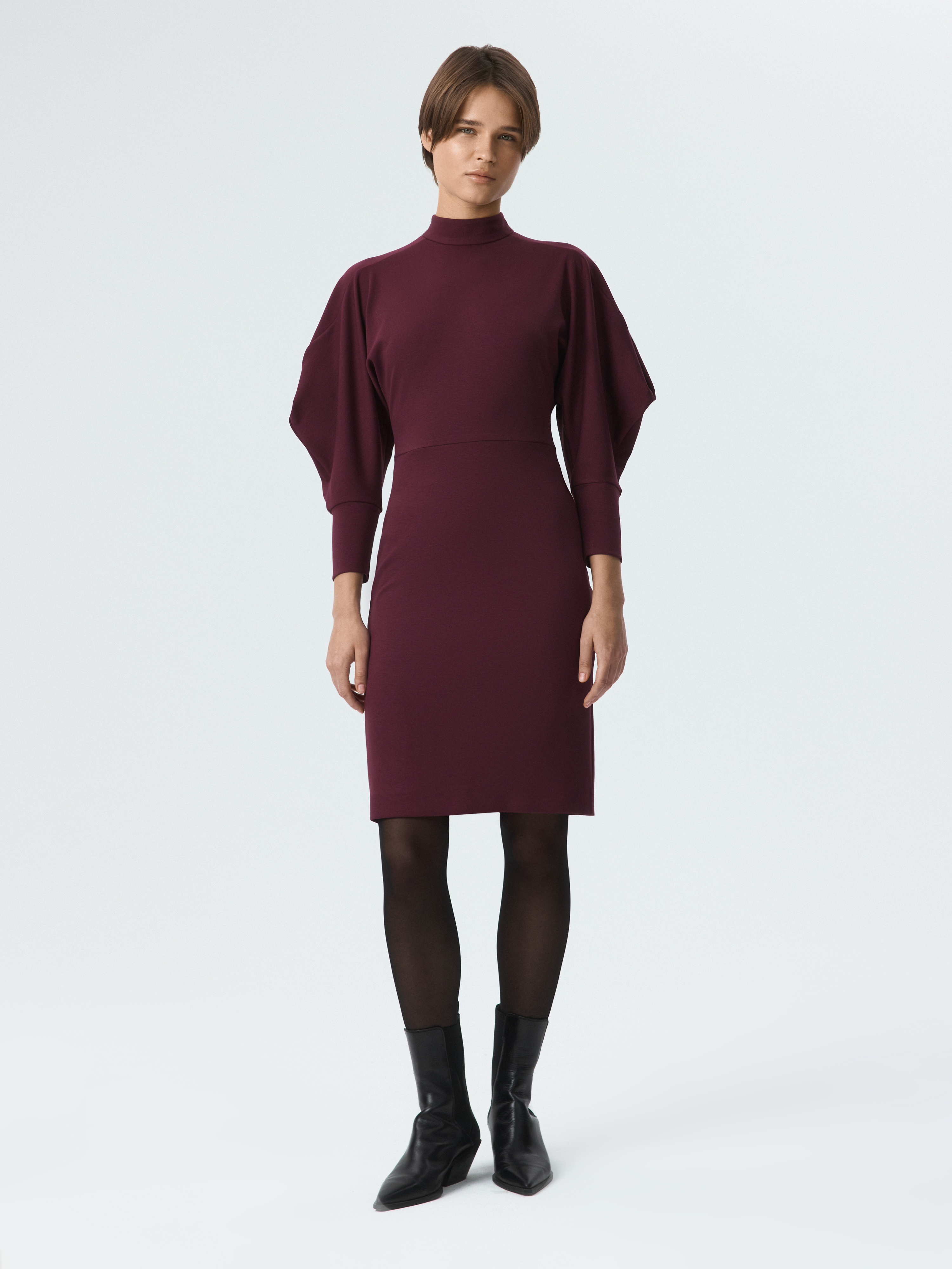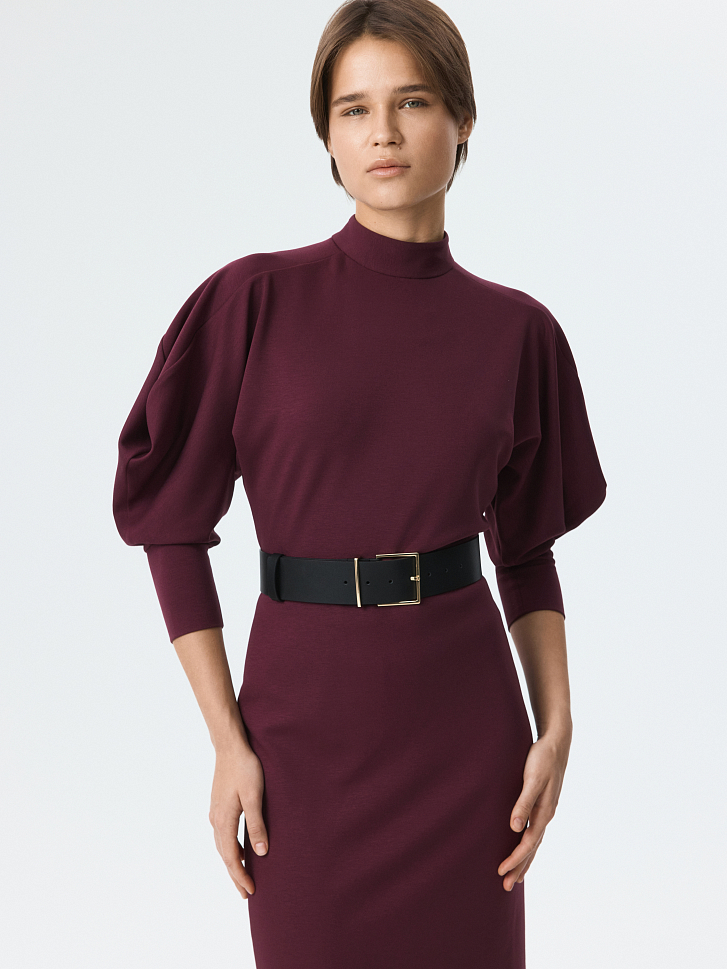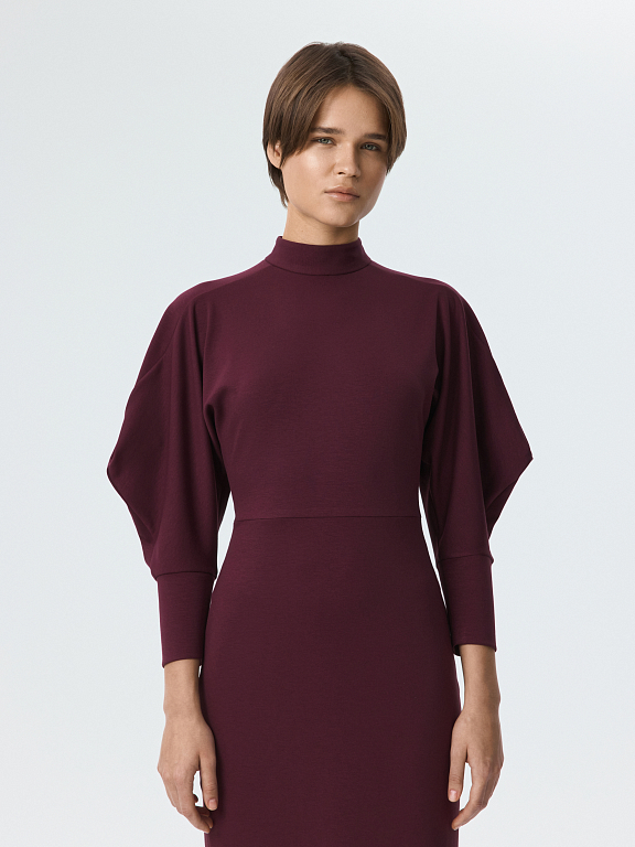 Приталенное платье-миди удачно впишется в любой контекст. Плотный гладкий трикотаж приятно прилегает к телу даже без подкладки и хорошо тянется, не сковывая движения. Центральным акцентом модели выступают асимметричные рукава "летучая мышь" длиной ¾, которые создают объемный эффект.