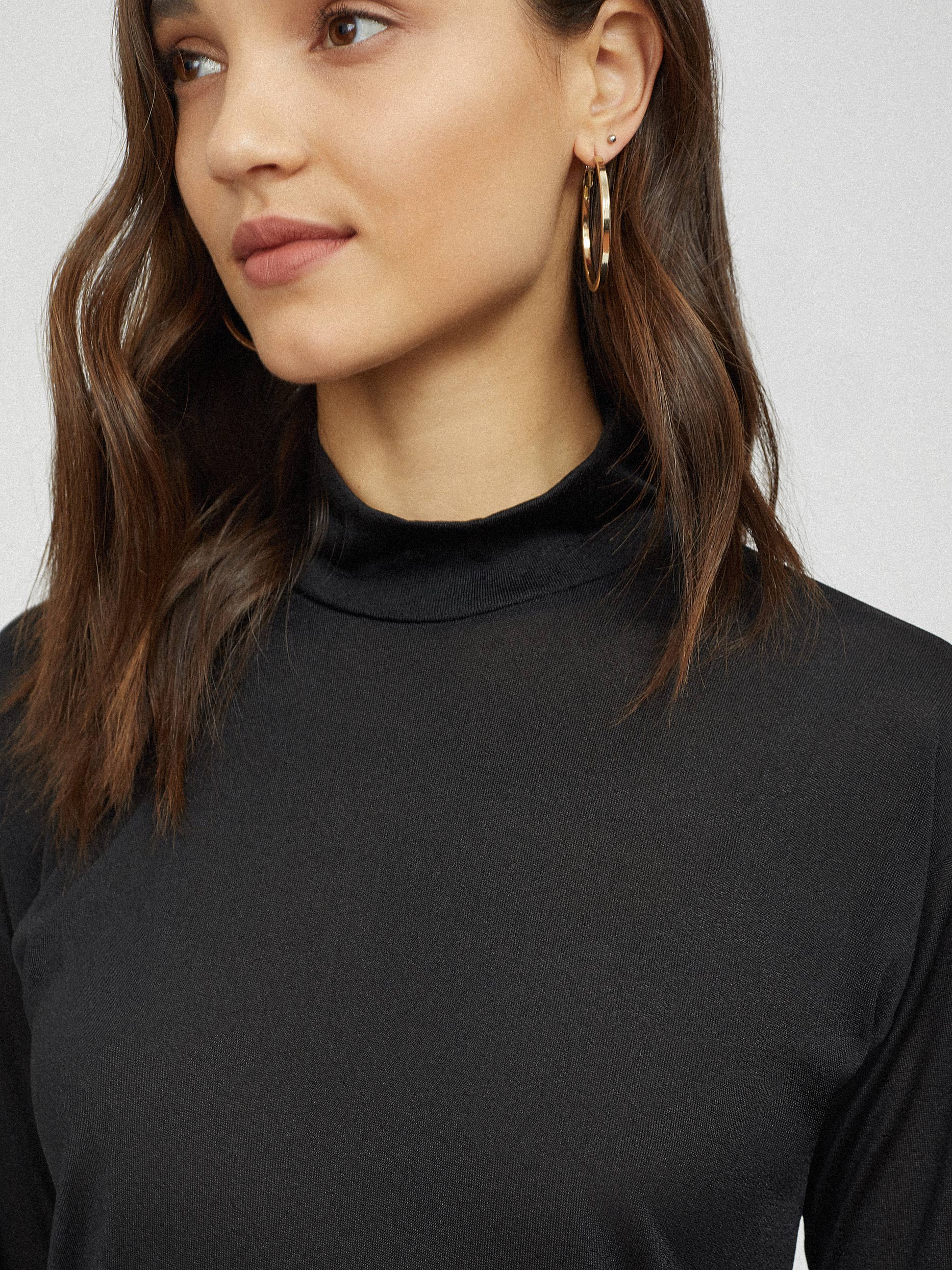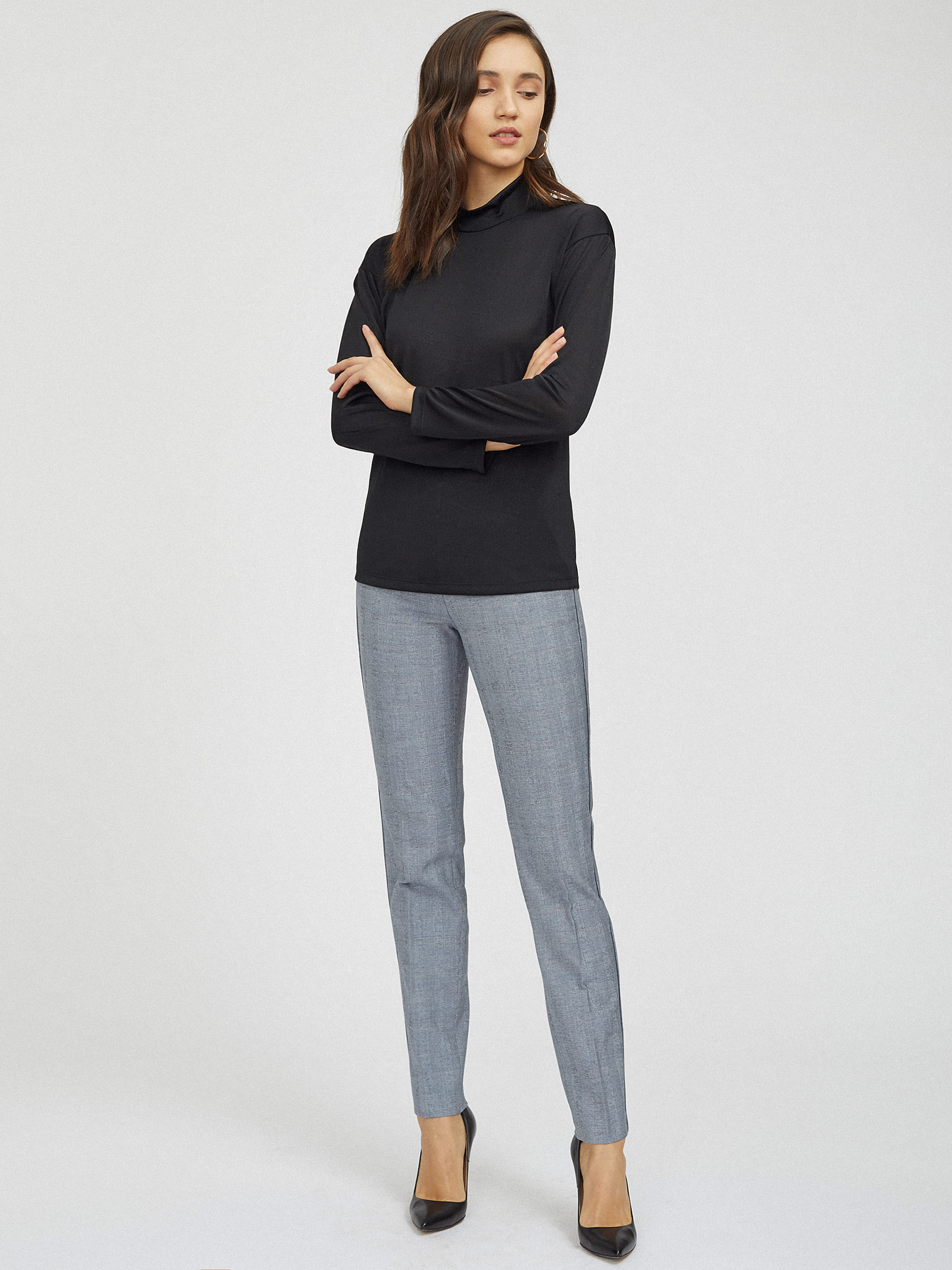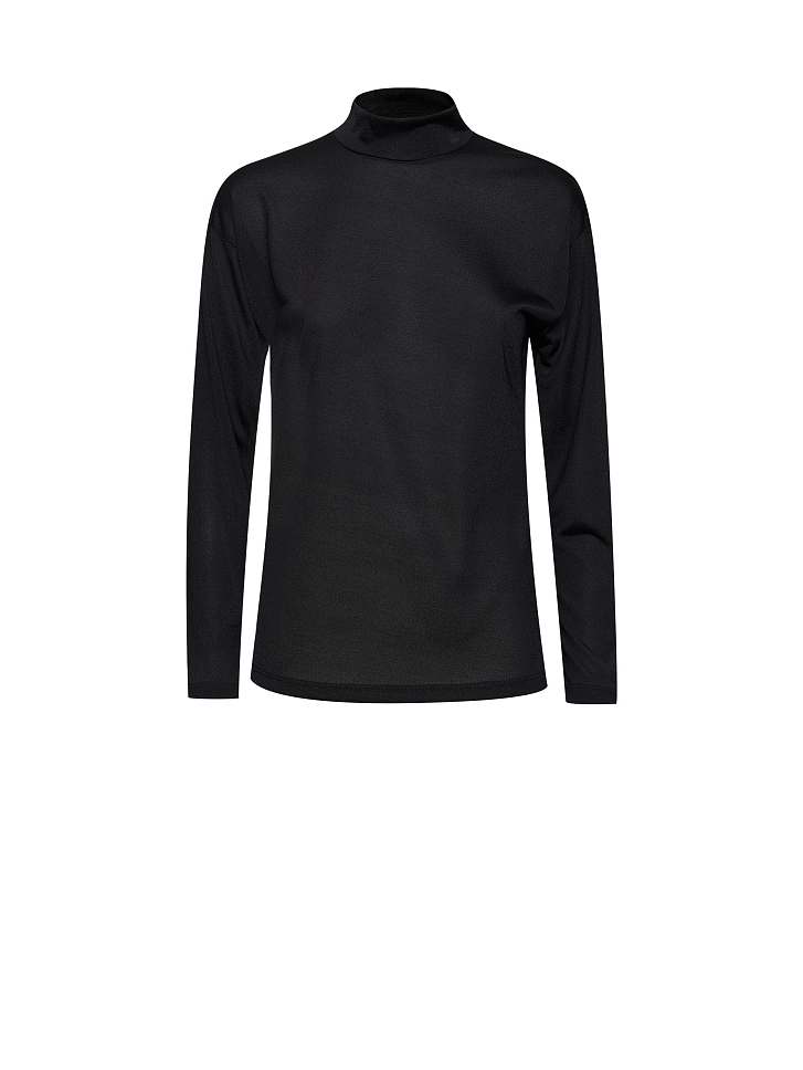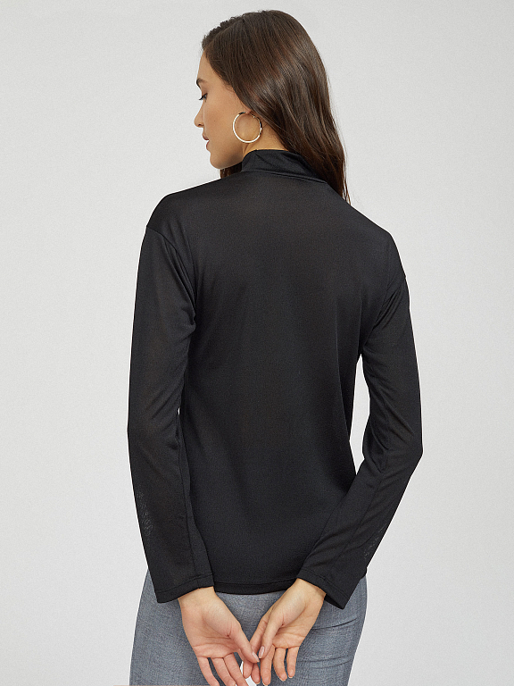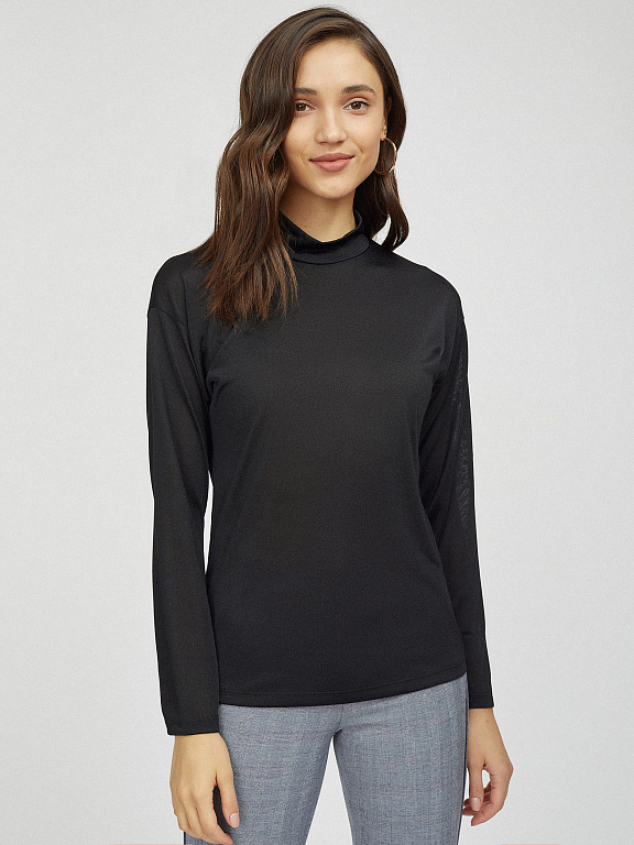 Меланжевый джемпер с высоким воротником. Полуоблегающий крой, спущенная линия плеч, длинные рукава.