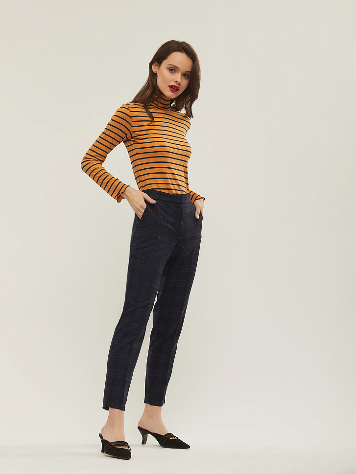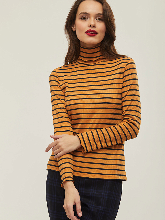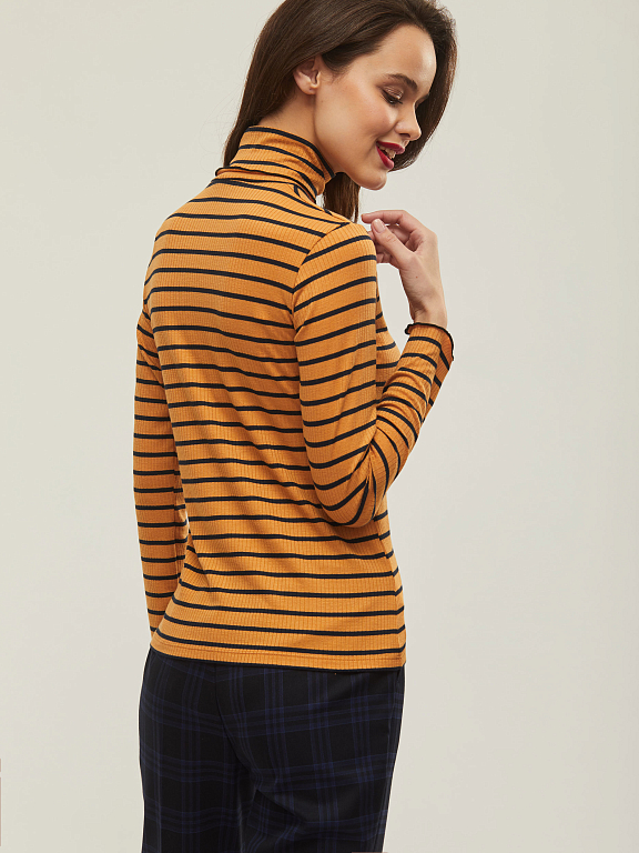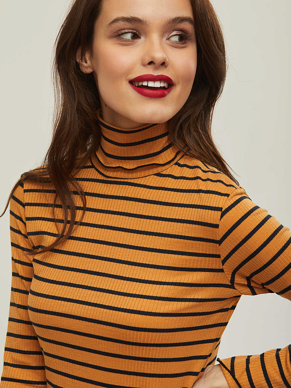 Водолазка полуприлегающего кроя в рубчик с высоким воротником.