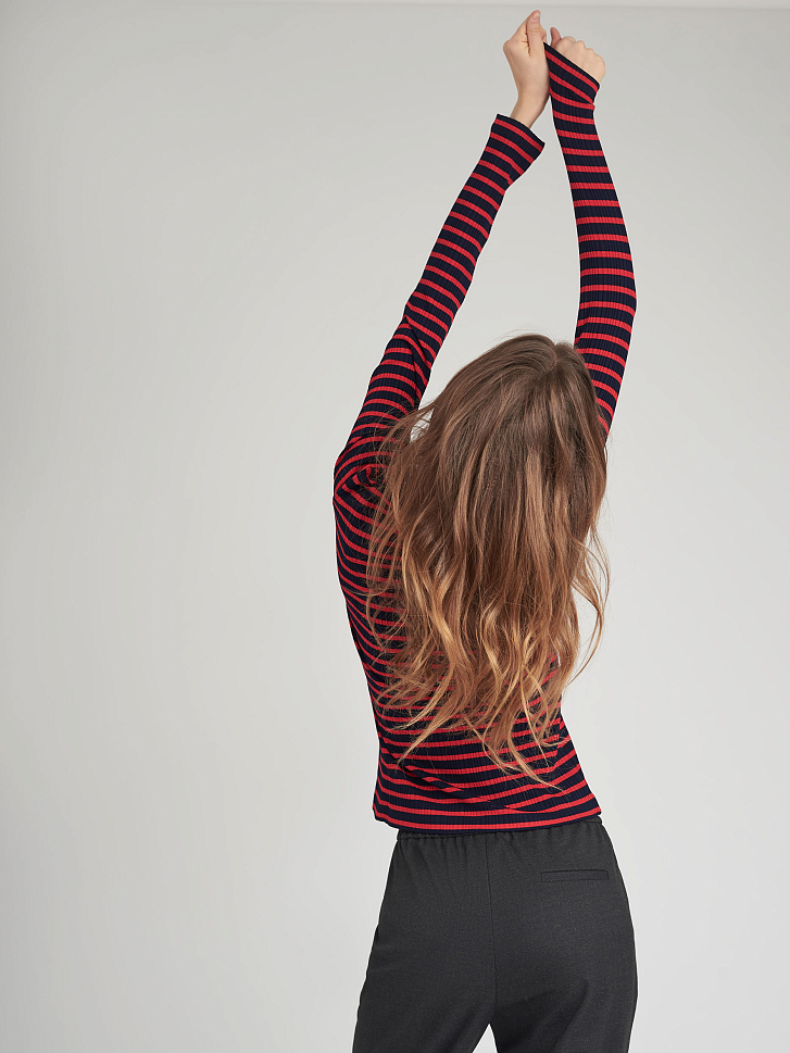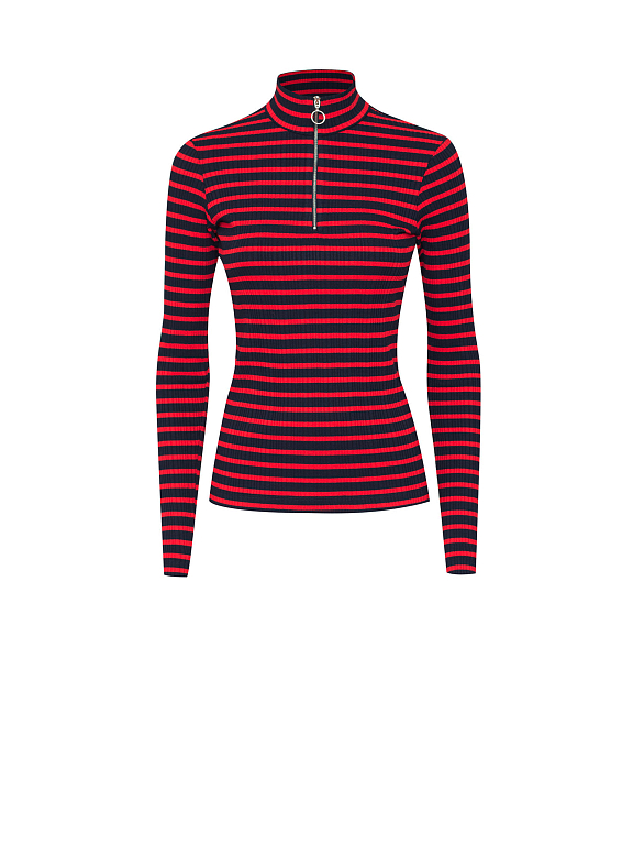 Джемпер в рубчик, выполненный из смесовой вискозы. Облегающий крой, высокий воротник, застежка на молнию.