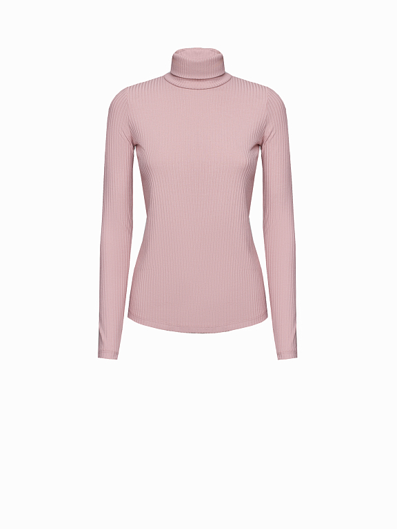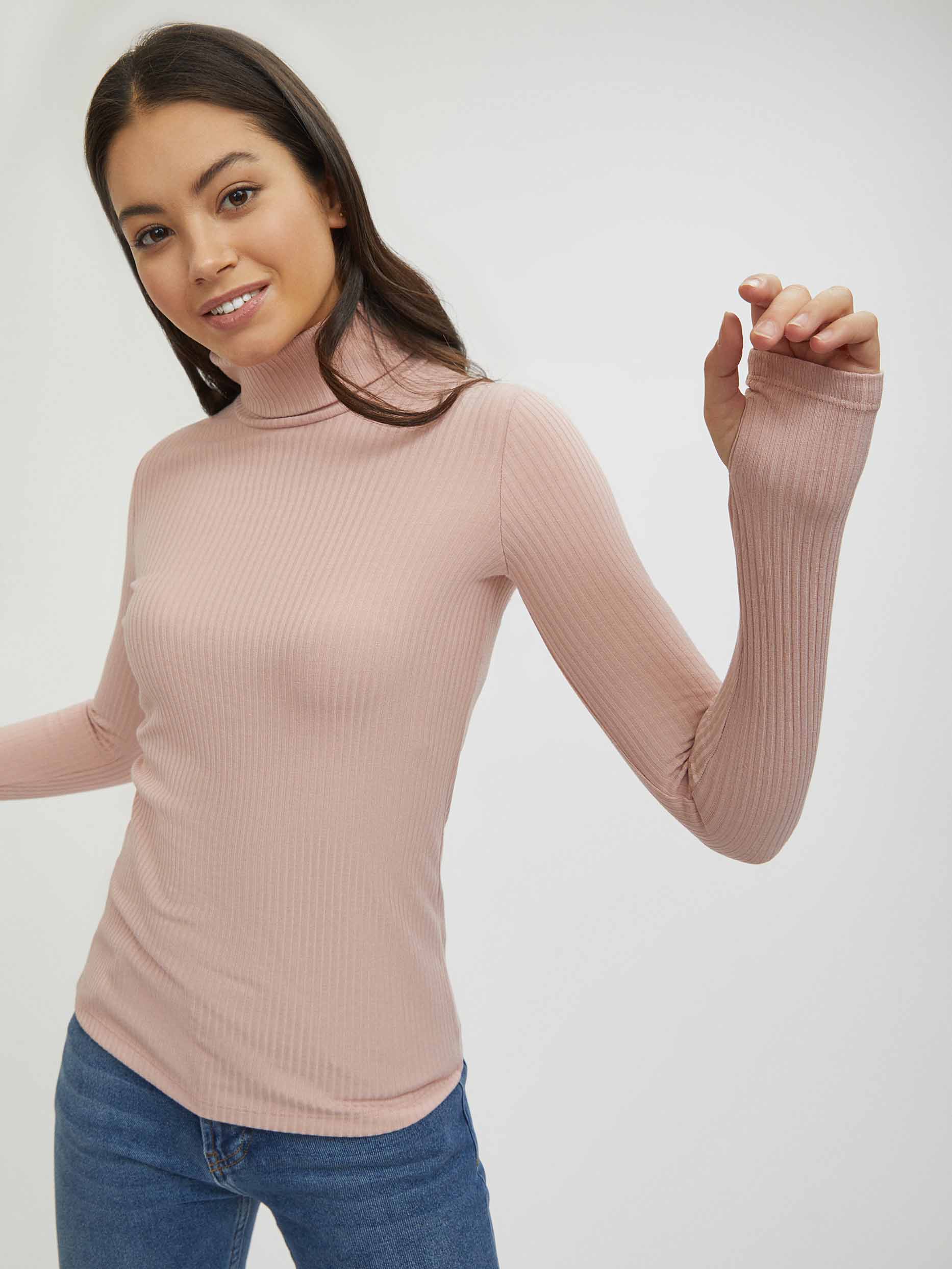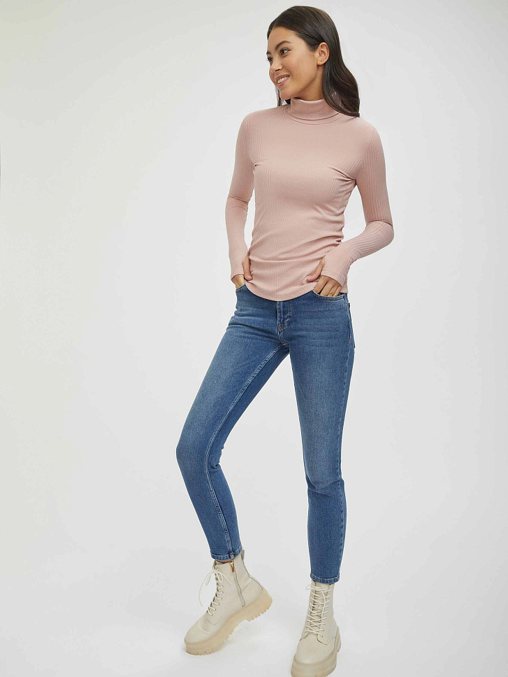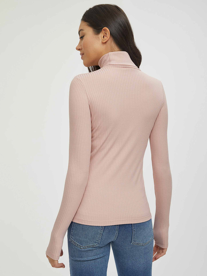 Водолазка в рубчик. Облегающий силуэт, высокий воротник, длинные рукава с отверстиями для больших пальцев.