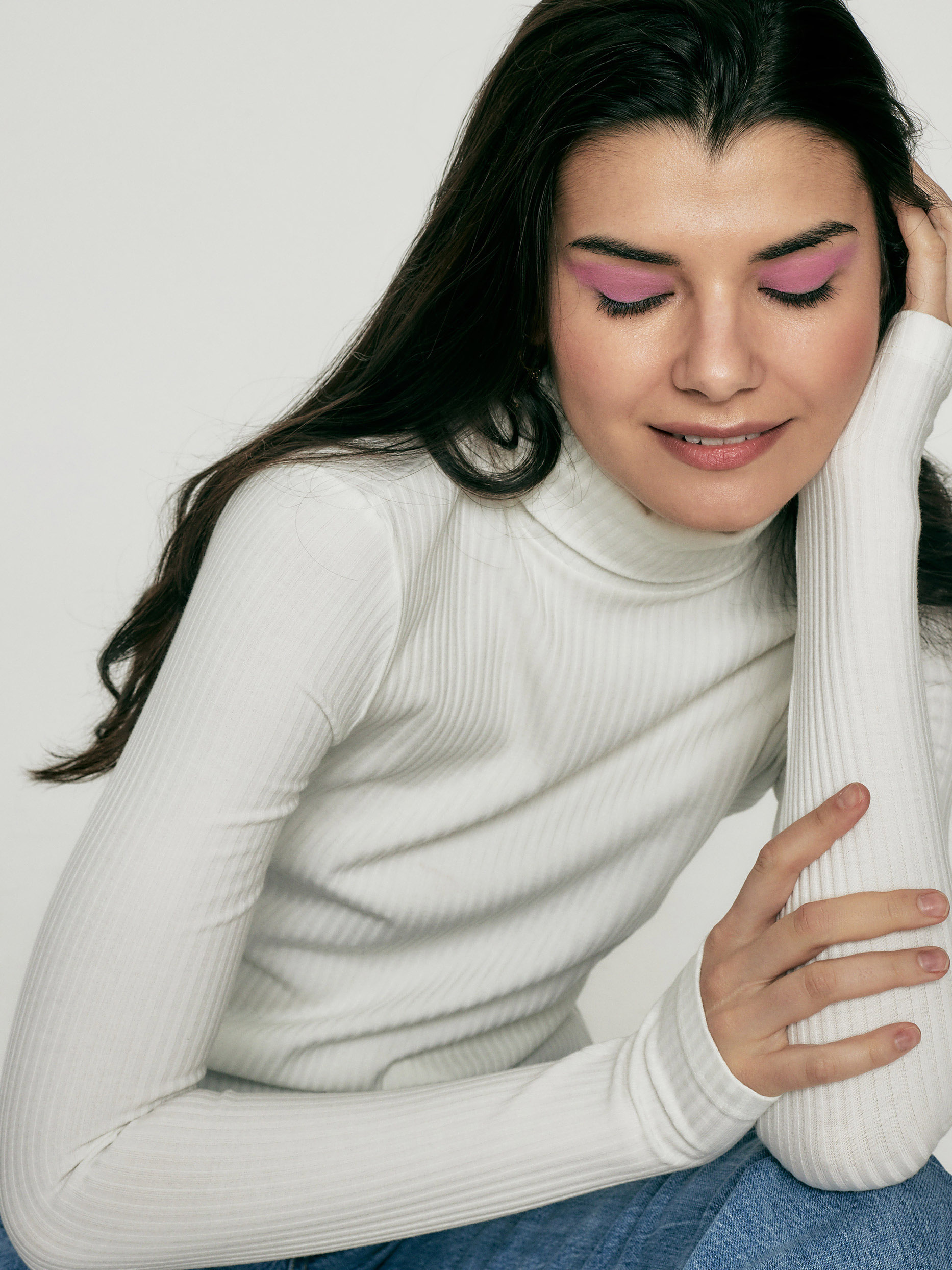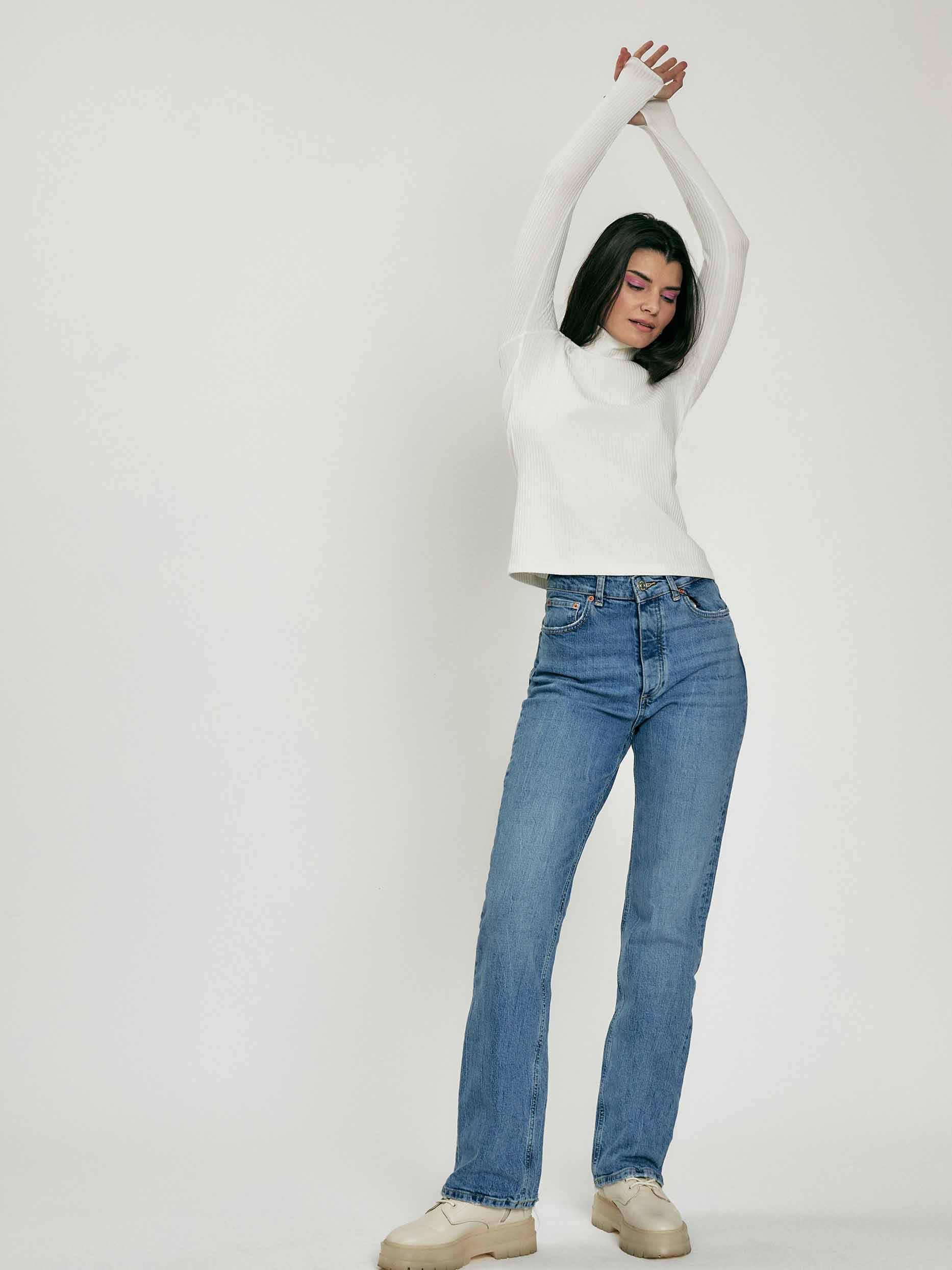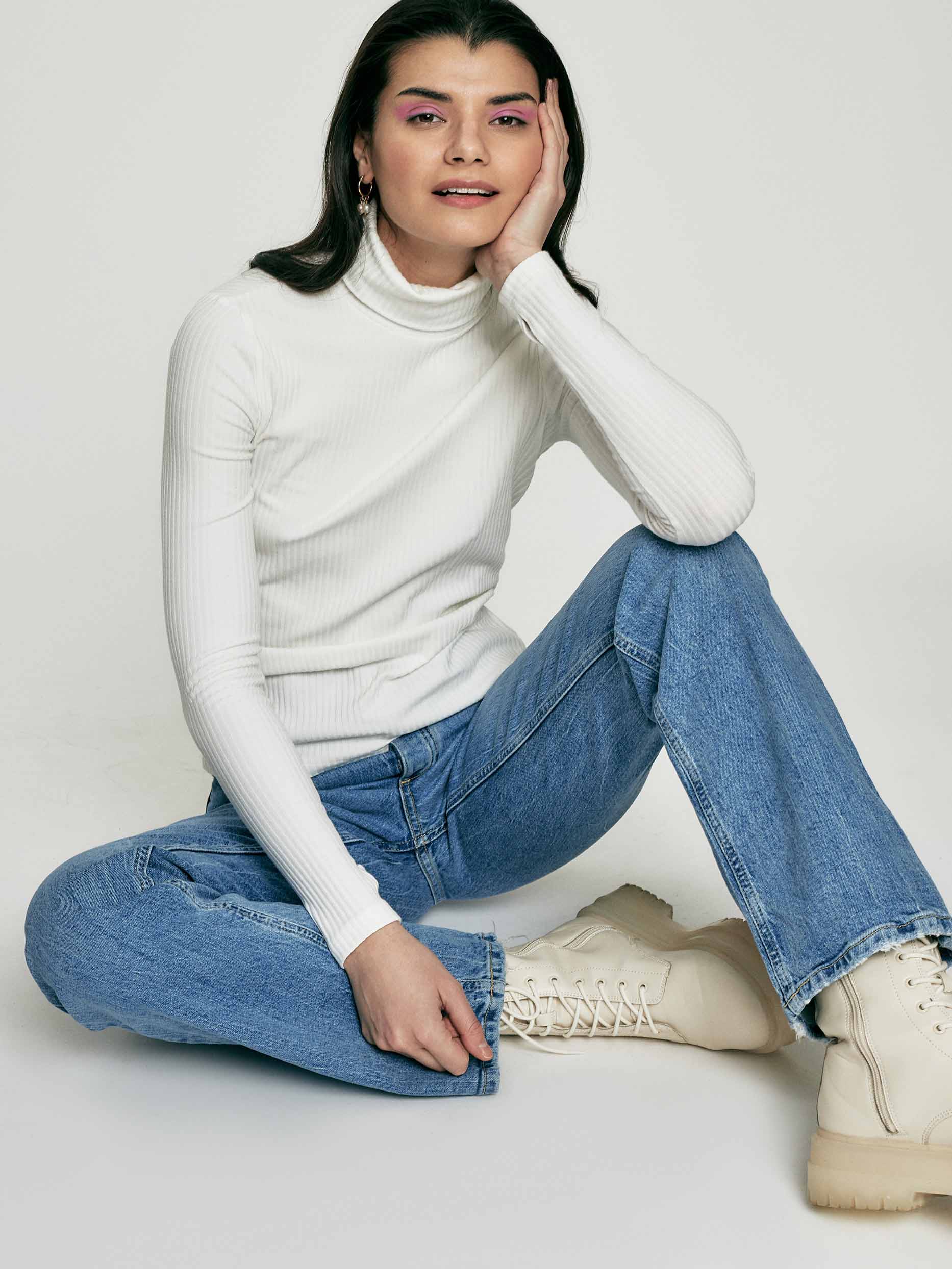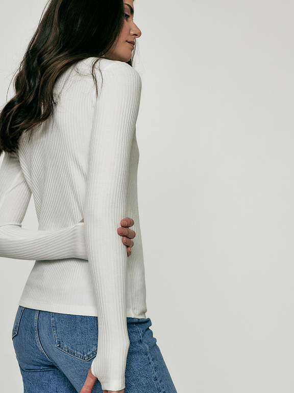 Водолазка в рубчик. Облегающий силуэт, высокий воротник, длинные рукава с отверстиями для больших пальцев.