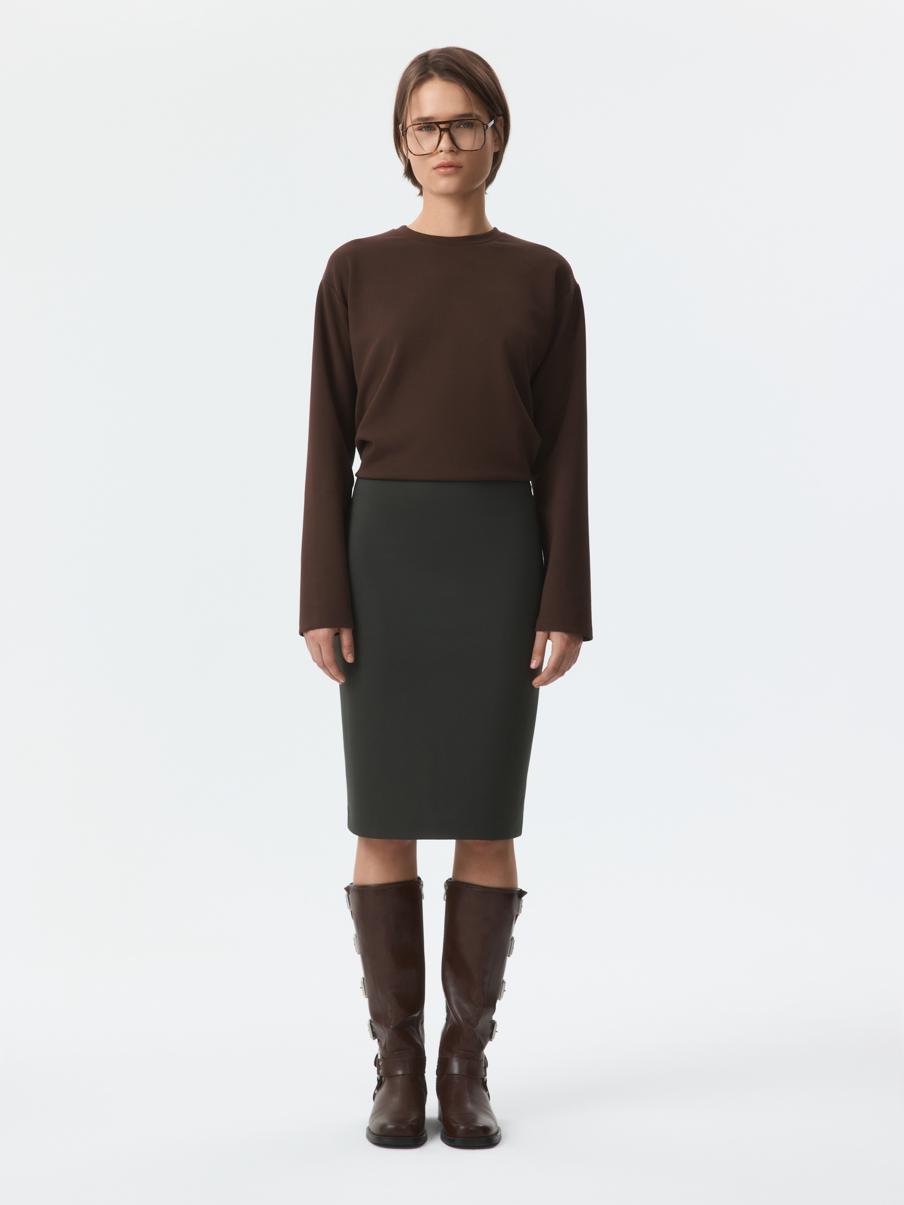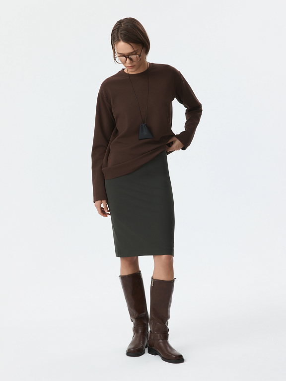 Юбка в длине миди – простое и практичное решение для повседневных образов. Плотный гладкий трикотаж приятно прилегает к телу даже без подкладки и хорошо тянется, не сковывая движения. Стилизуйте модель с парным лонгсливом или любым другим верхом.