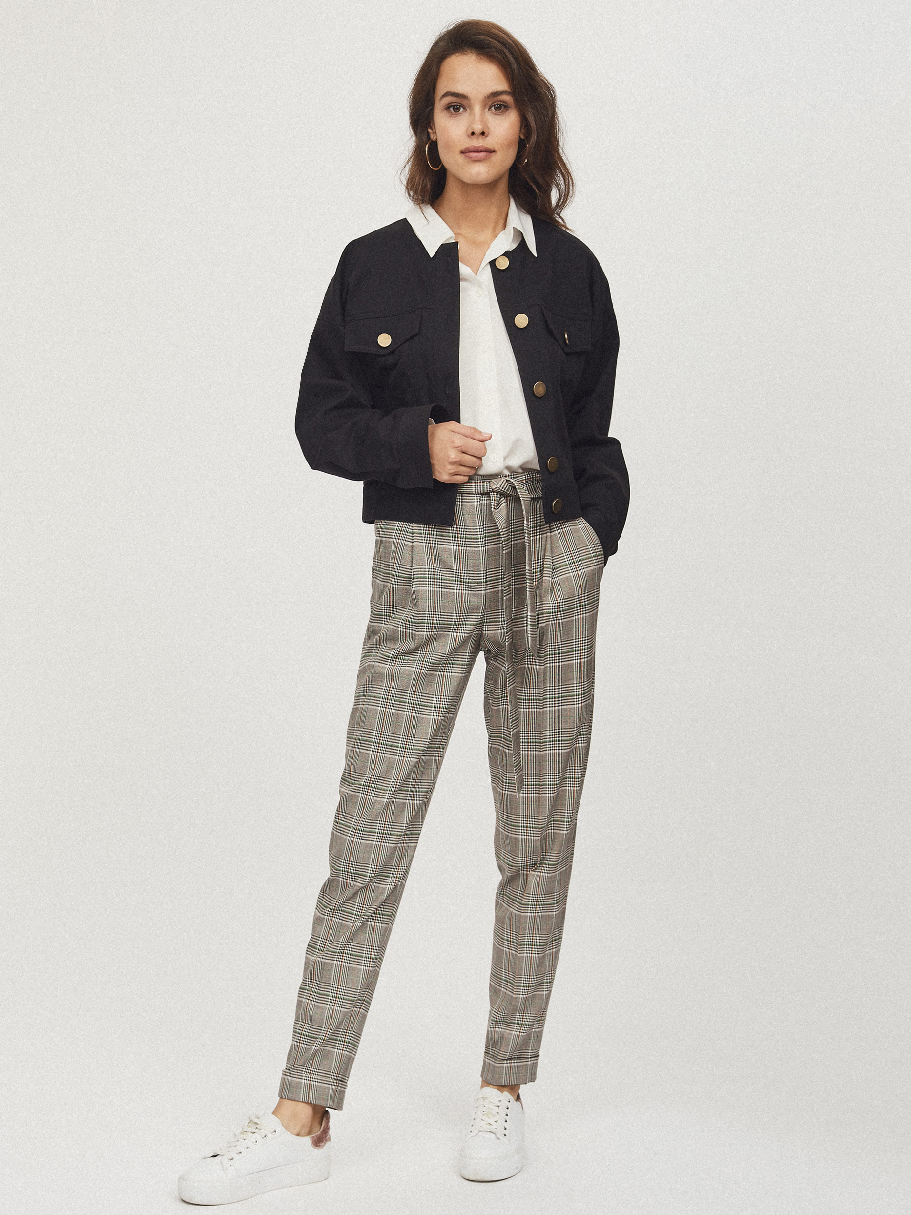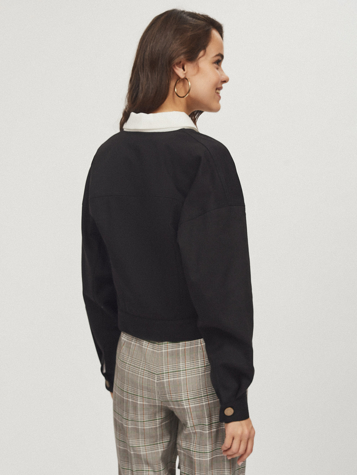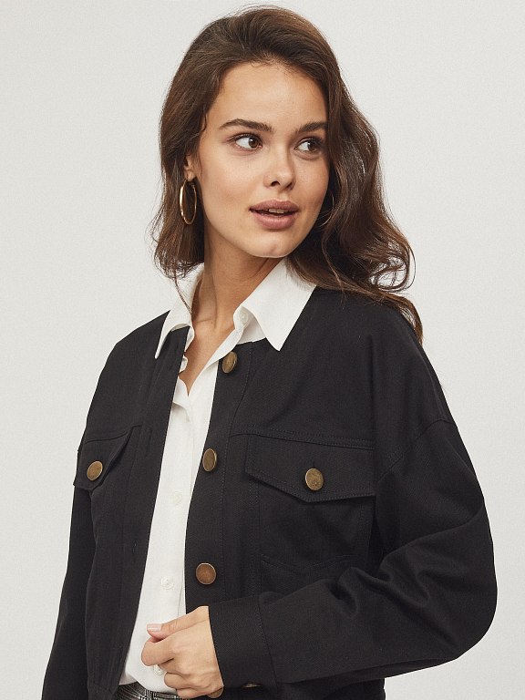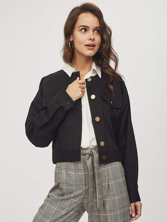 Укороченная куртка, выполненная из плотного денима. Округлый вырез, нагрудные карманы с клапанами. Спущенная линия плеч, объемные рукава на широких манжетах с пуговицами. Застегивается на ряд матовых состаренных металлических пуговиц.
