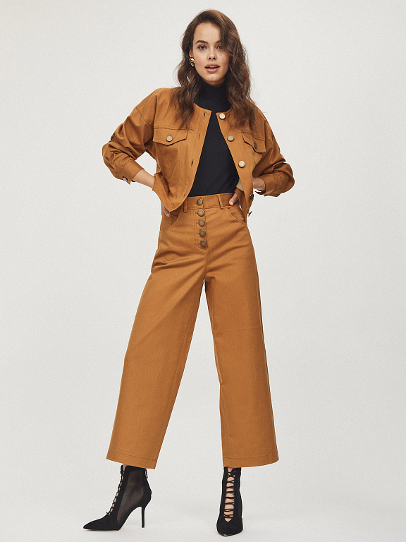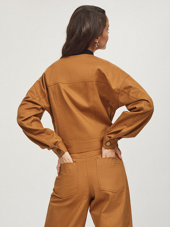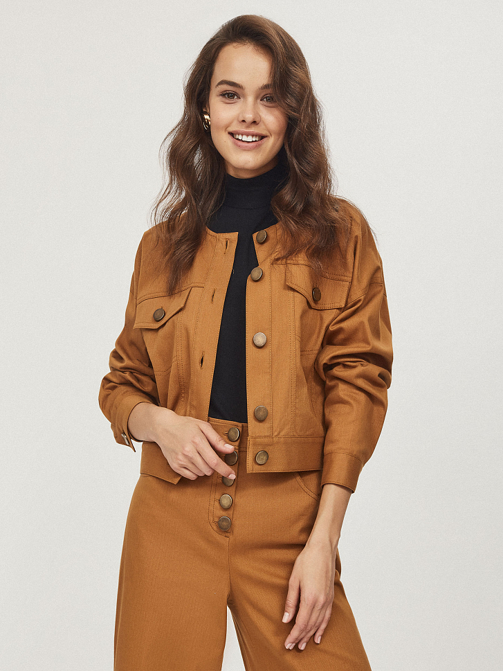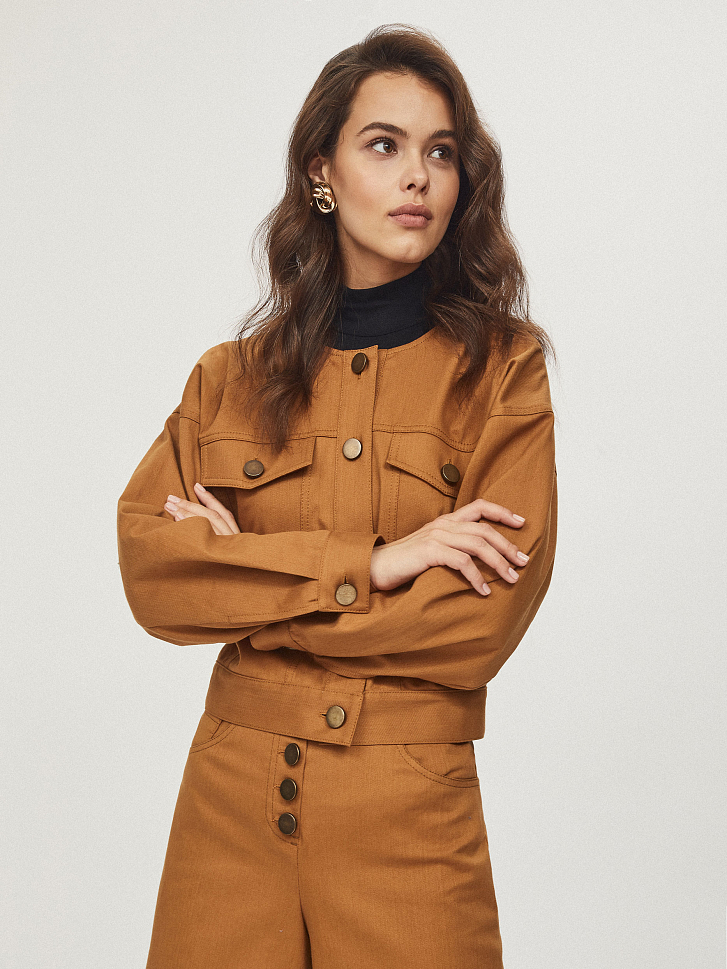 Укороченная куртка, выполненная из плотного денима. Округлый вырез, нагрудные карманы с клапанами. Спущенная линия плеч, объемные рукава на широких манжетах с пуговицами. Застегивается на ряд матовых состаренных металлических пуговиц.