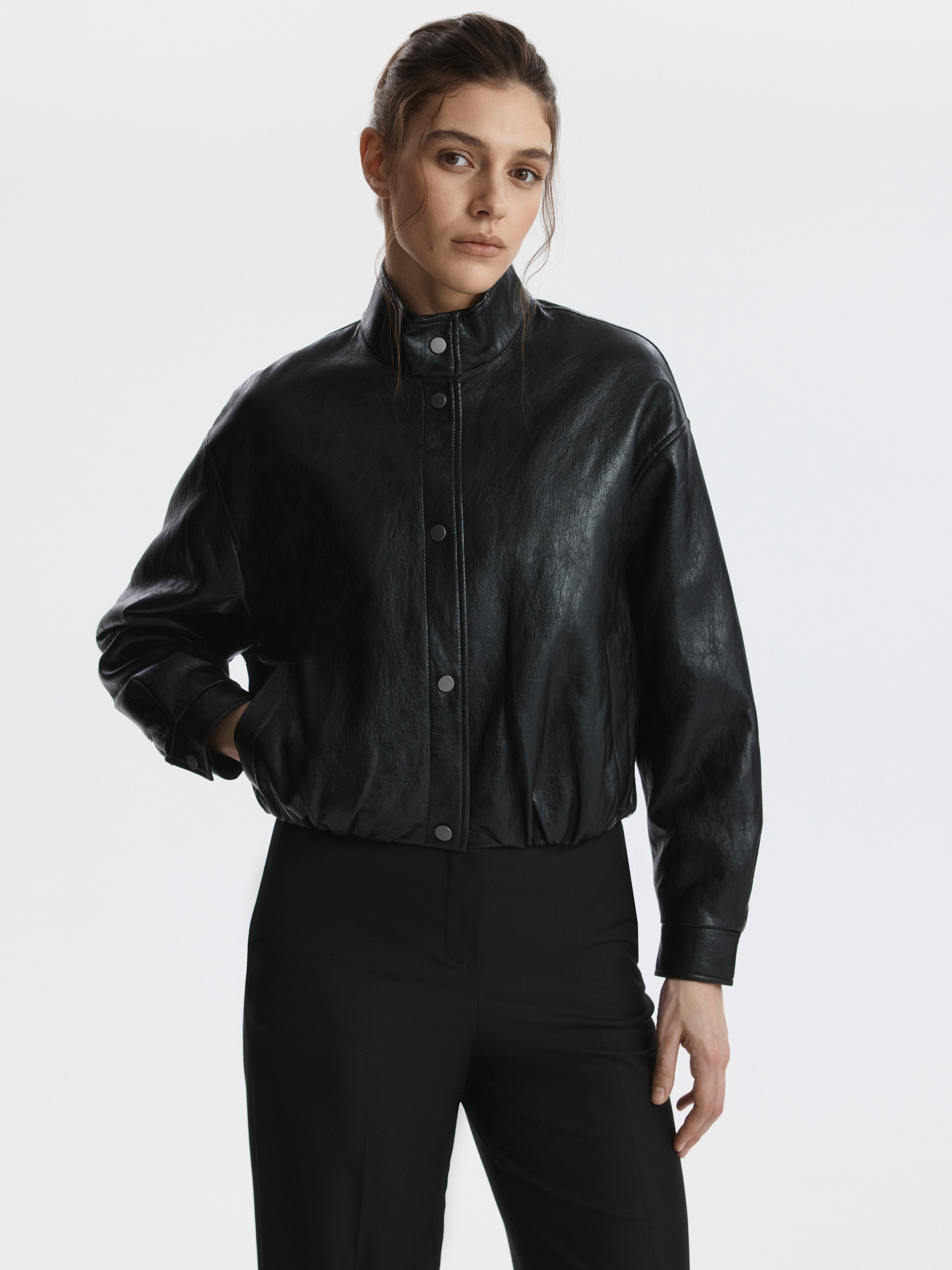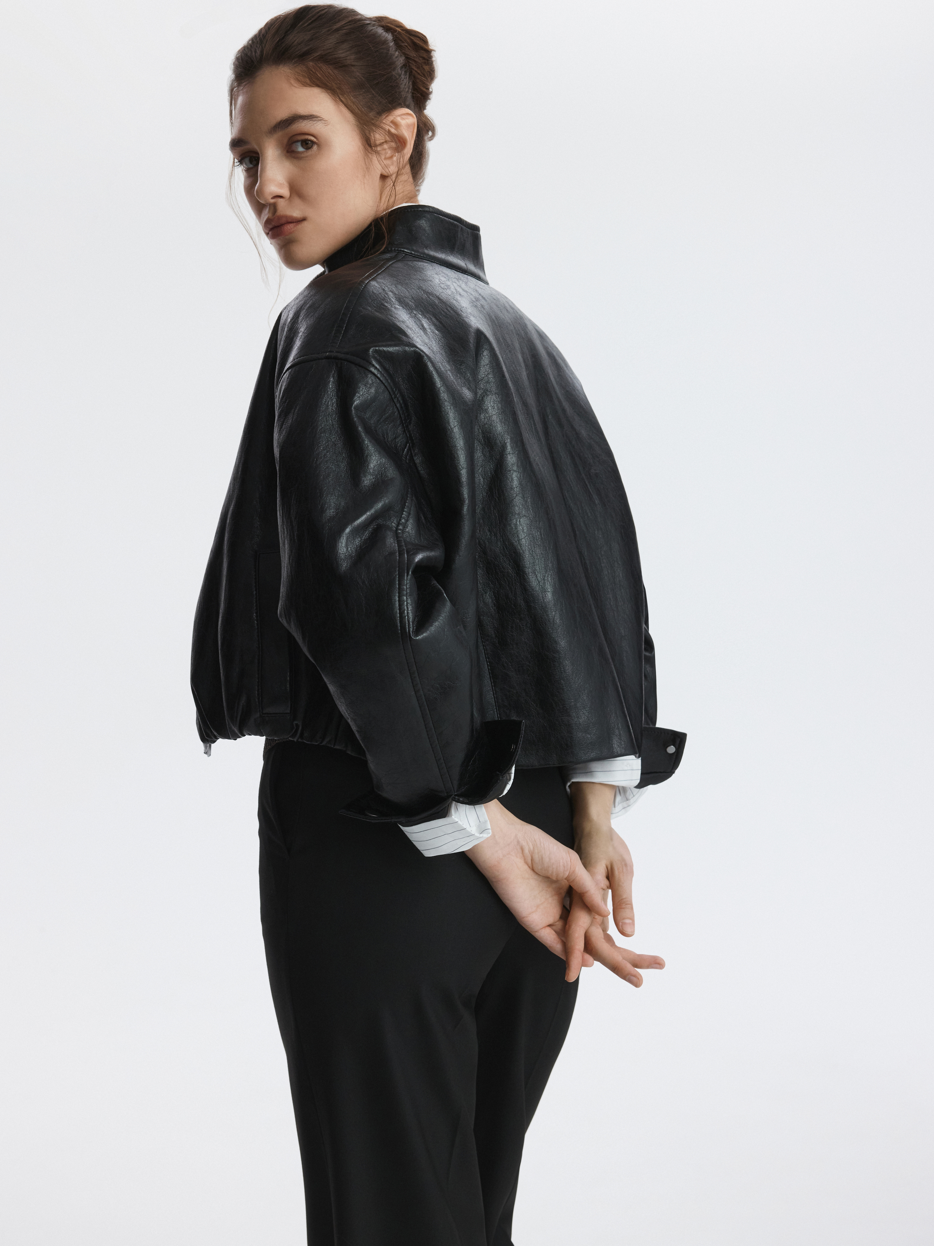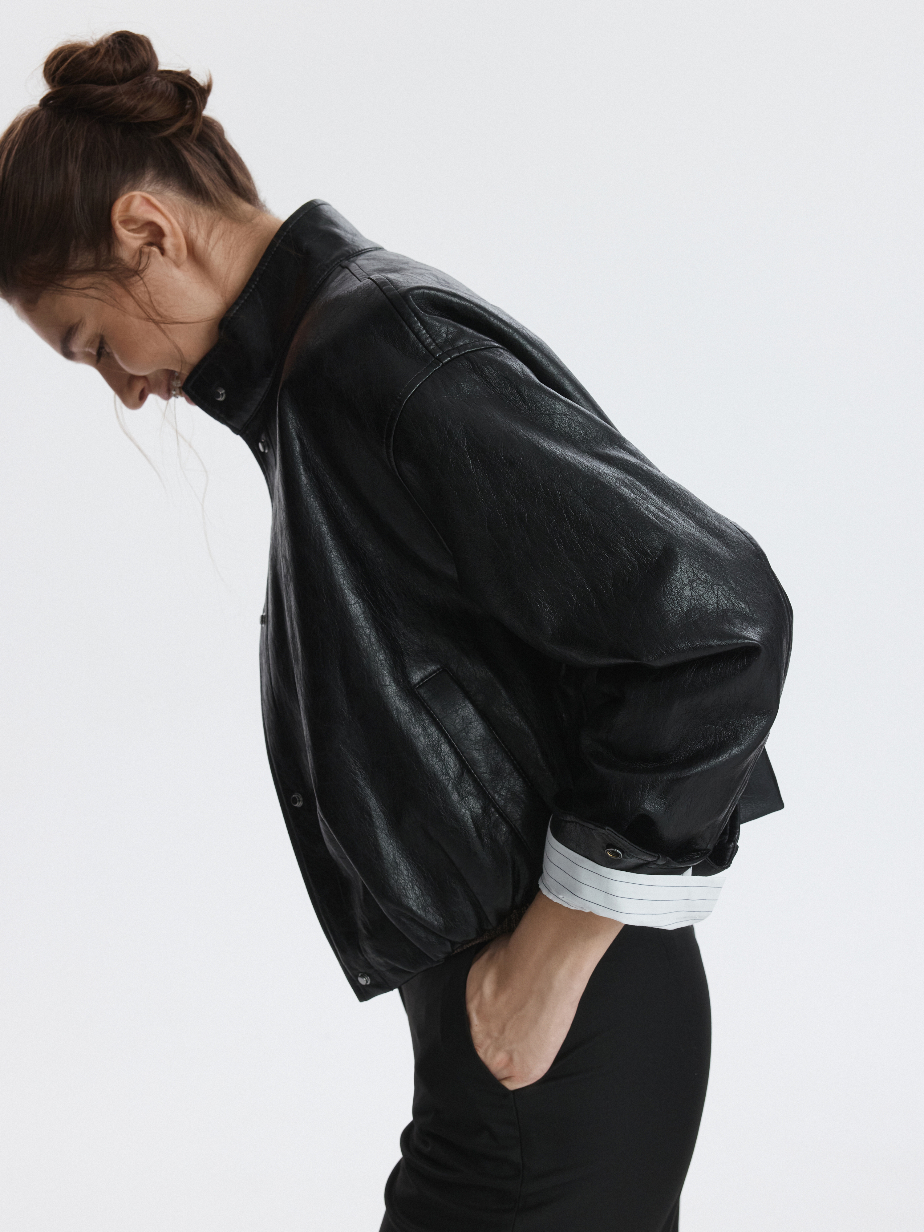 Кожаная куртка сочетает в себе удобный крой и универсальную стилистику, легко вписываясь в повседневные образы. Плотная экокожа с гладкой на ощупь фактурой обладает износоустойчивостью, а тонкий слой утеплителя дарит дополнительный комфорт в прохладную погоду. Модель с мягкой линией плеча расслабленно сидит по фигуре.