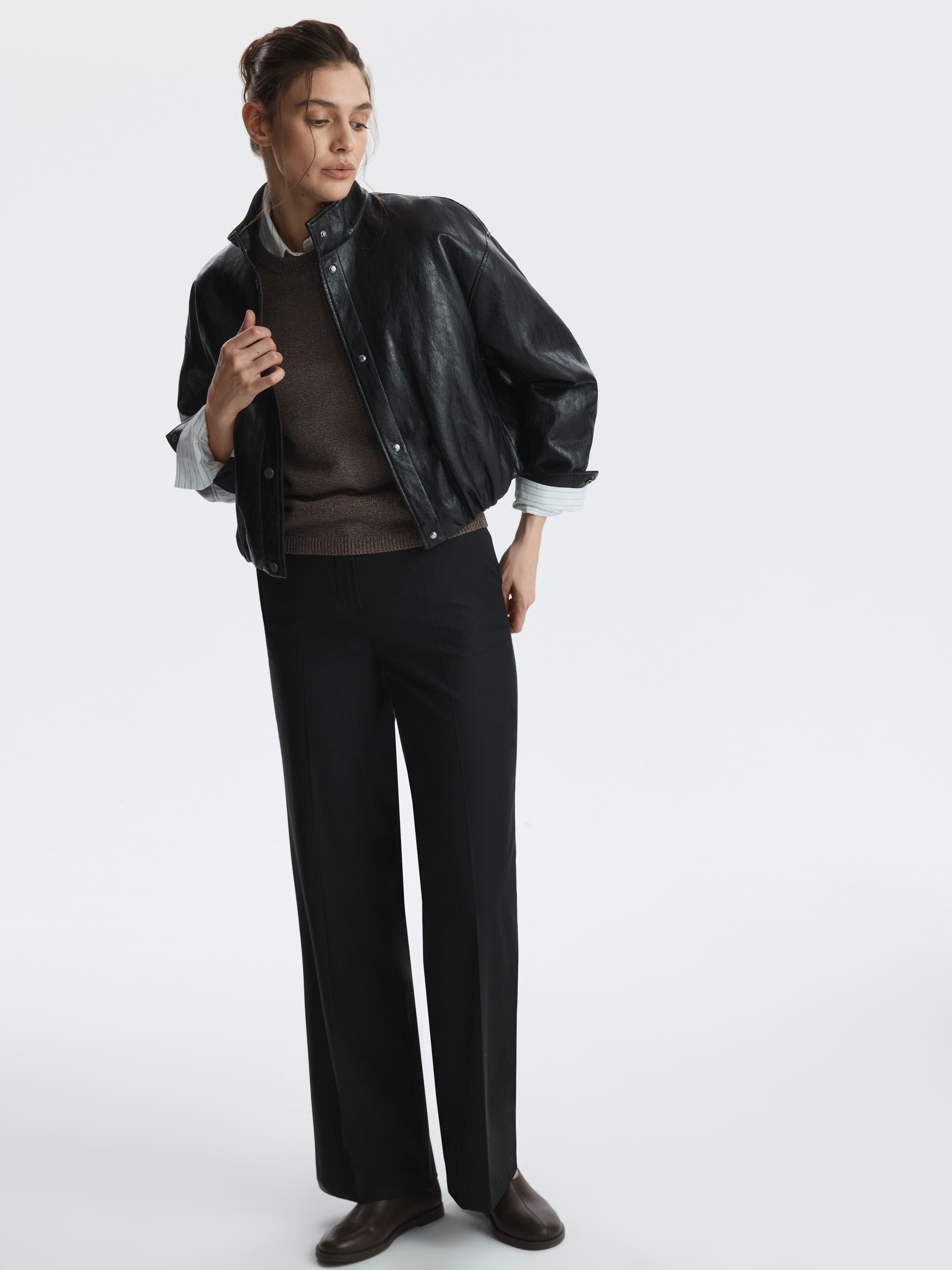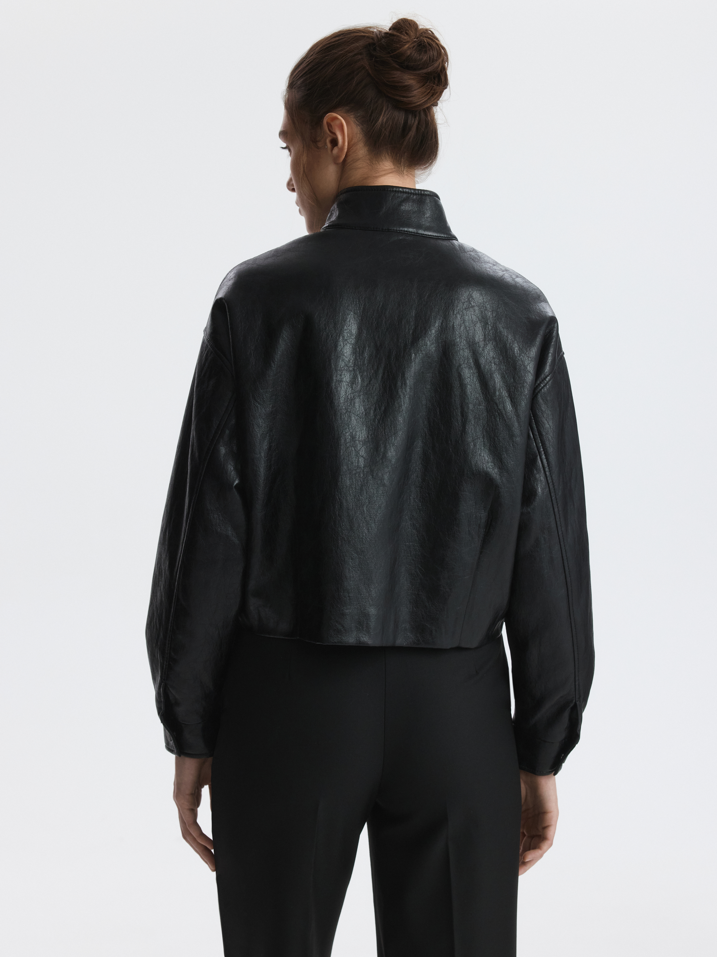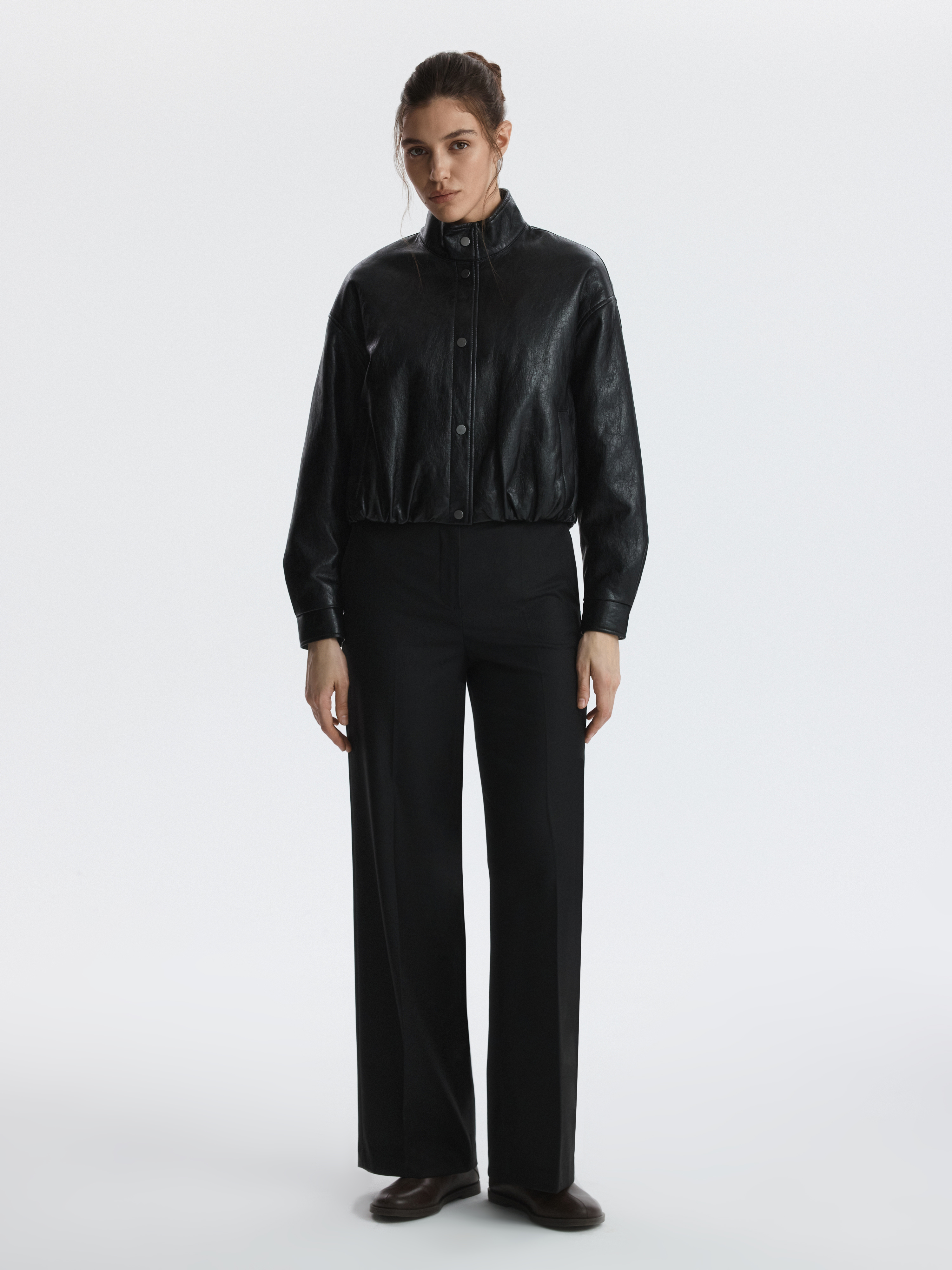 Кожаная куртка сочетает в себе удобный крой и универсальную стилистику, легко вписываясь в повседневные образы. Плотная экокожа с гладкой на ощупь фактурой обладает износоустойчивостью, а тонкий слой утеплителя дарит дополнительный комфорт в прохладную погоду. Модель с мягкой линией плеча расслабленно сидит по фигуре.
