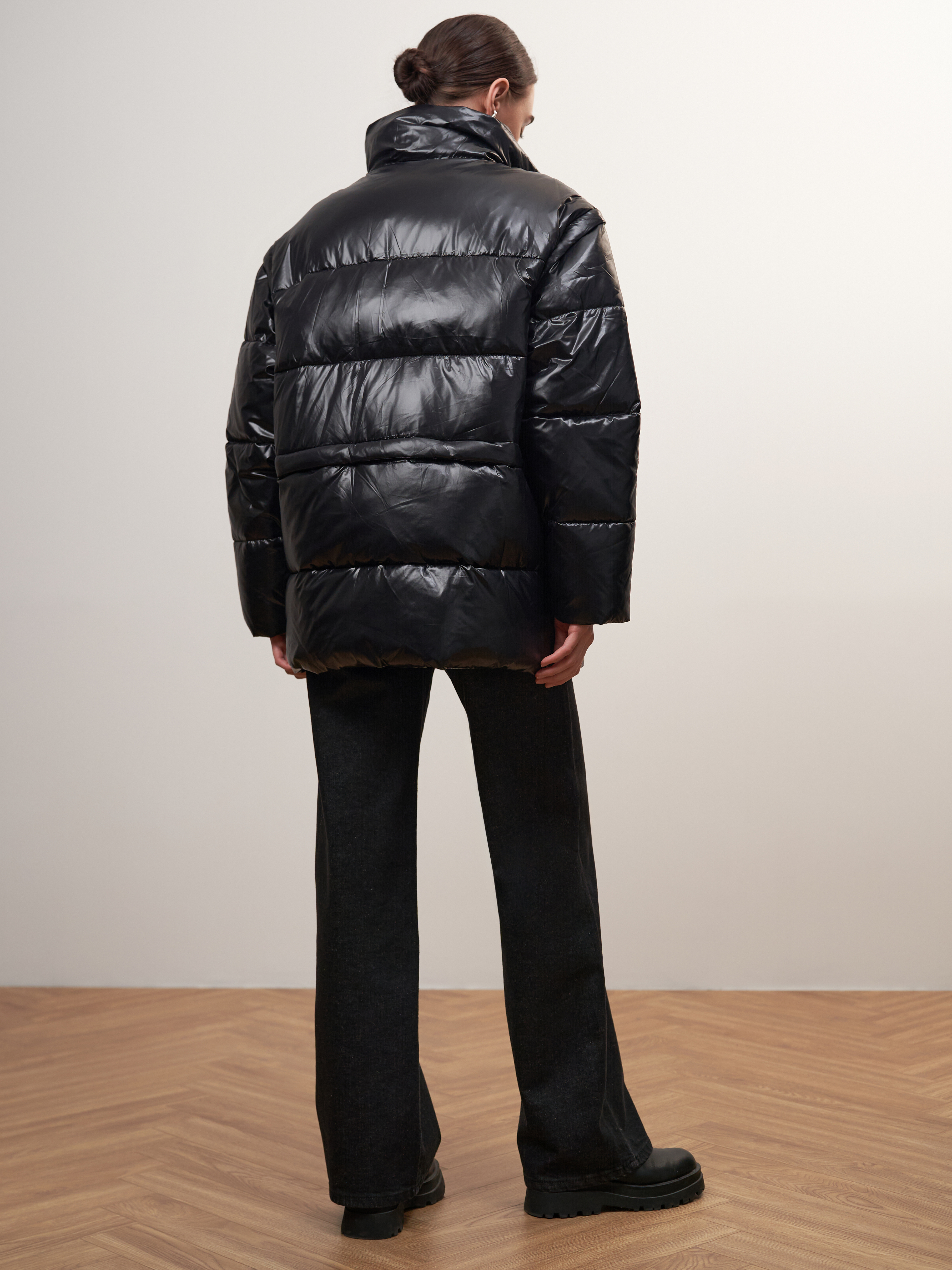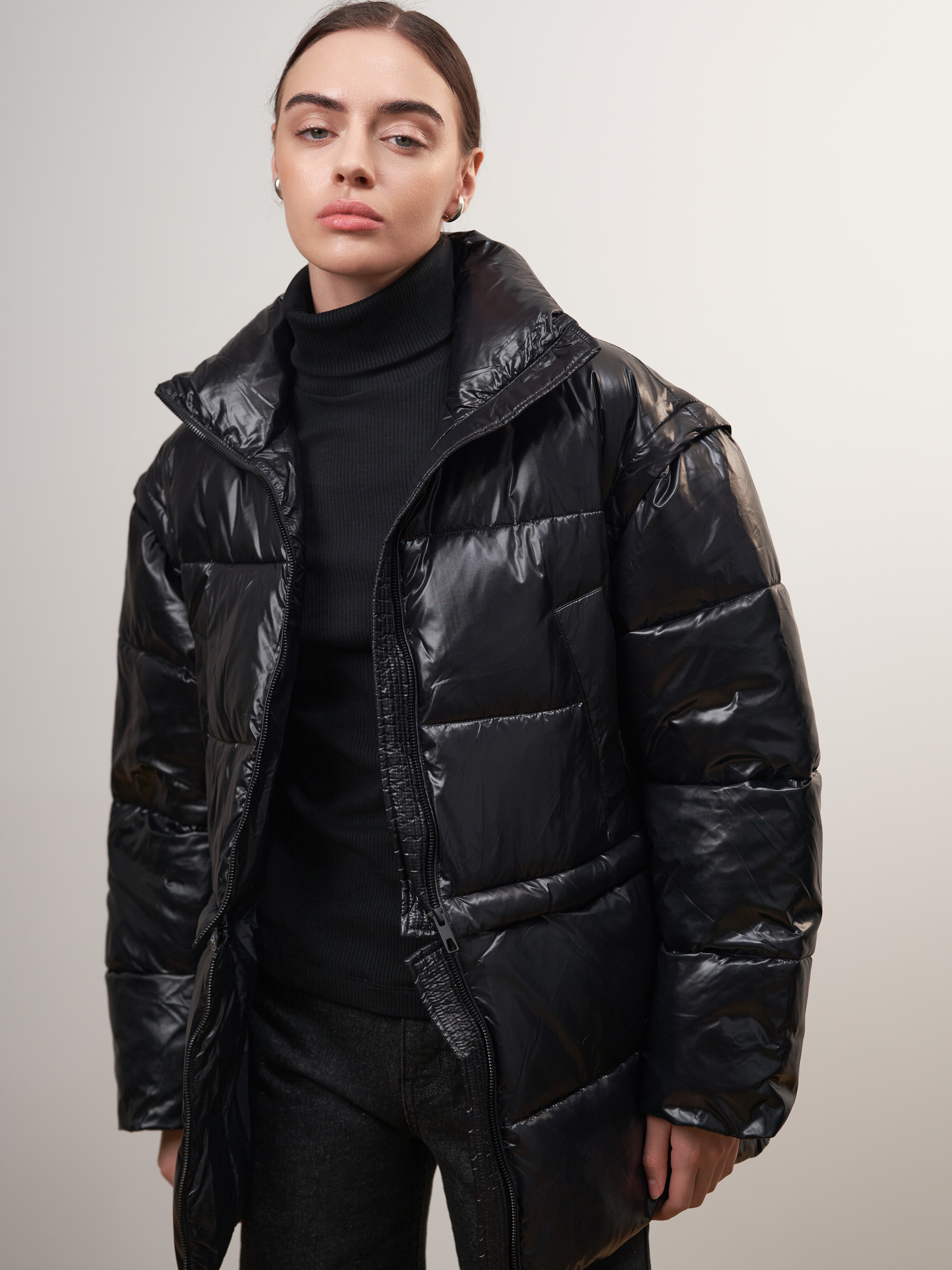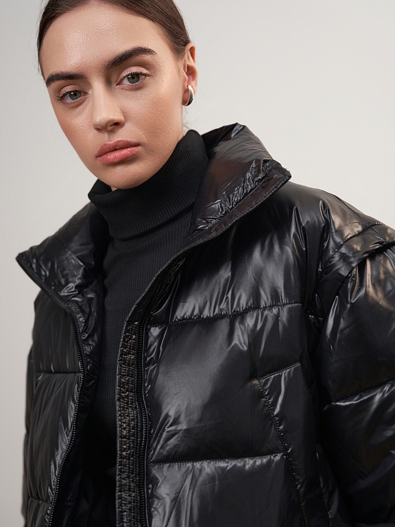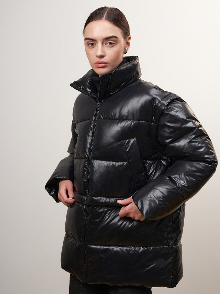 Зимняя куртка оверсайз из непромокаемой ткани не боится снегопадов и сильных морозов. За сохранение тепла отвечает инновационный наполнитель Sorona, который считается аналогом натурального пуха. Он очень легкий, что снижает вес пуховика. Еще одно преимущество модели – съемные рукава на молнии, которые превращают куртку в утепленный жилет (укороченный или до бедра). Внутренние трикотажные манжеты и высокий воротник защищают от продувания.