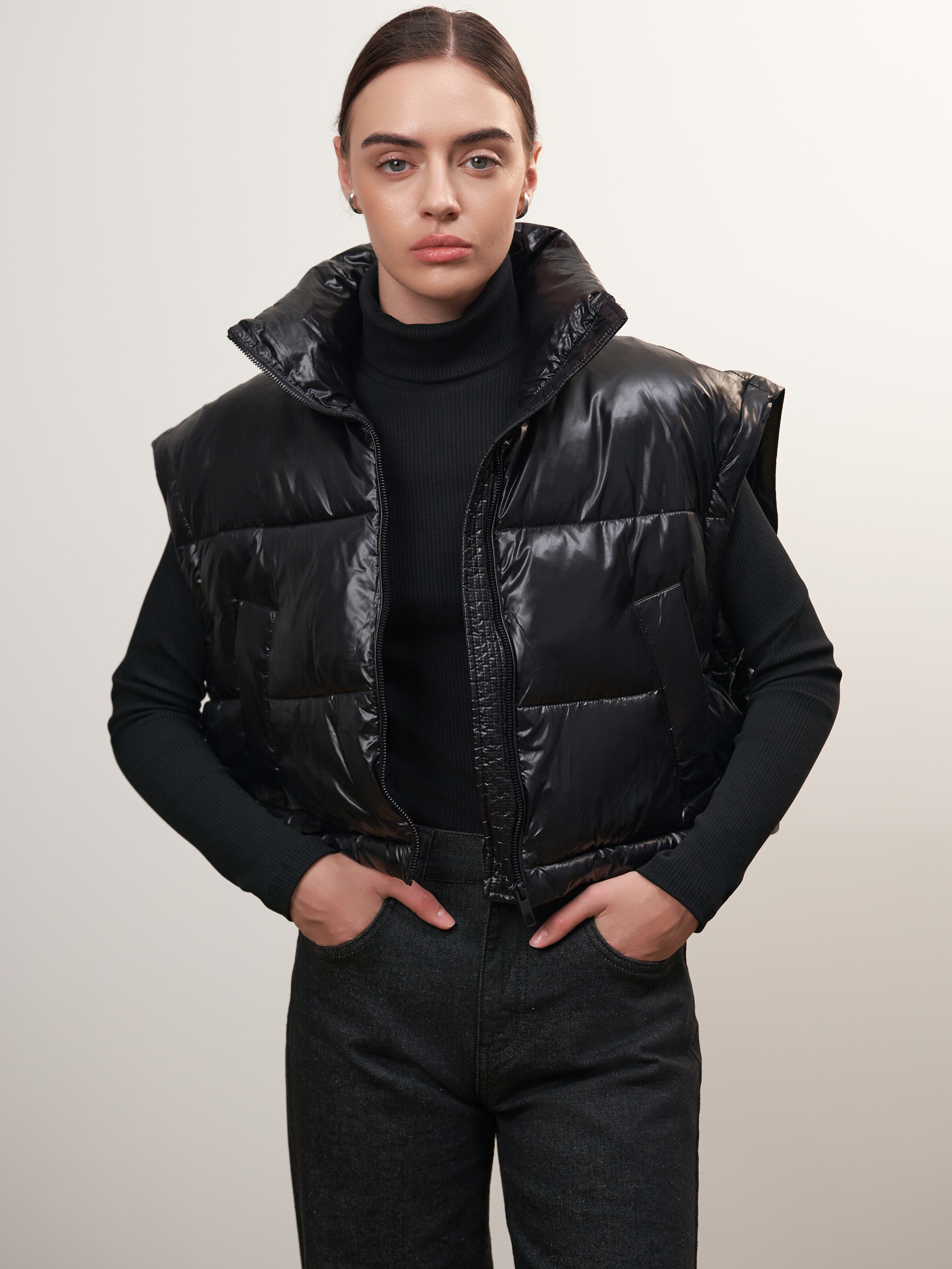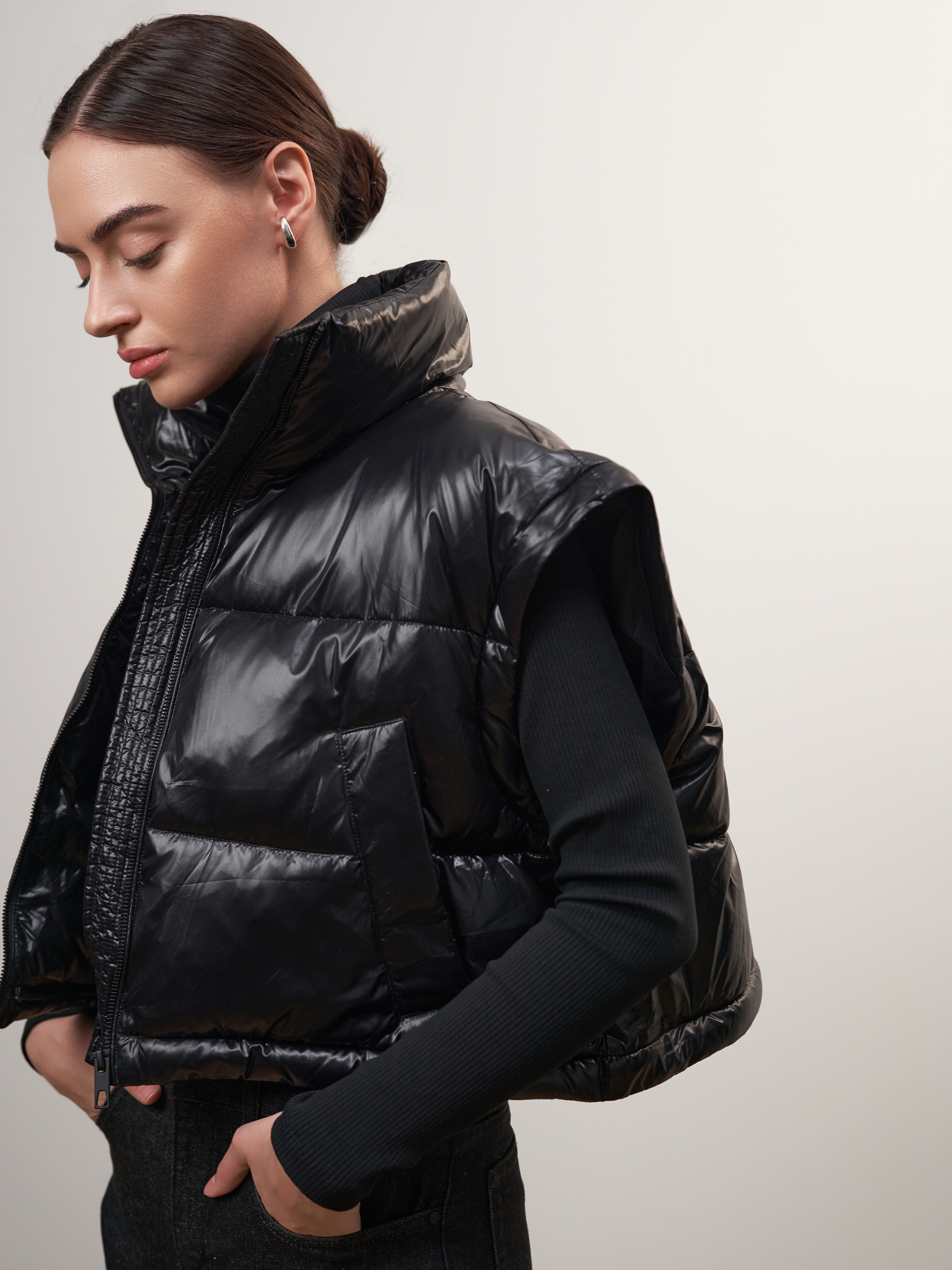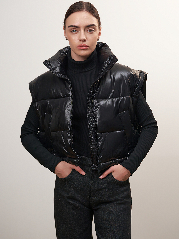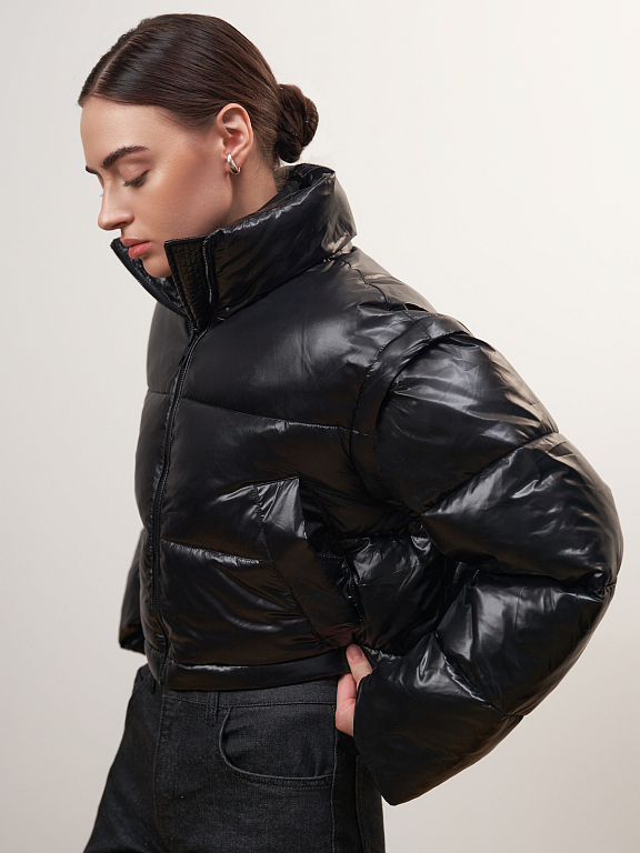 Зимняя куртка оверсайз из непромокаемой ткани не боится снегопадов и сильных морозов. За сохранение тепла отвечает инновационный наполнитель Sorona, который считается аналогом натурального пуха. Он очень легкий, что снижает вес пуховика. Еще одно преимущество модели – съемные рукава на молнии, которые превращают куртку в утепленный жилет (укороченный или до бедра). Внутренние трикотажные манжеты и высокий воротник защищают от продувания.