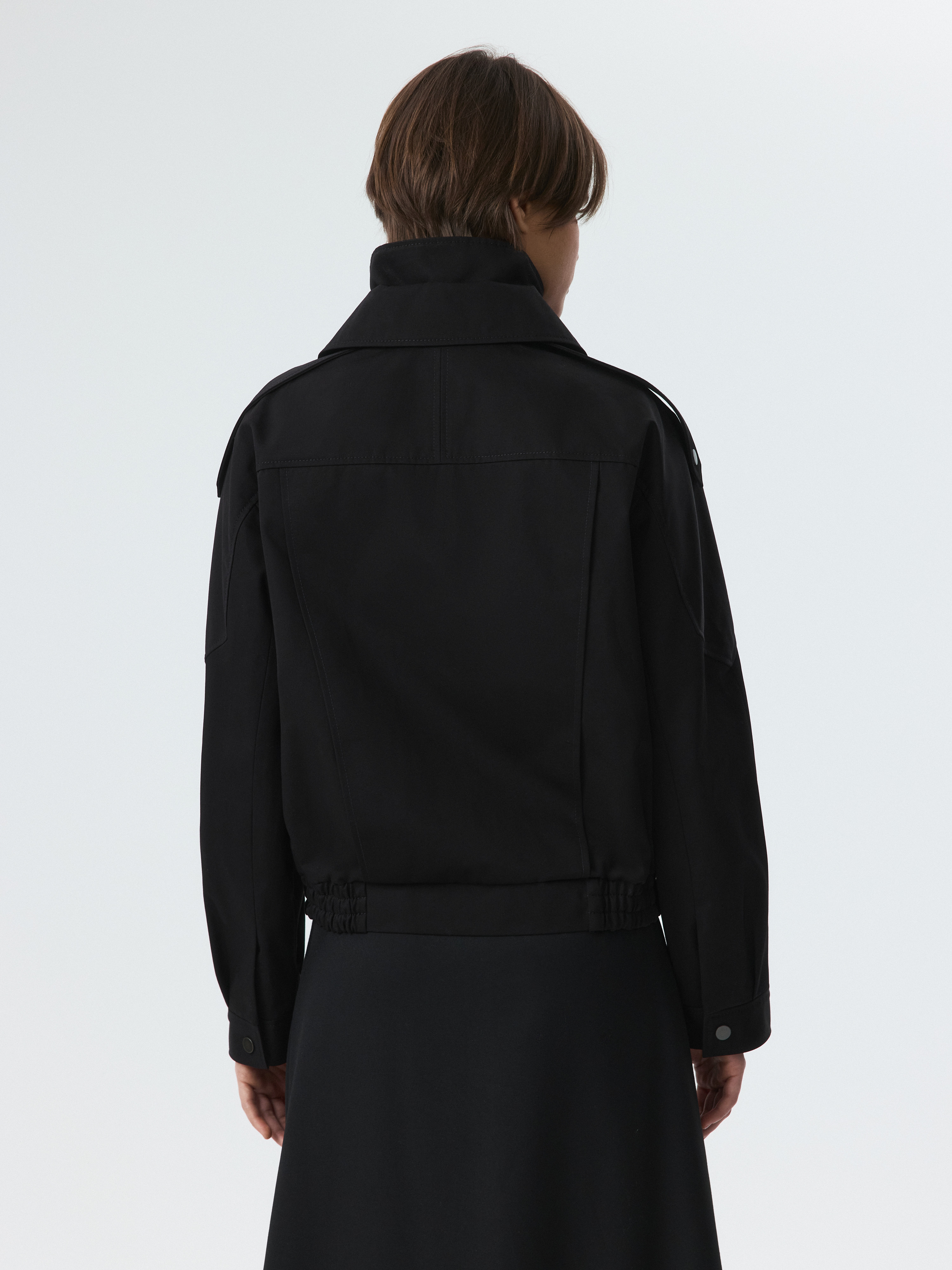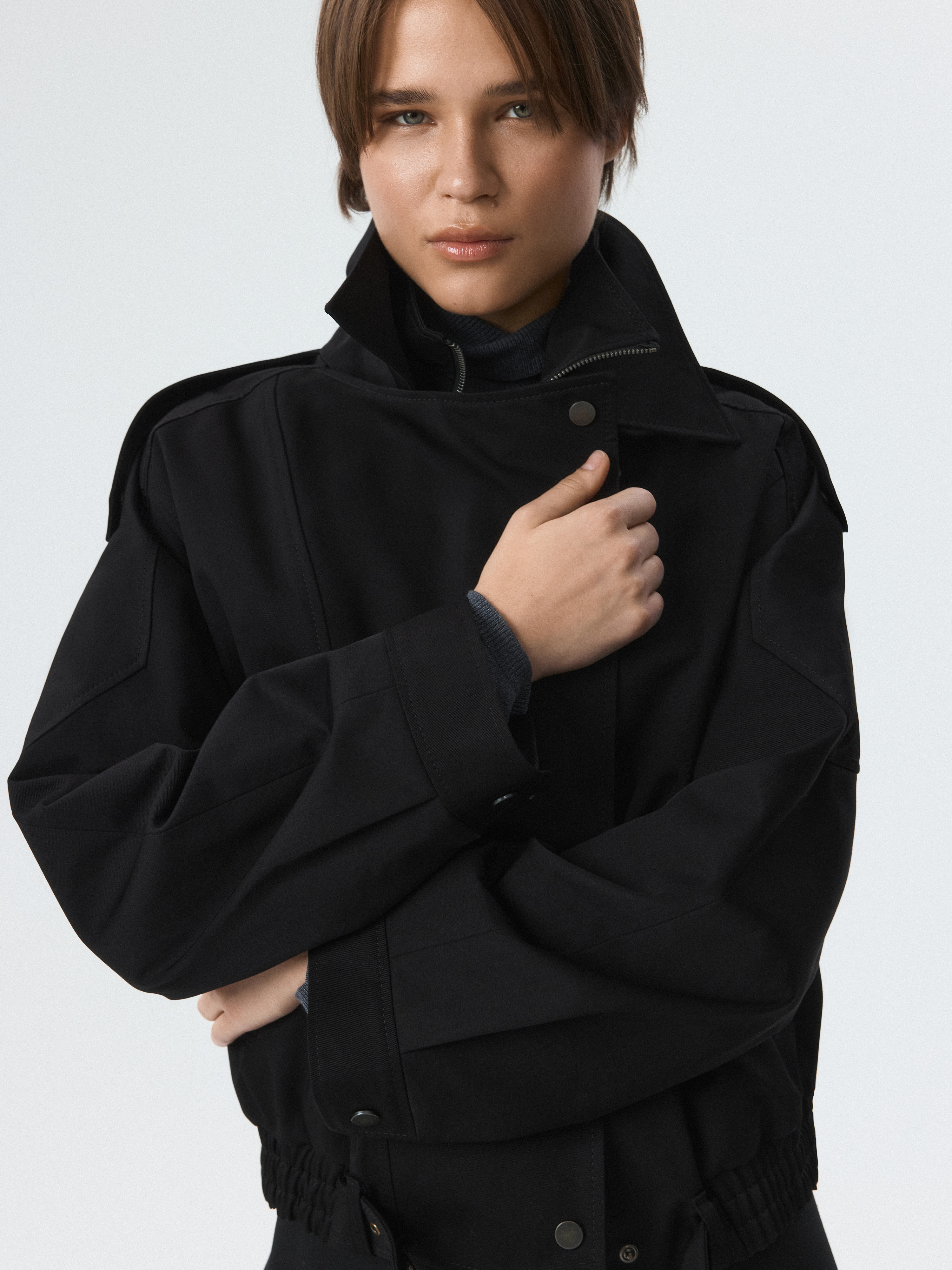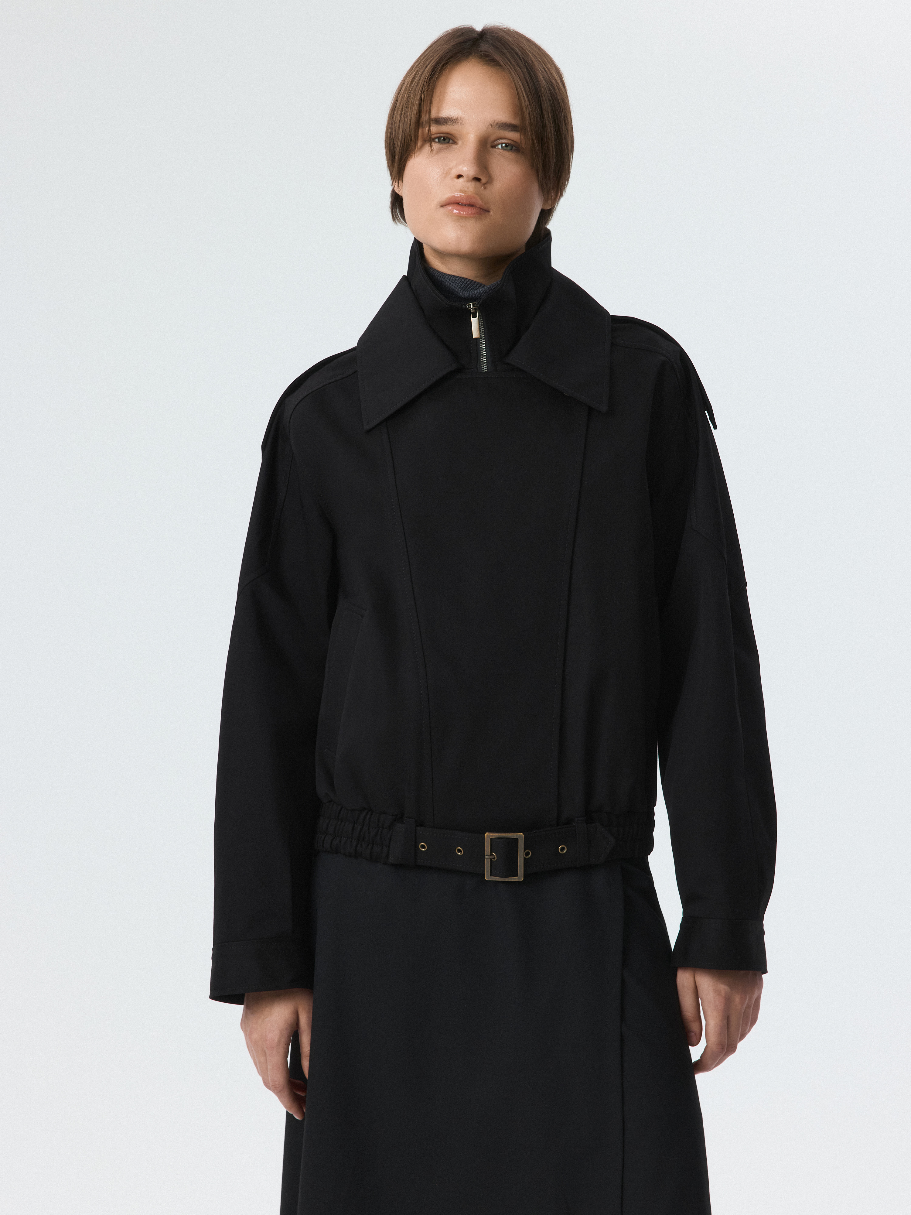 Куртка объемного фасона – практичная модель на демисезон. Плотный габардиновый текстиль из хлопка не продувается и хорошо держит форму, а специальная пропитка отталкивает от поверхности капли. Воротник-стойка дополнительно укроет от ветра. Свободная куртка со спущенной линией плеча расслабленно сидит по фигуре.