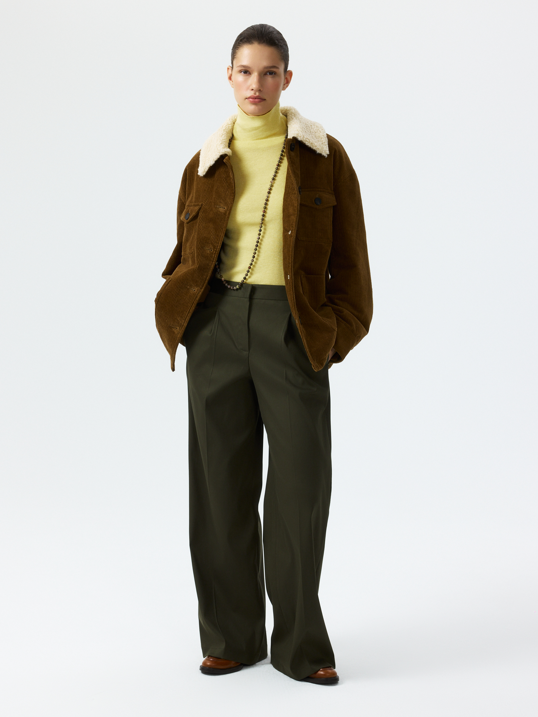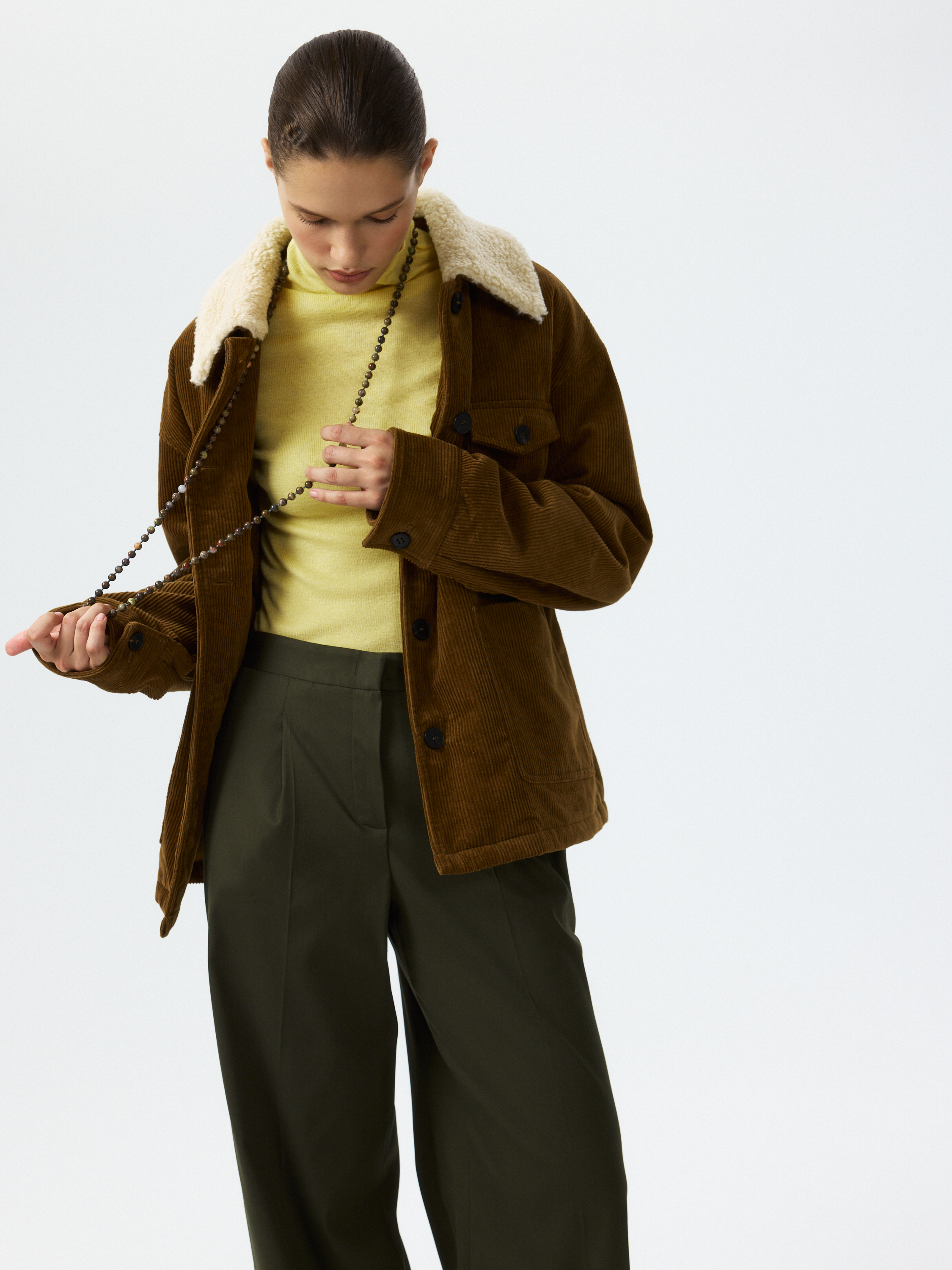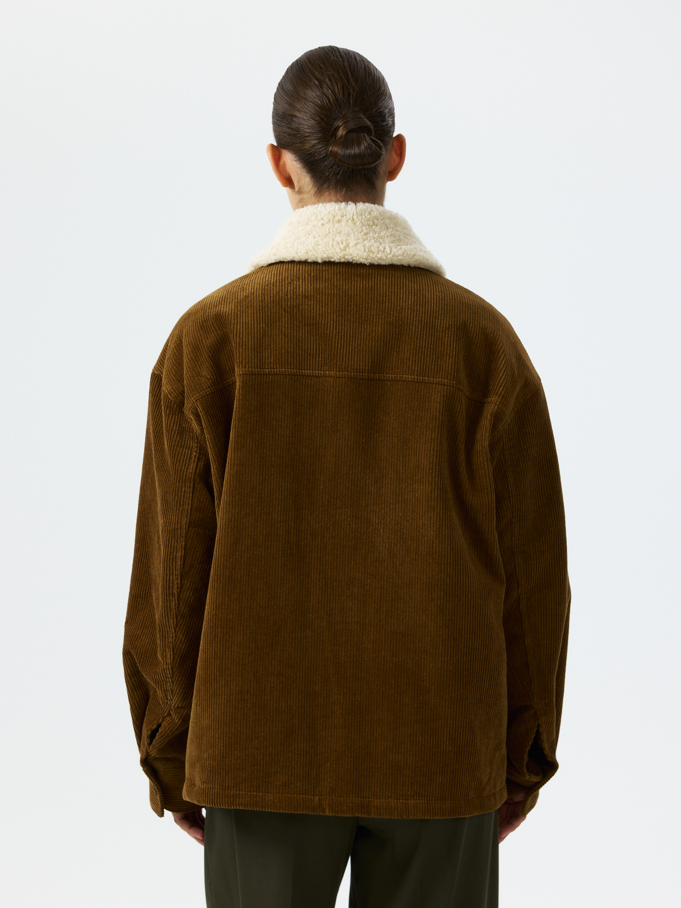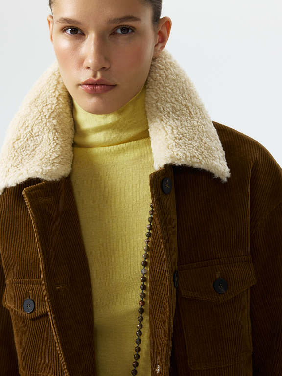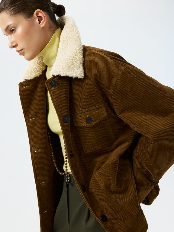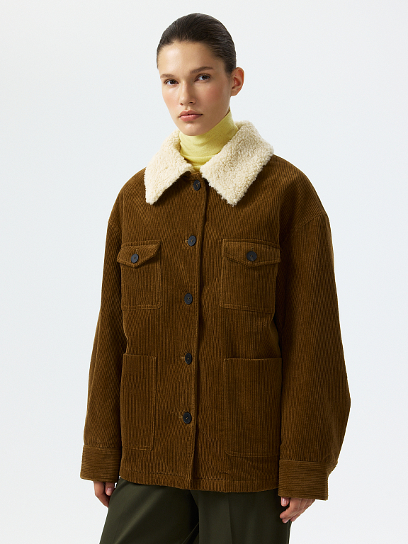 Вельветовая куртка в стиле рабочего идеально подойдет для переменчивой погоды. Плотный текстиль на основе хлопка не продувается и хорошо держит форму, а тонкий слой искусственного наполнителя сохраняет тепло. Модель свободного кроя со спущенной линией плеча расслабленно сидит по фигуре и не сковывает движения. Накладные карманы и оторочка из искусственной овчины делают образ еще более фактурным.