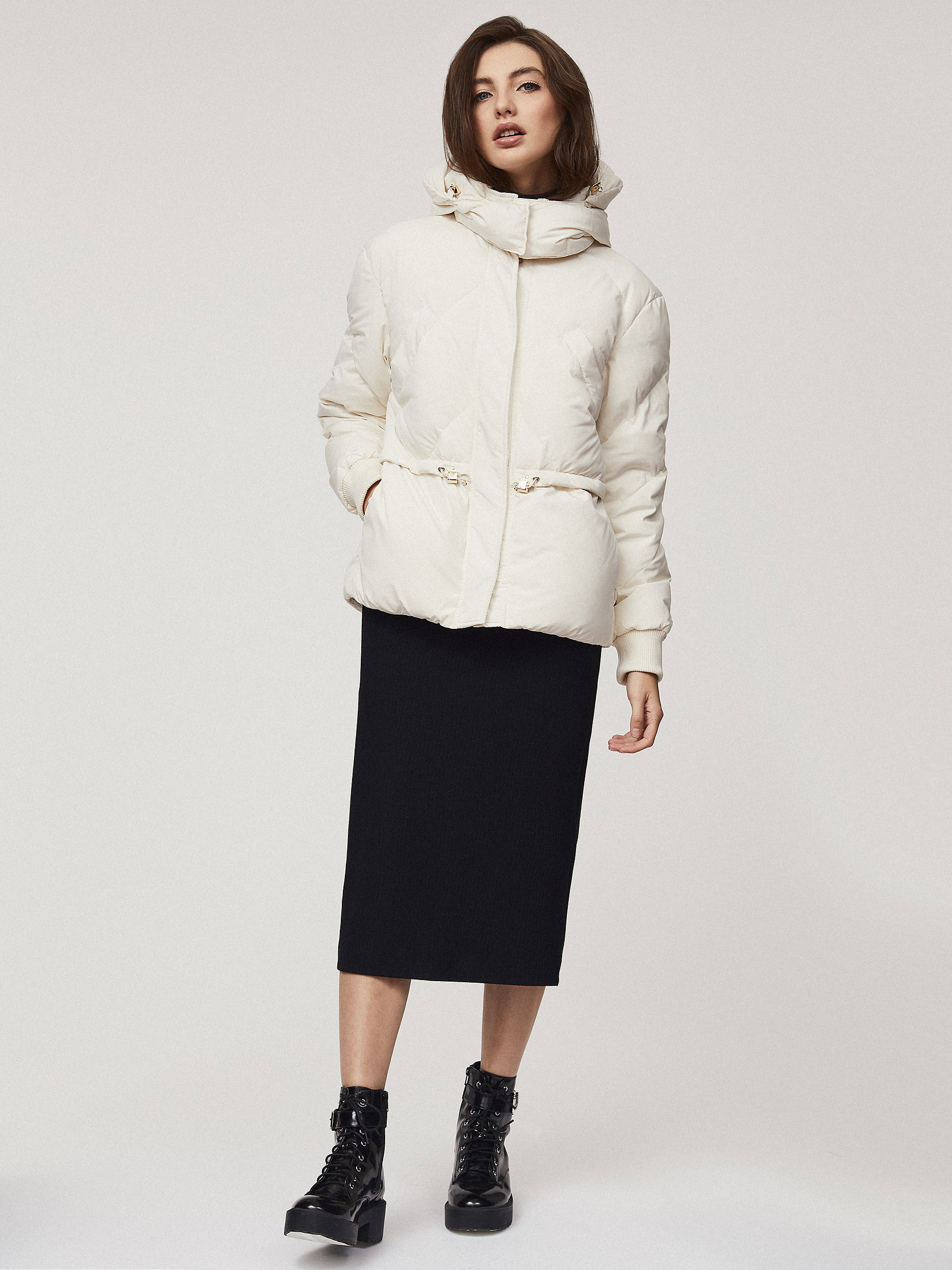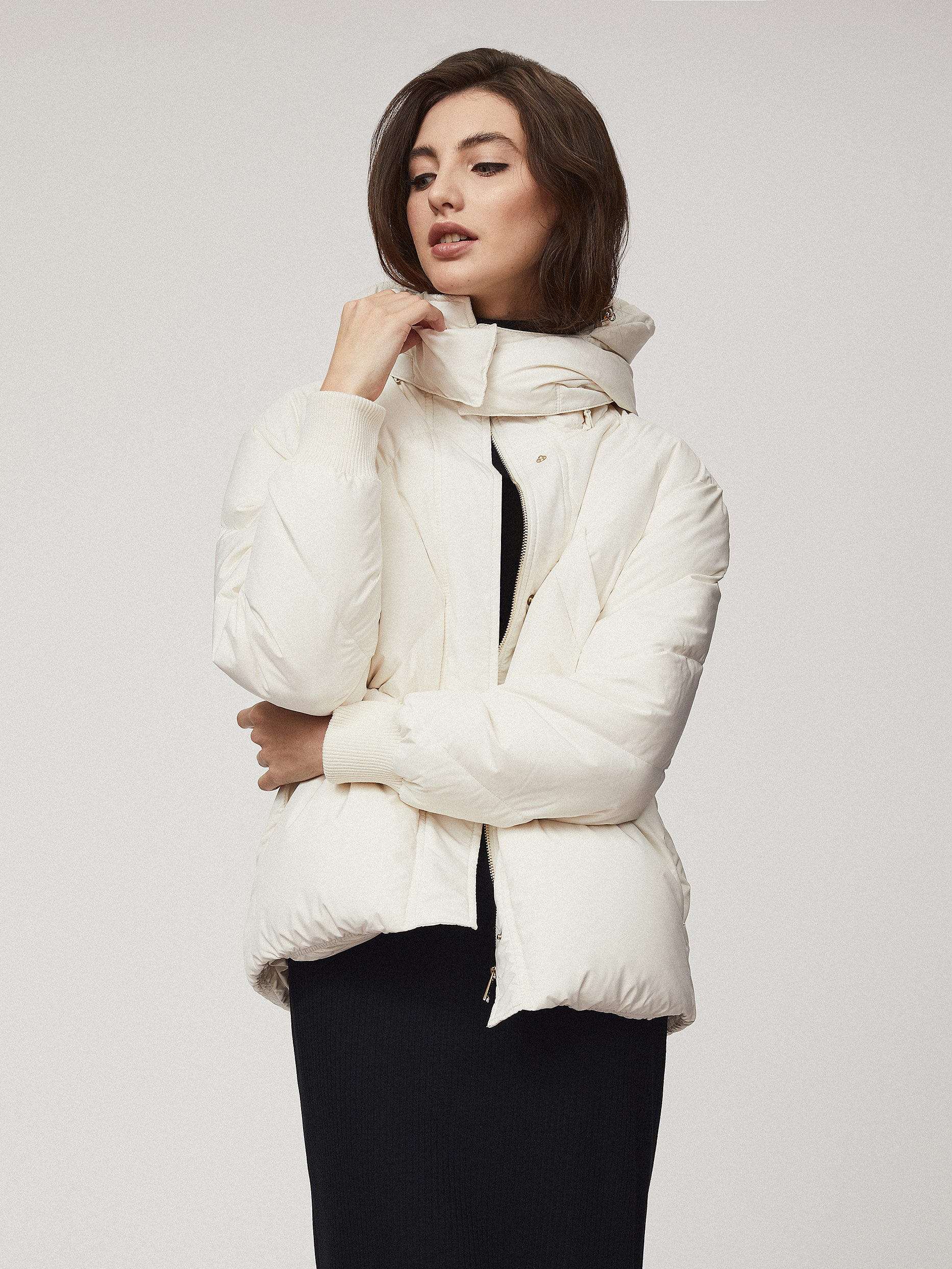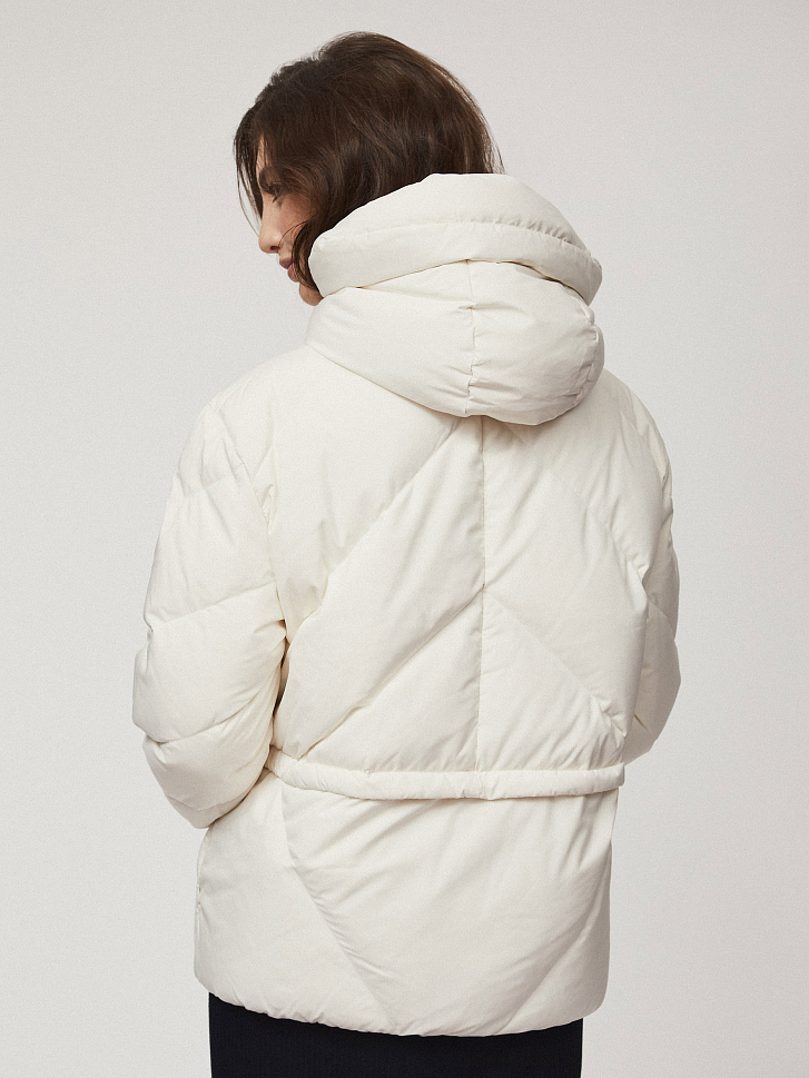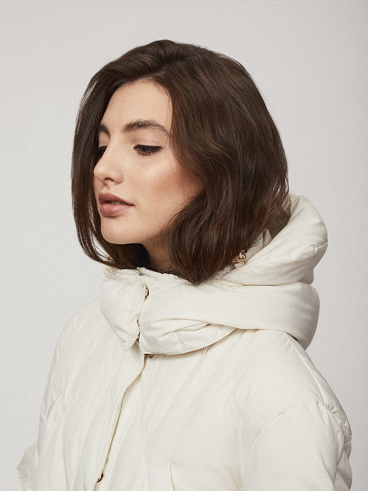 Однотонный укороченный пуховик со съемным капюшоном. Высокий воротник, прорезные нагрудные карманы, карманы в швах на молниях. Возможность регулировать силуэт на талии. Застегивается на молнию и ряд кнопок, скрытых планкой. Наполнитель из натурального пуха.