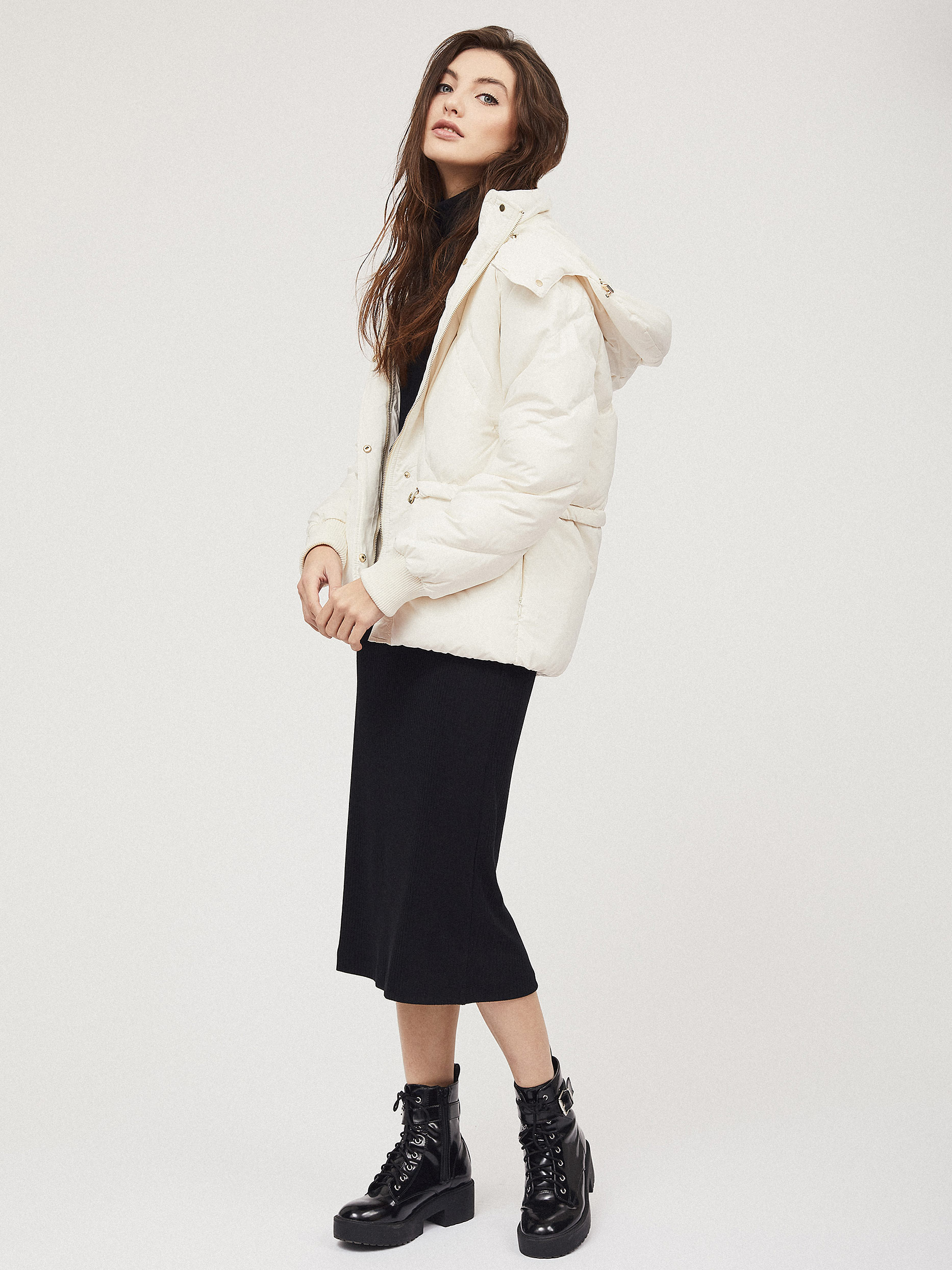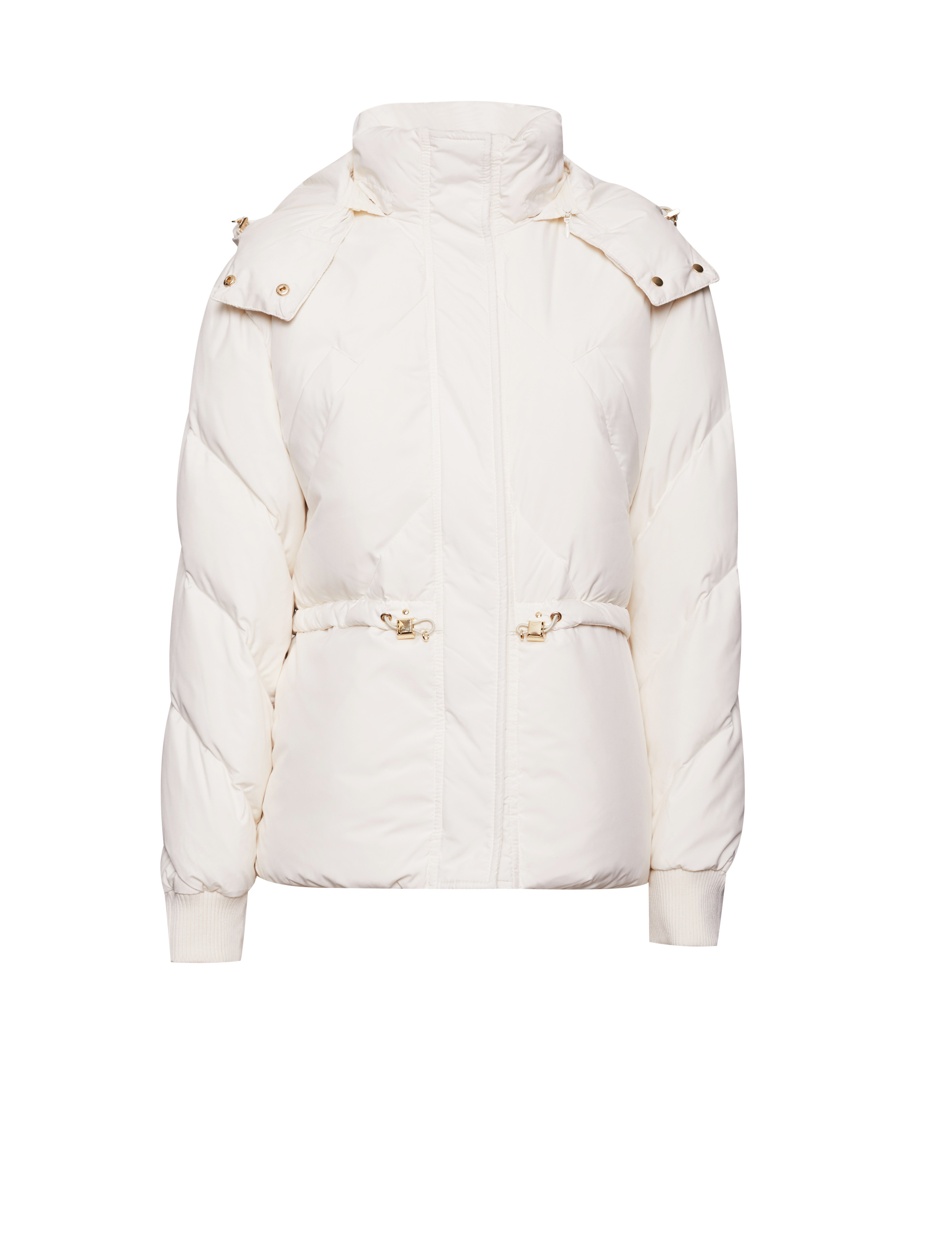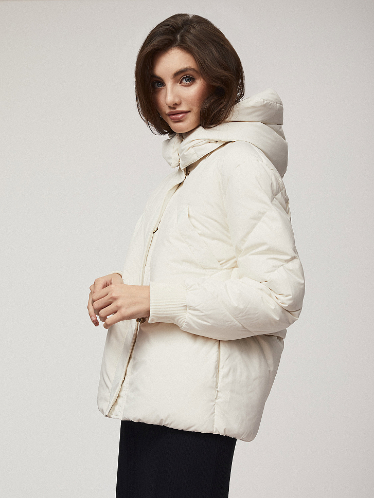 Однотонный укороченный пуховик со съемным капюшоном. Высокий воротник, прорезные нагрудные карманы, карманы в швах на молниях. Возможность регулировать силуэт на талии. Застегивается на молнию и ряд кнопок, скрытых планкой. Наполнитель из натурального пуха.
