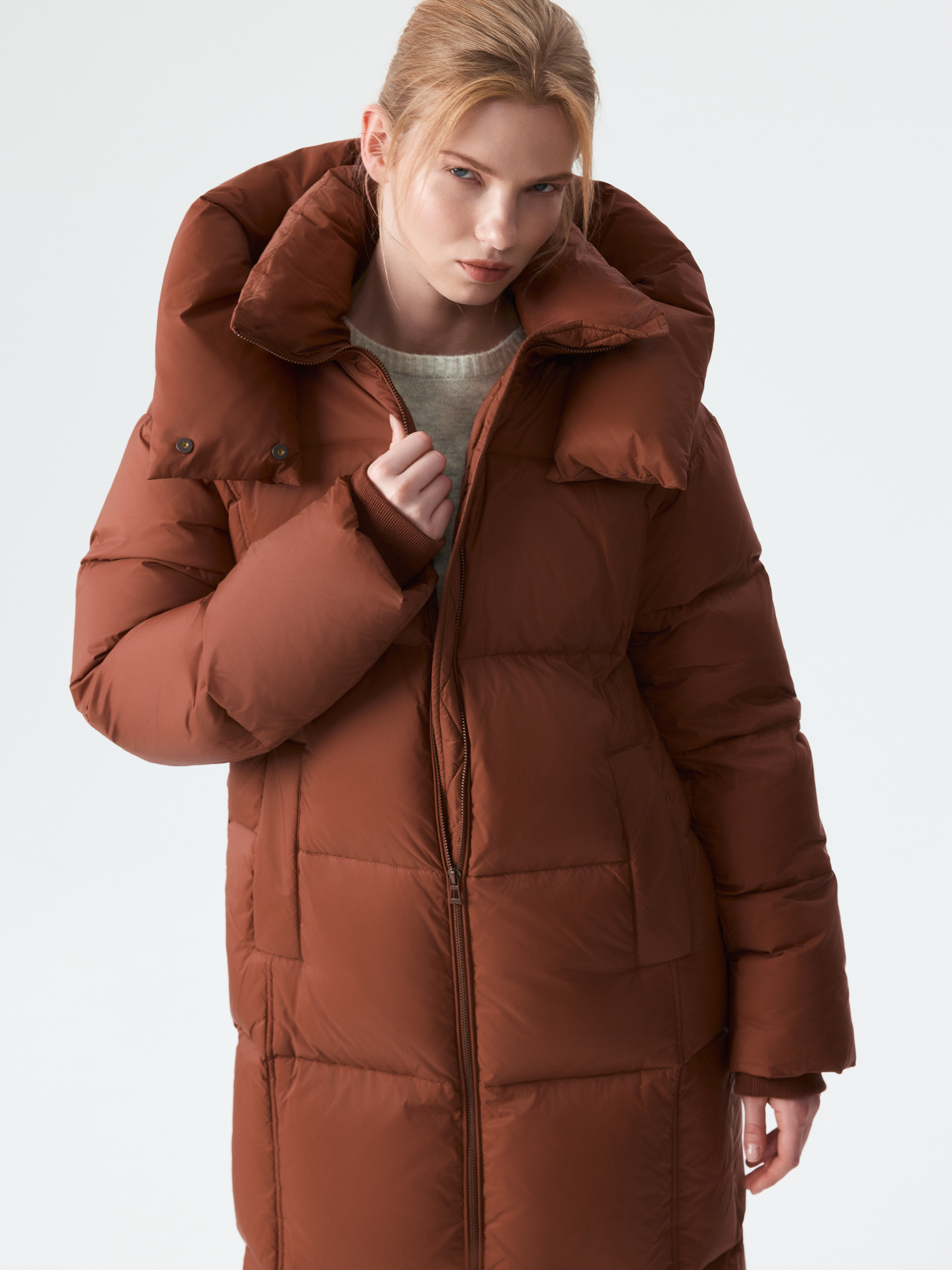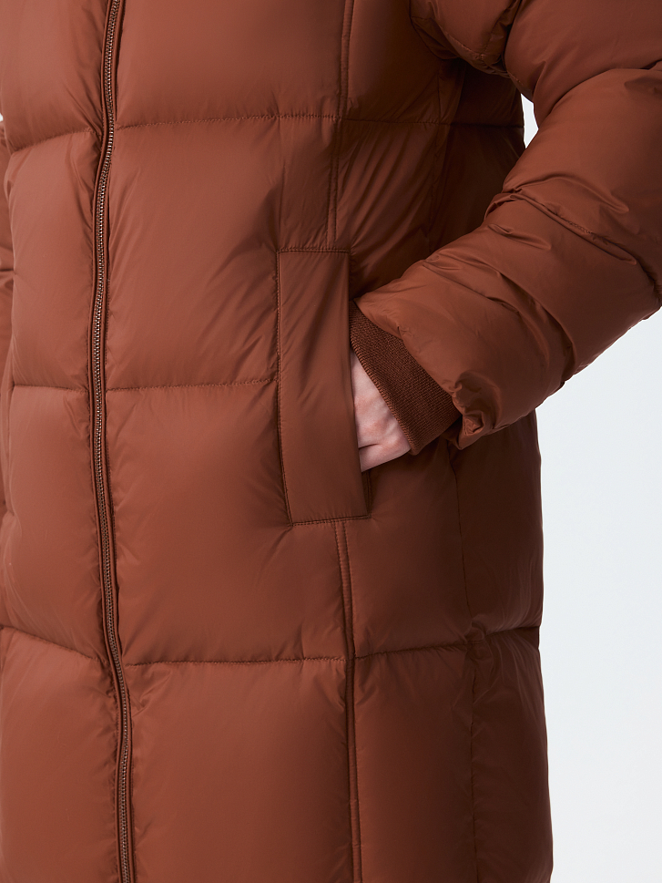 Длинный пуховик станет незаменимым предметом зимнего гардероба, который легко сочетать даже с платьями и юбками. Модель утеплена натуральным утиным пухом и пером, которые предотвращают проникновение холода внутрь и удерживают тепло тела, при этом сохраняя легкость. Ткань верха обладает водоотталкивающими свойствами благодаря специальной пропитке. Съемный капюшон и трикотажные манжеты дополнительно защитят от продувания.