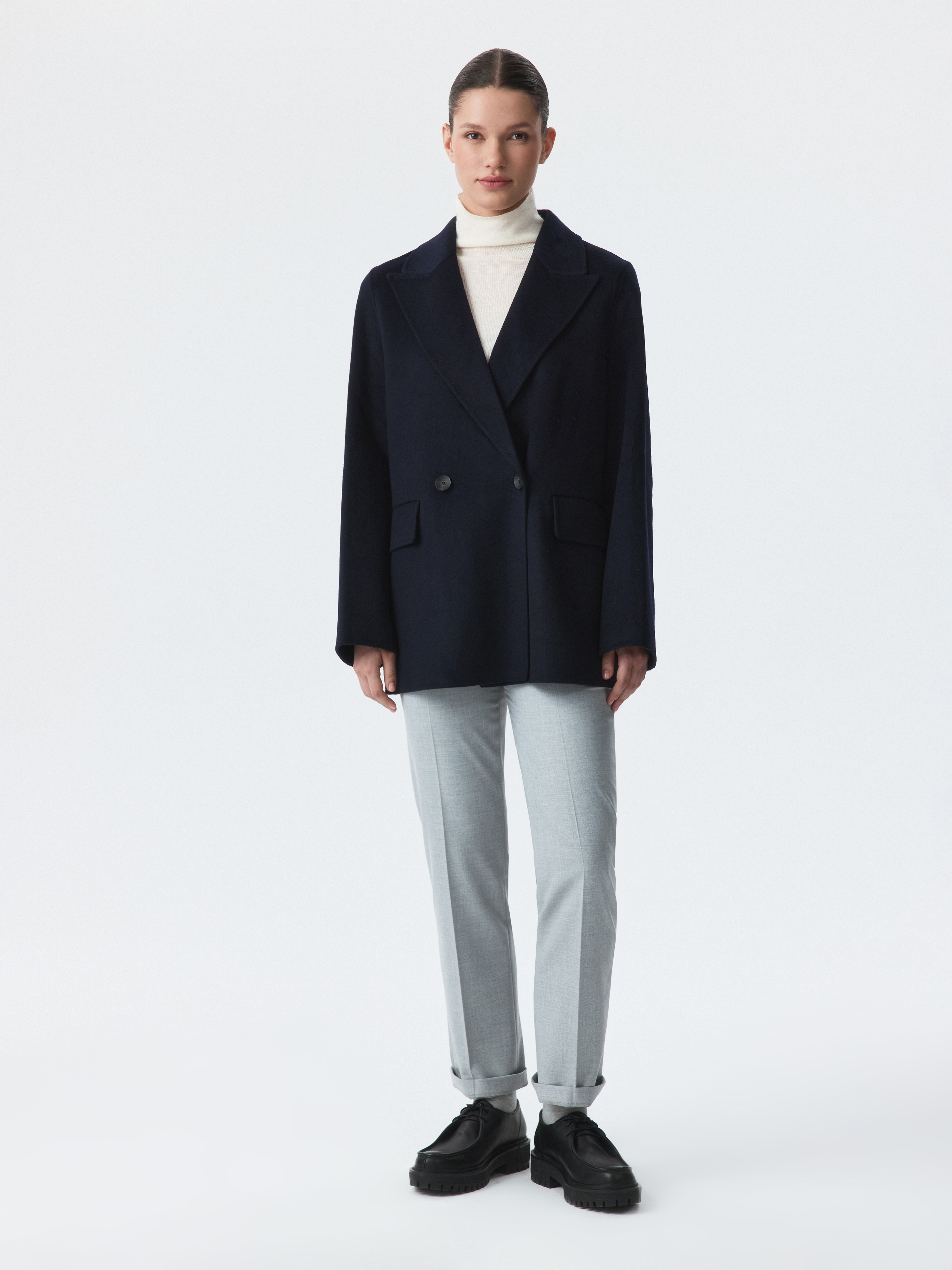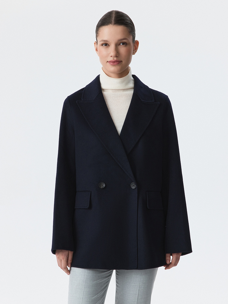Пальто-жакет на двубортной застежке с мягким расслабленным силуэтом. Плотный драповый текстиль наполовину состоит из натуральной шерсти, которая хорошо согревает и не продувается, а искусственные волокна придают износоустойчивости