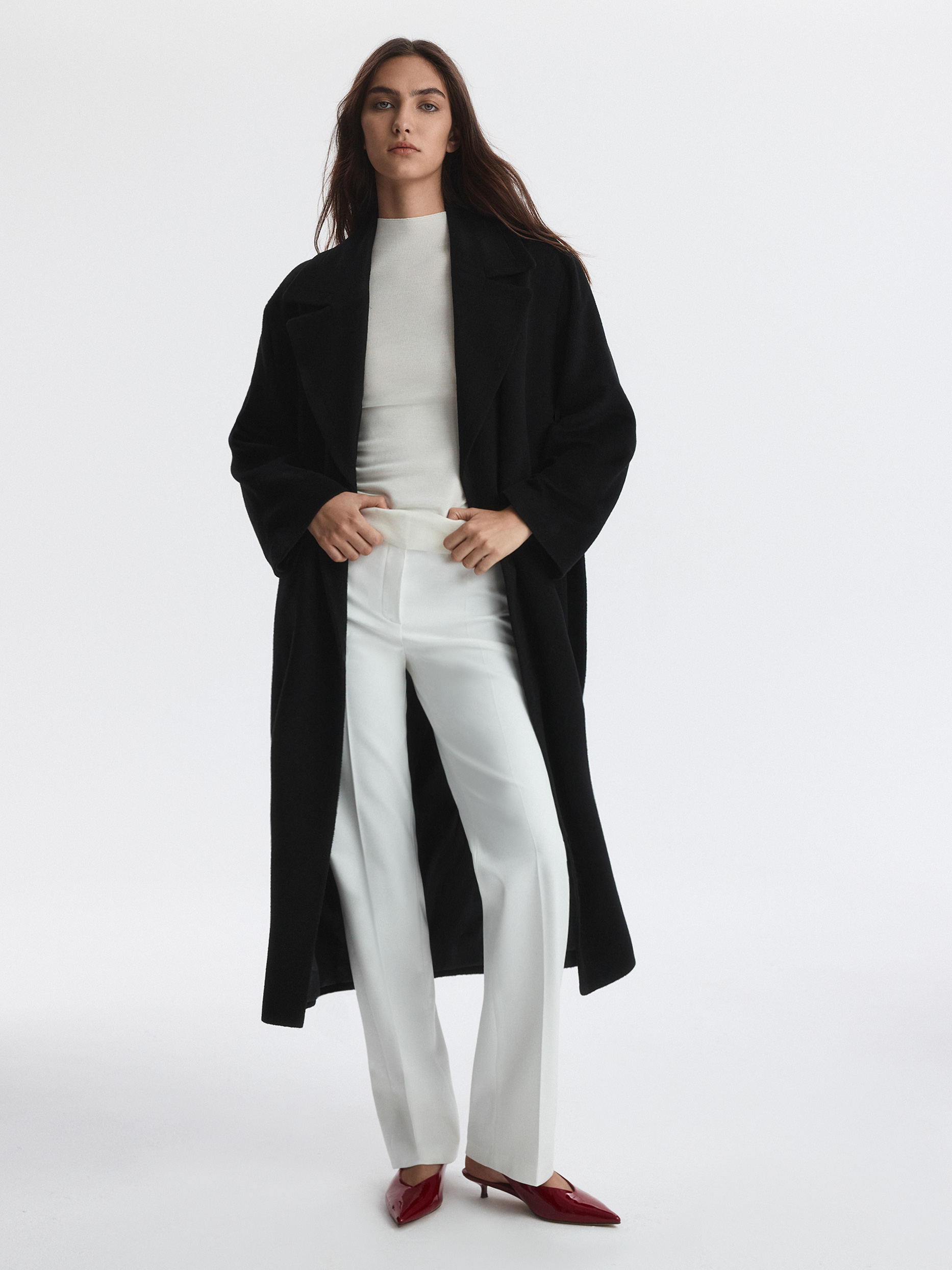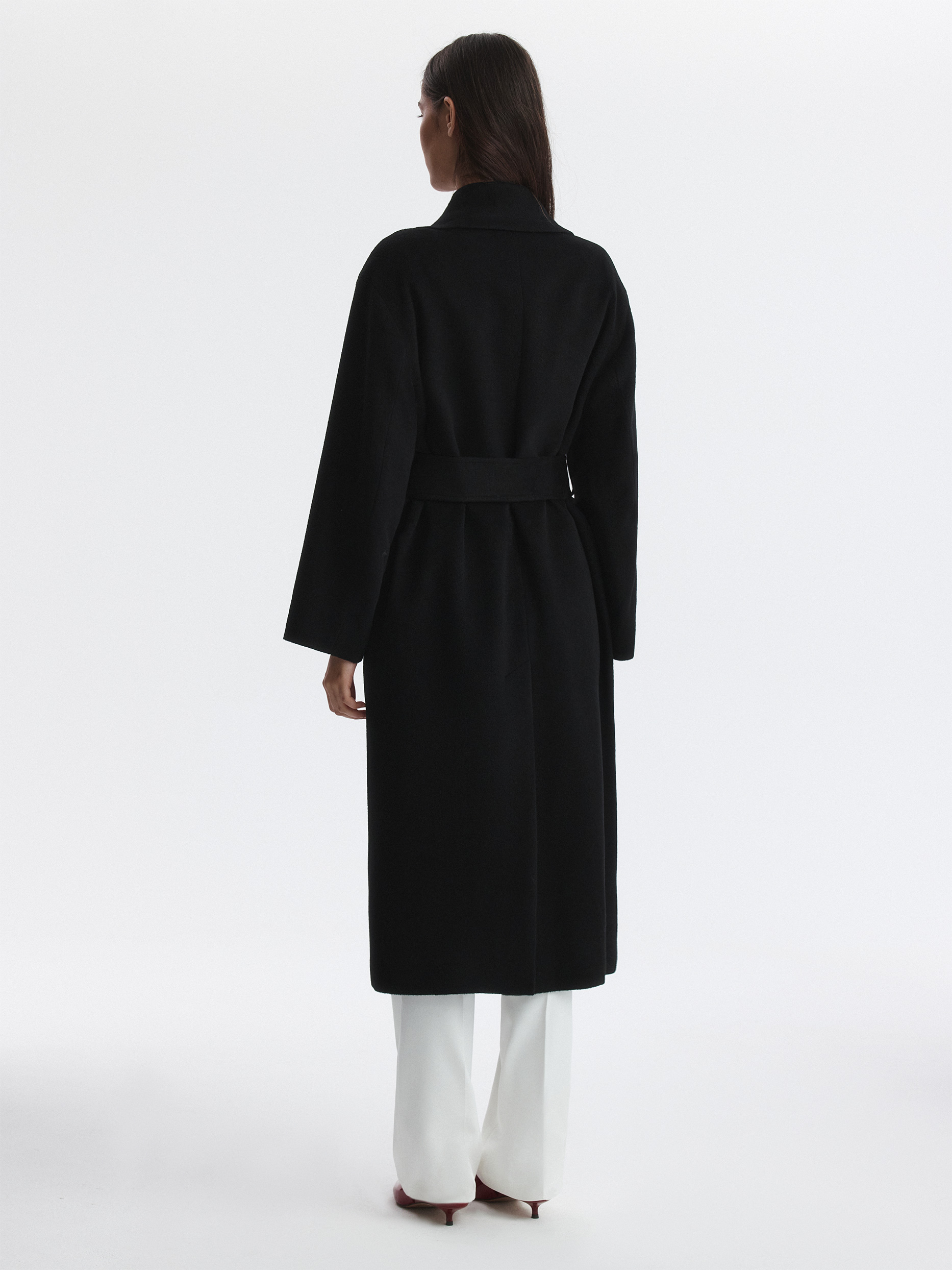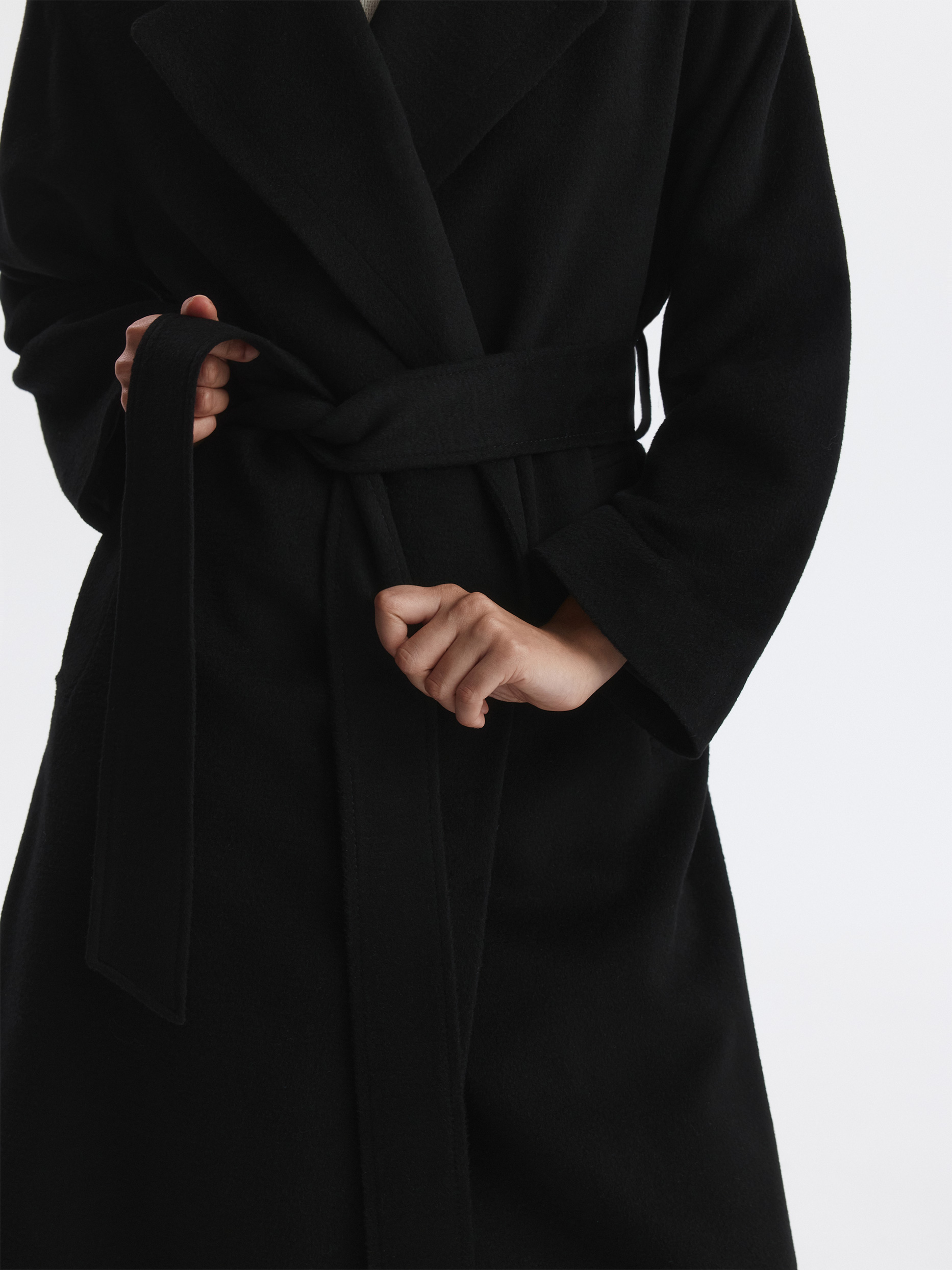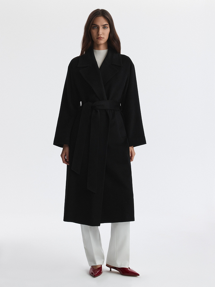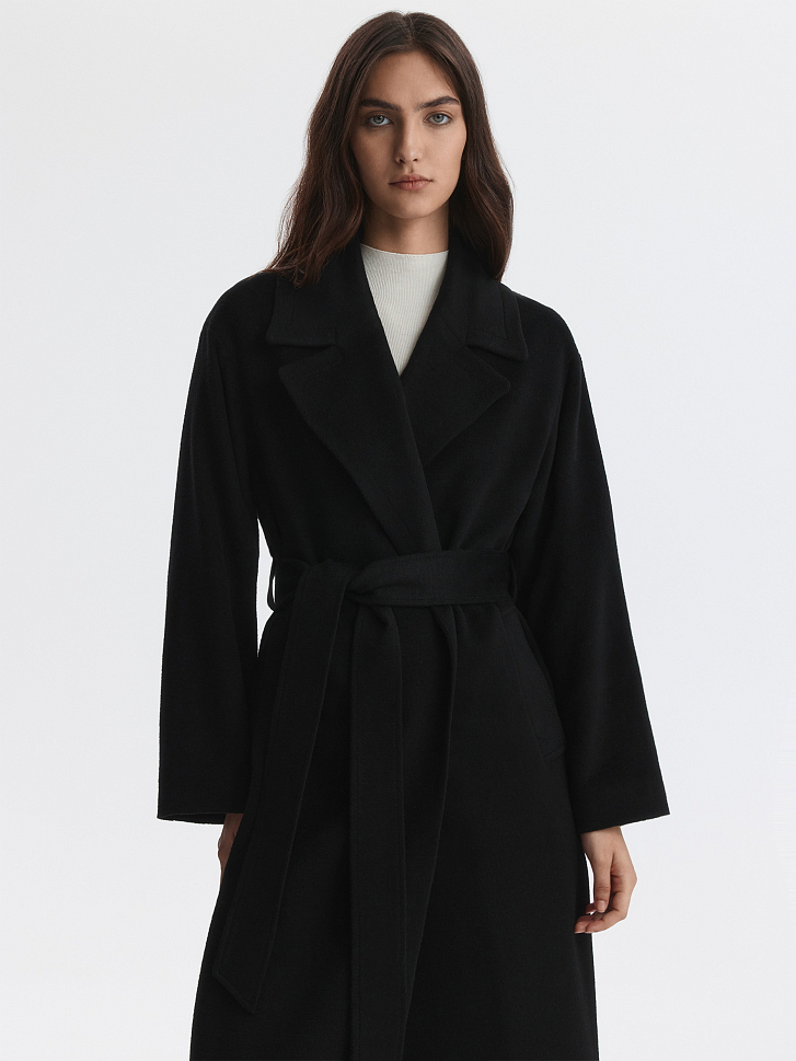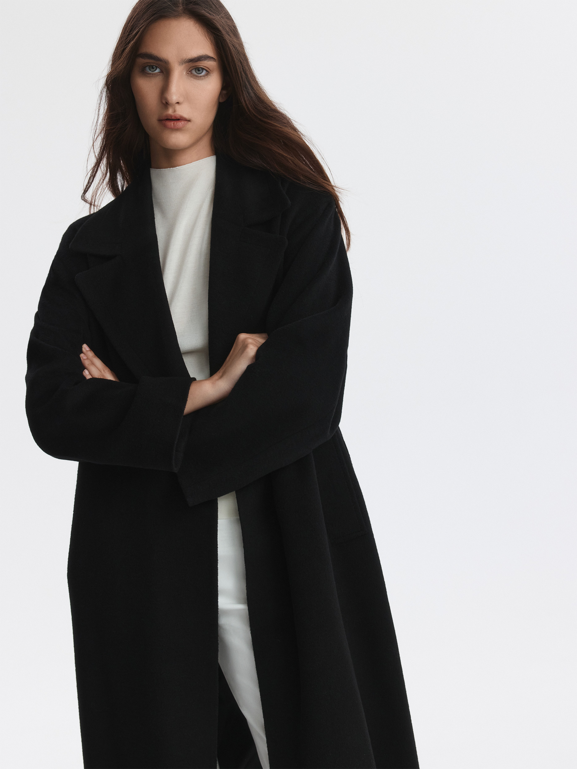 Пальто свободного кроя на запах создает элегантный и расслабленный силуэт. Драповый текстиль средней плотности наполовину состоит из натуральной шерсти, которая хорошо сохраняет тепло, а искусственные волокна придают прочности. Такой материал не скатывается и превосходно сохраняет внешний вид.