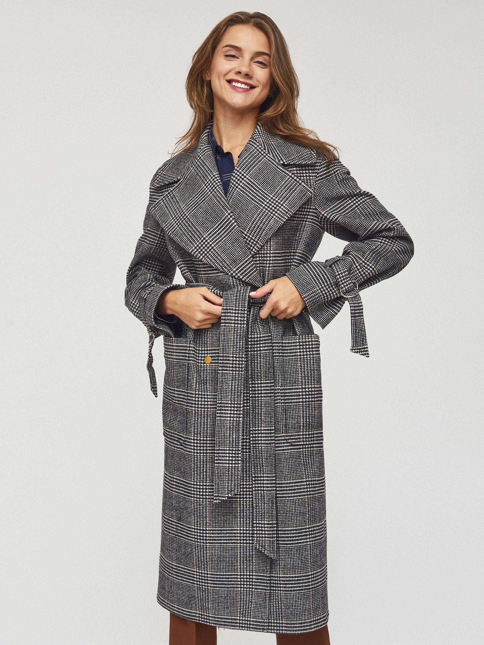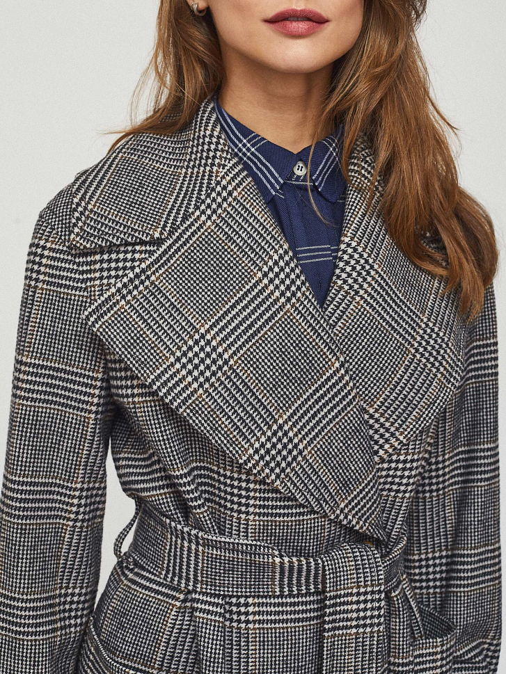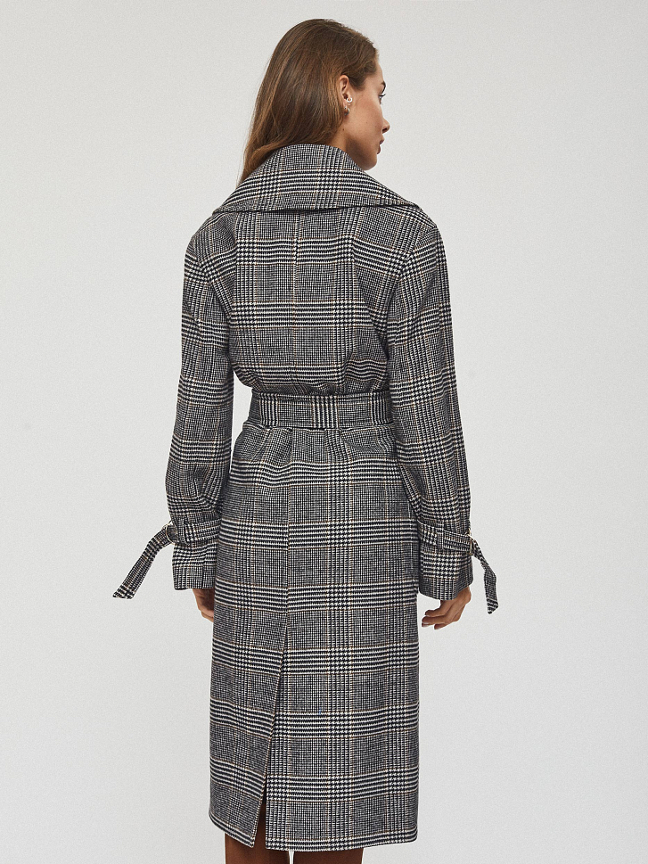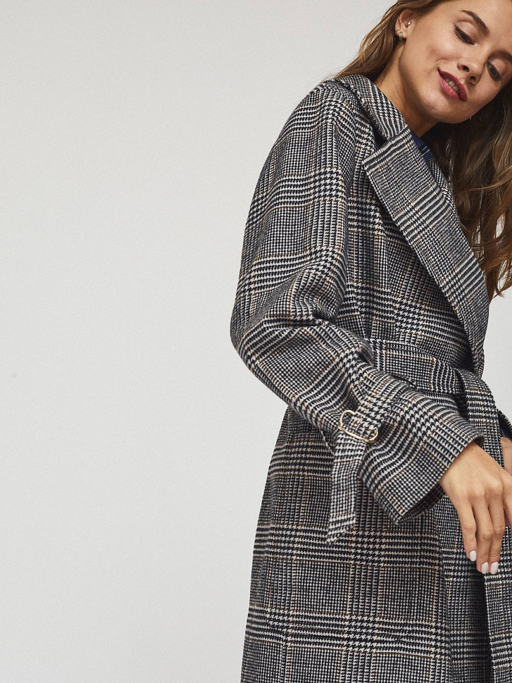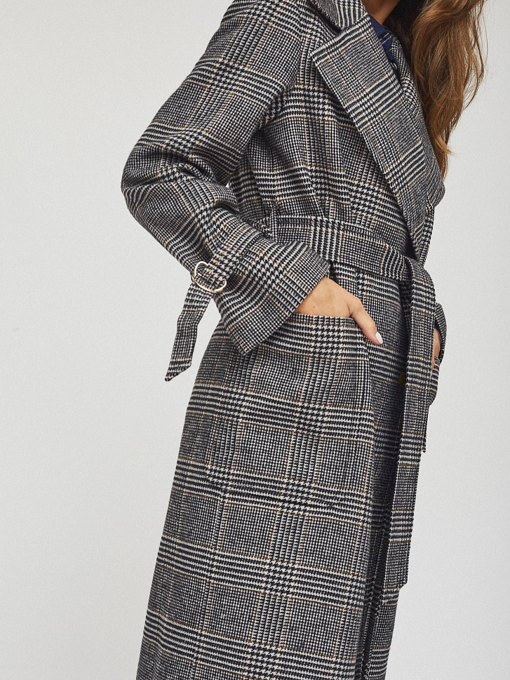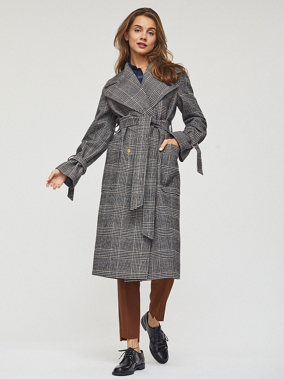 Пальто на запах длины миди. Крупные накладные карманы, пояс-хомут, широкие рукава с ремешками из этой же ткани, шлица. Застегивается на металлические кнопки. Изделие на подкладке.