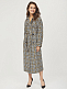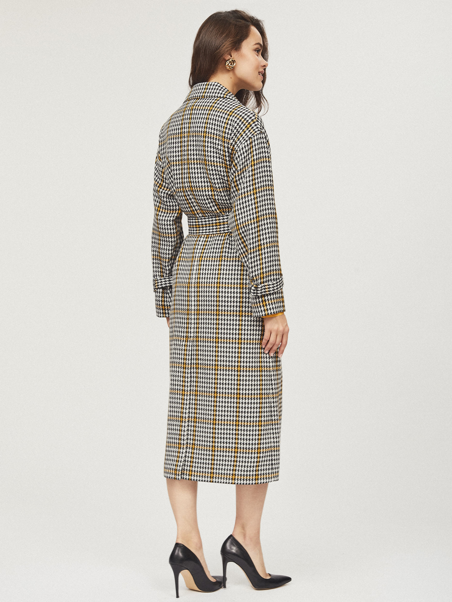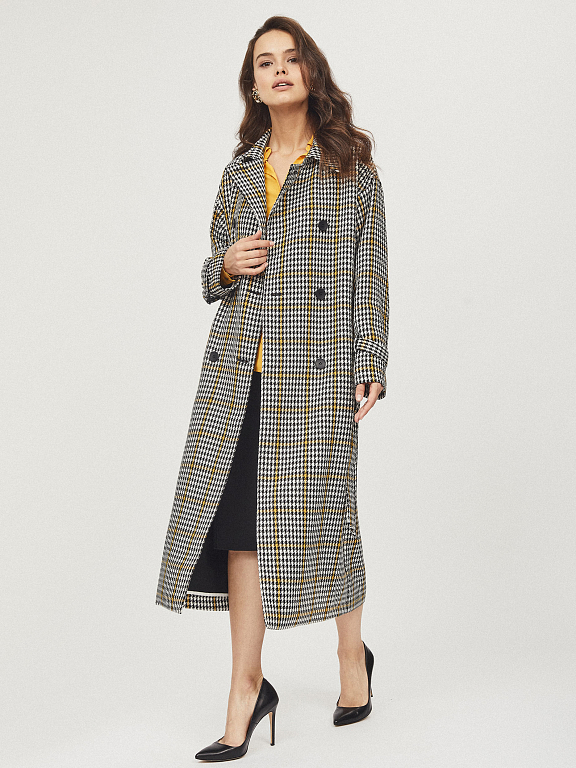 Пальто приталенного кроя с поясом в тон. Лацканы, спущенная линия плеч, широкие рукава с клапанами на пуговицах, прорезные карманы, шлица. Застегивается на два ряда крупных контрастных пуговиц.
