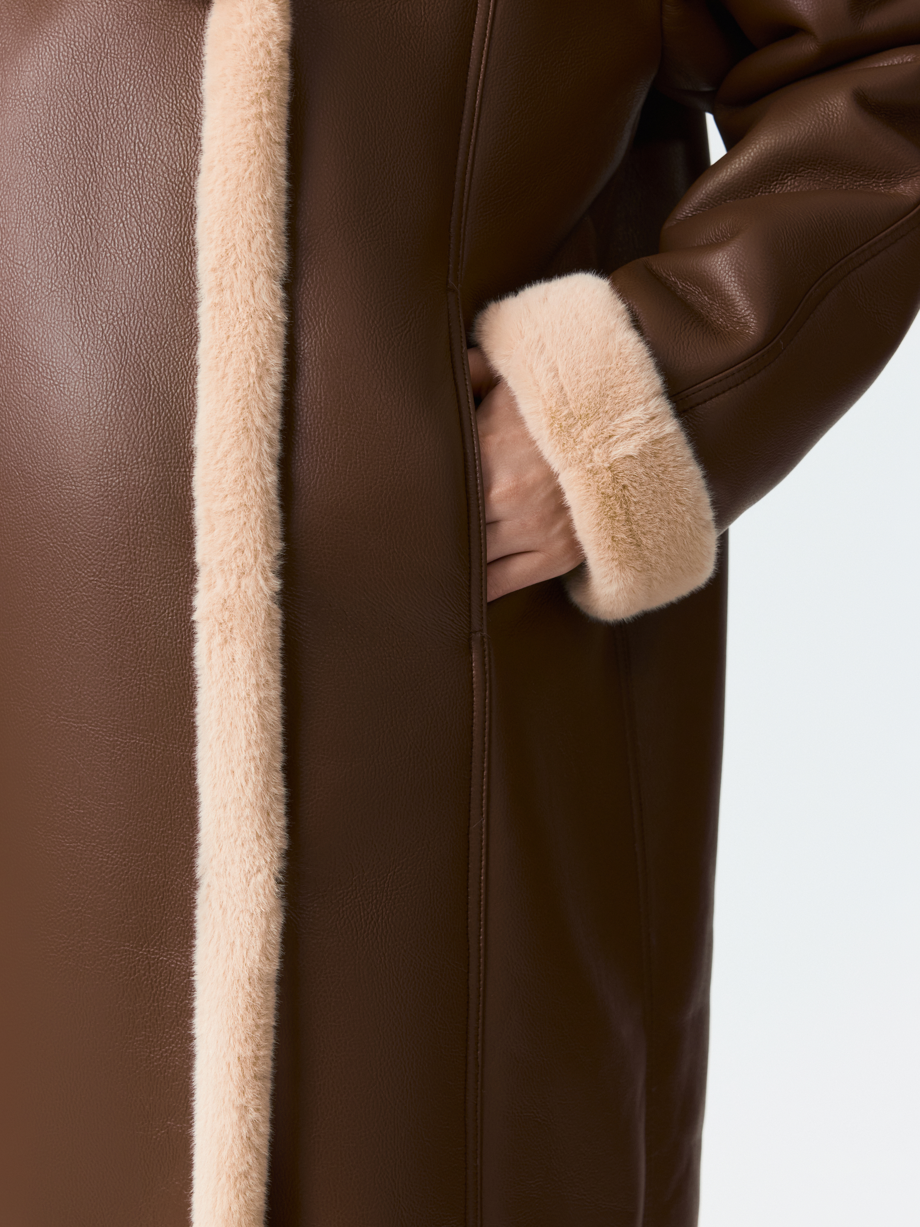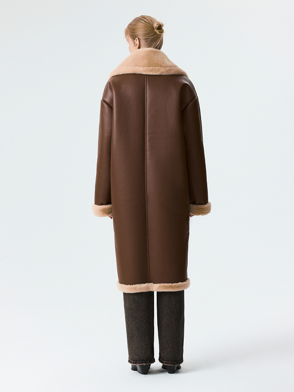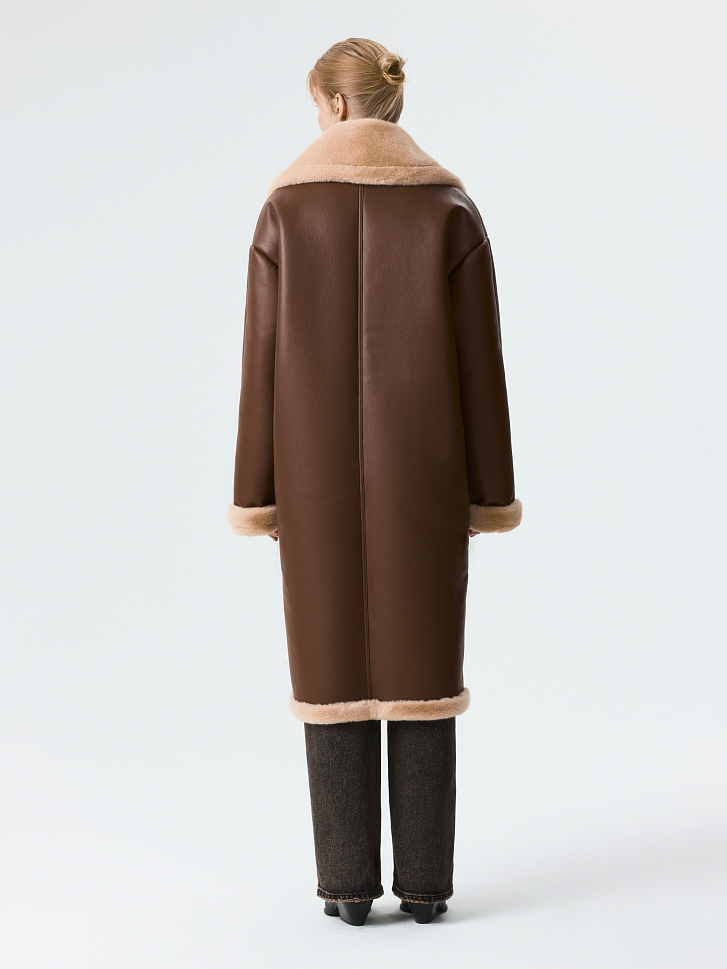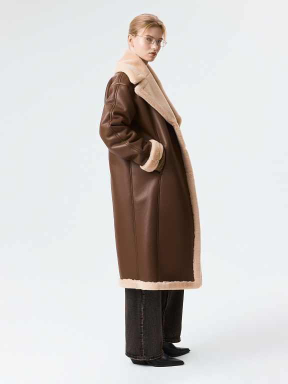 Длинная дубленка сделает зимние прогулки комфортными, а образы – стильными. Модель из искусственной кожи и изнанки из искусственного меха хорошо сохраняет тепло даже в морозы. Свободный силуэт в сочетании с застежкой на кнопки создает функциональный элемент гардероба.