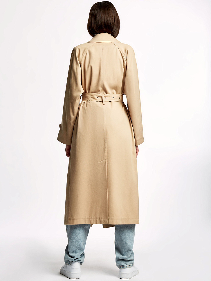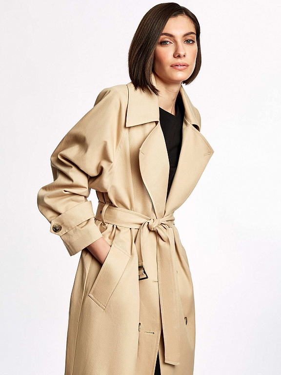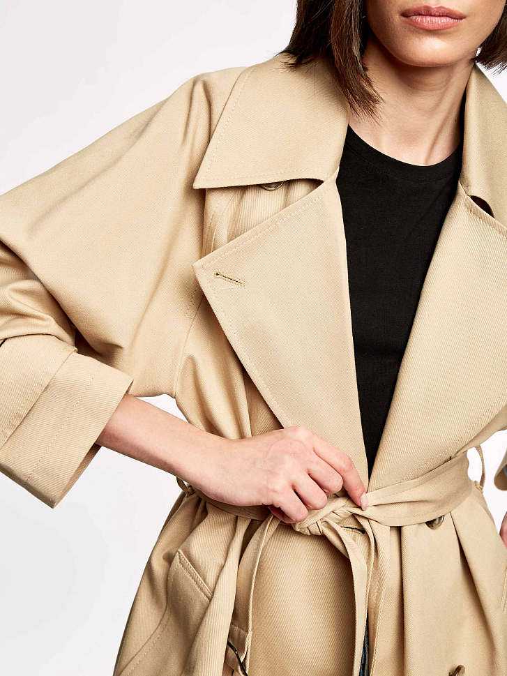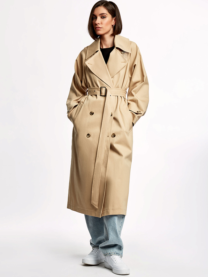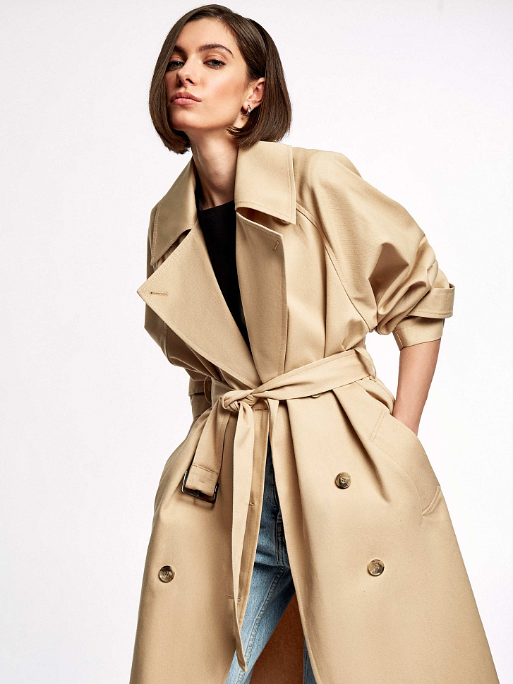 Однотонный тренч из хлопка с водоотталкивающей пропиткой. Прямой крой, длина миди, отложной воротник с лацканами, боковые карманы. В комплекте пояс.