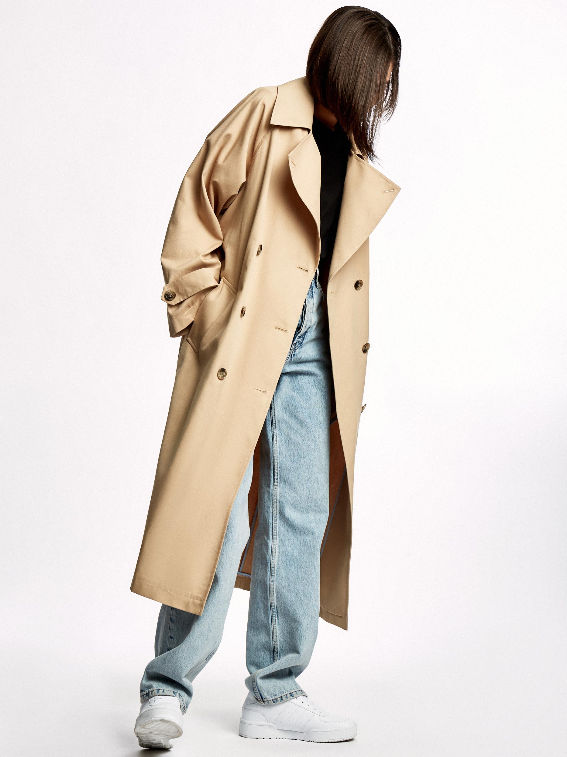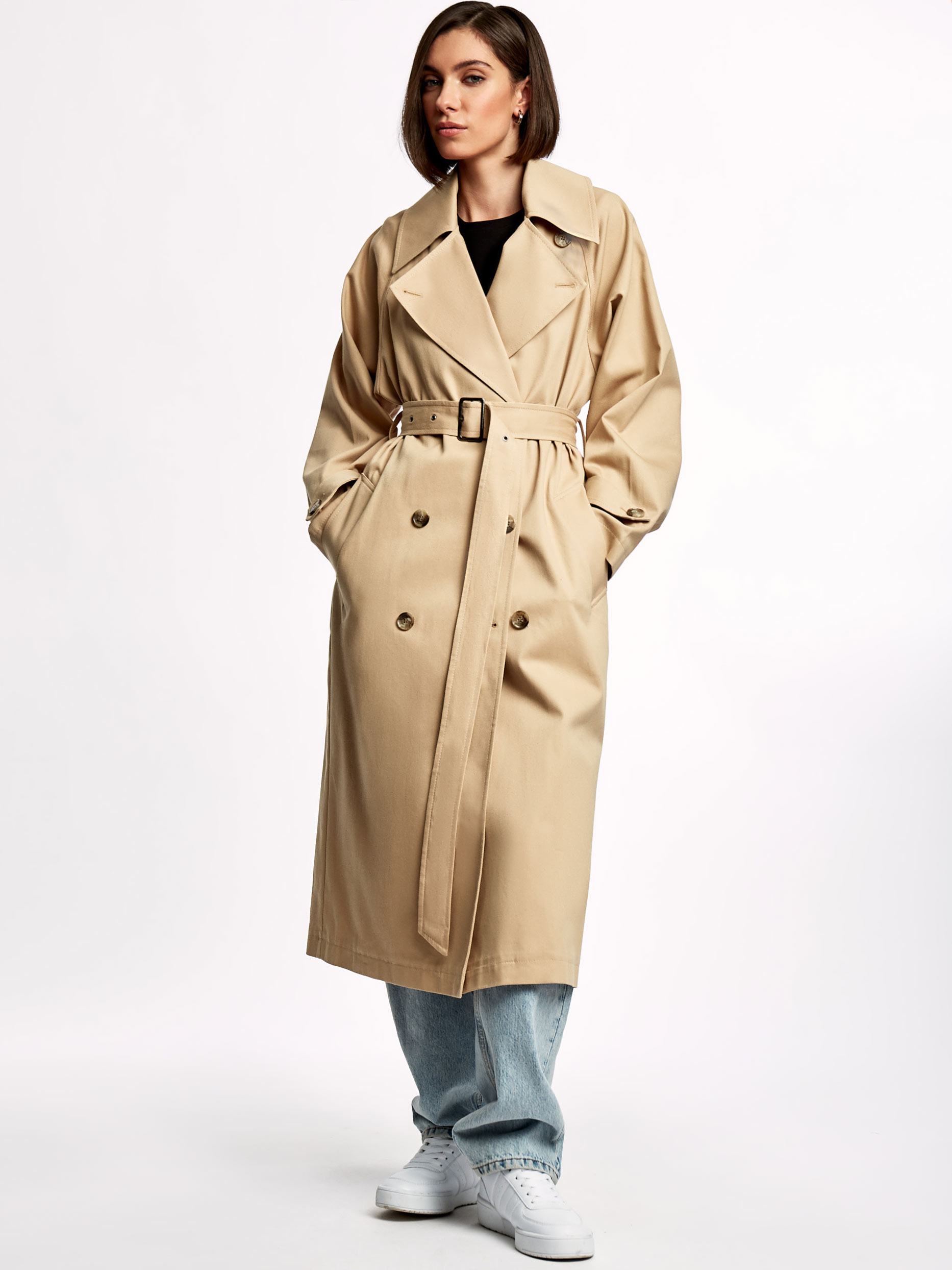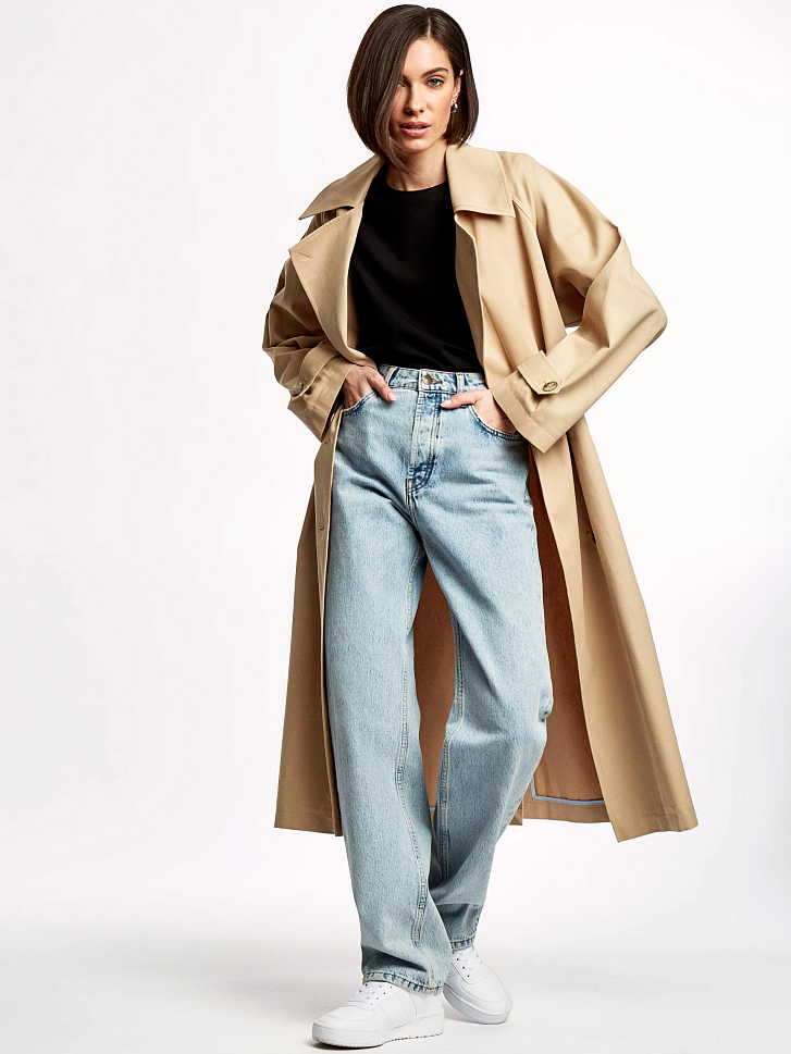Однотонный тренч из хлопка с водоотталкивающей пропиткой. Прямой крой, длина миди, отложной воротник с лацканами, боковые карманы. В комплекте пояс.