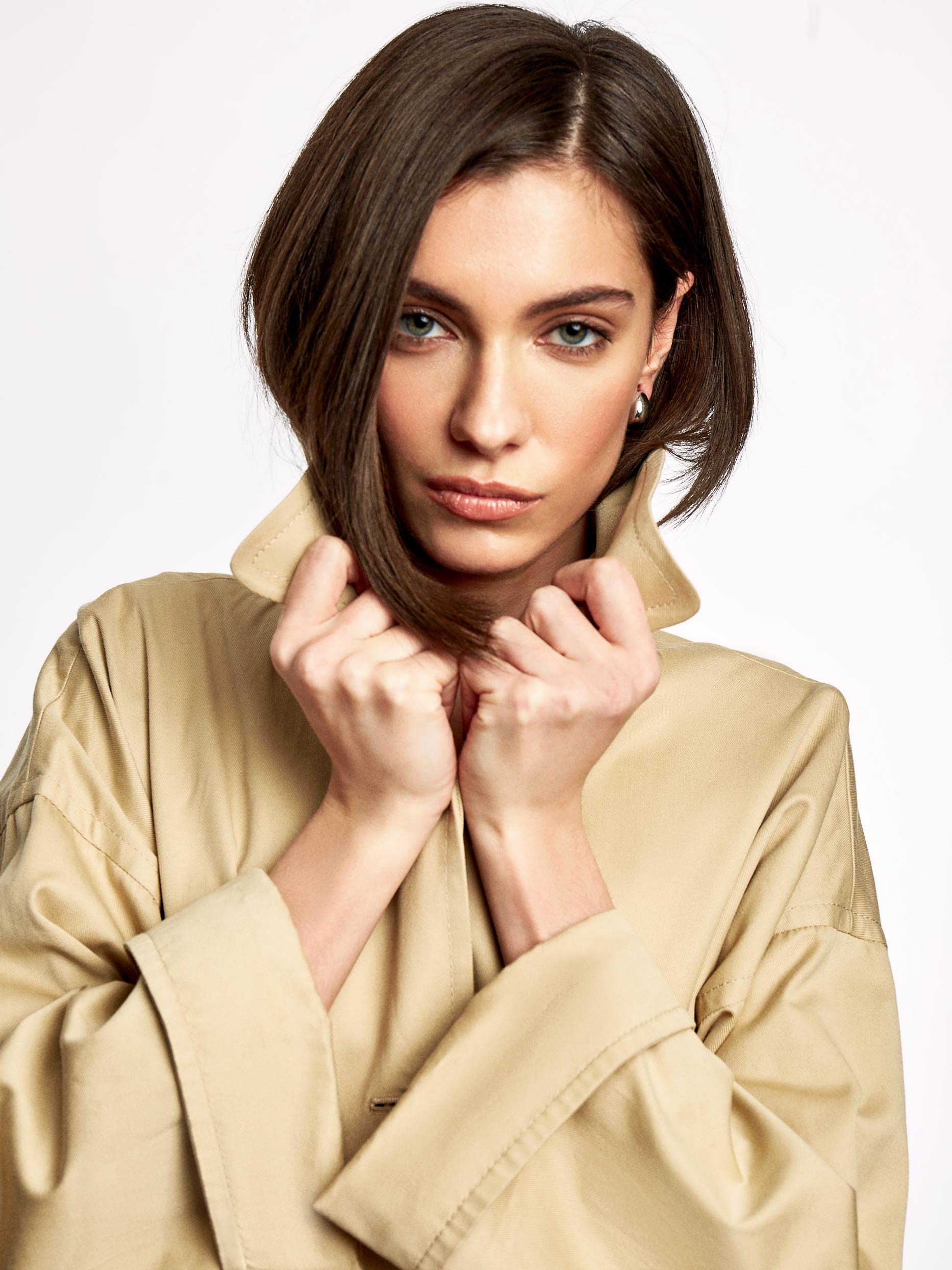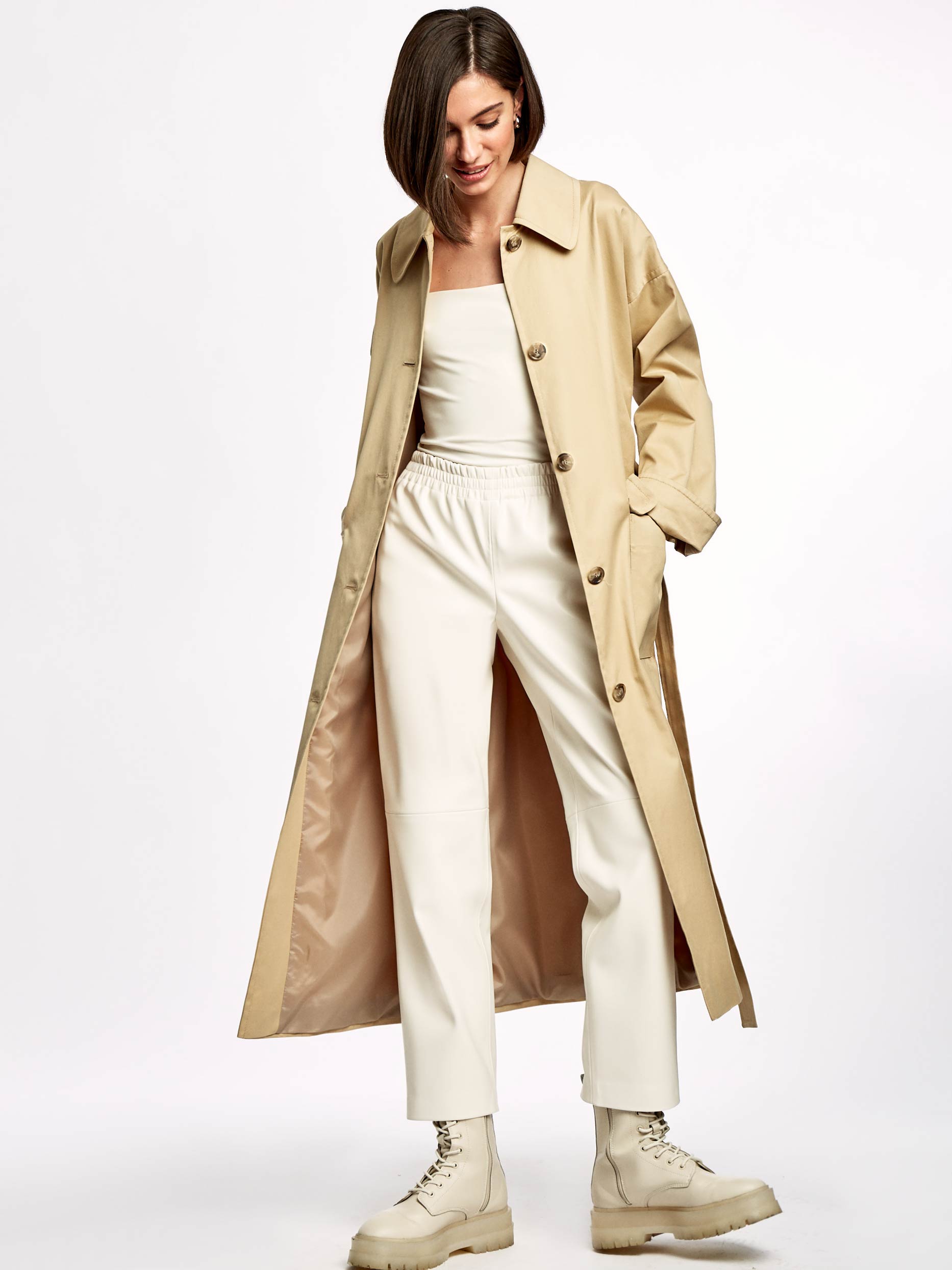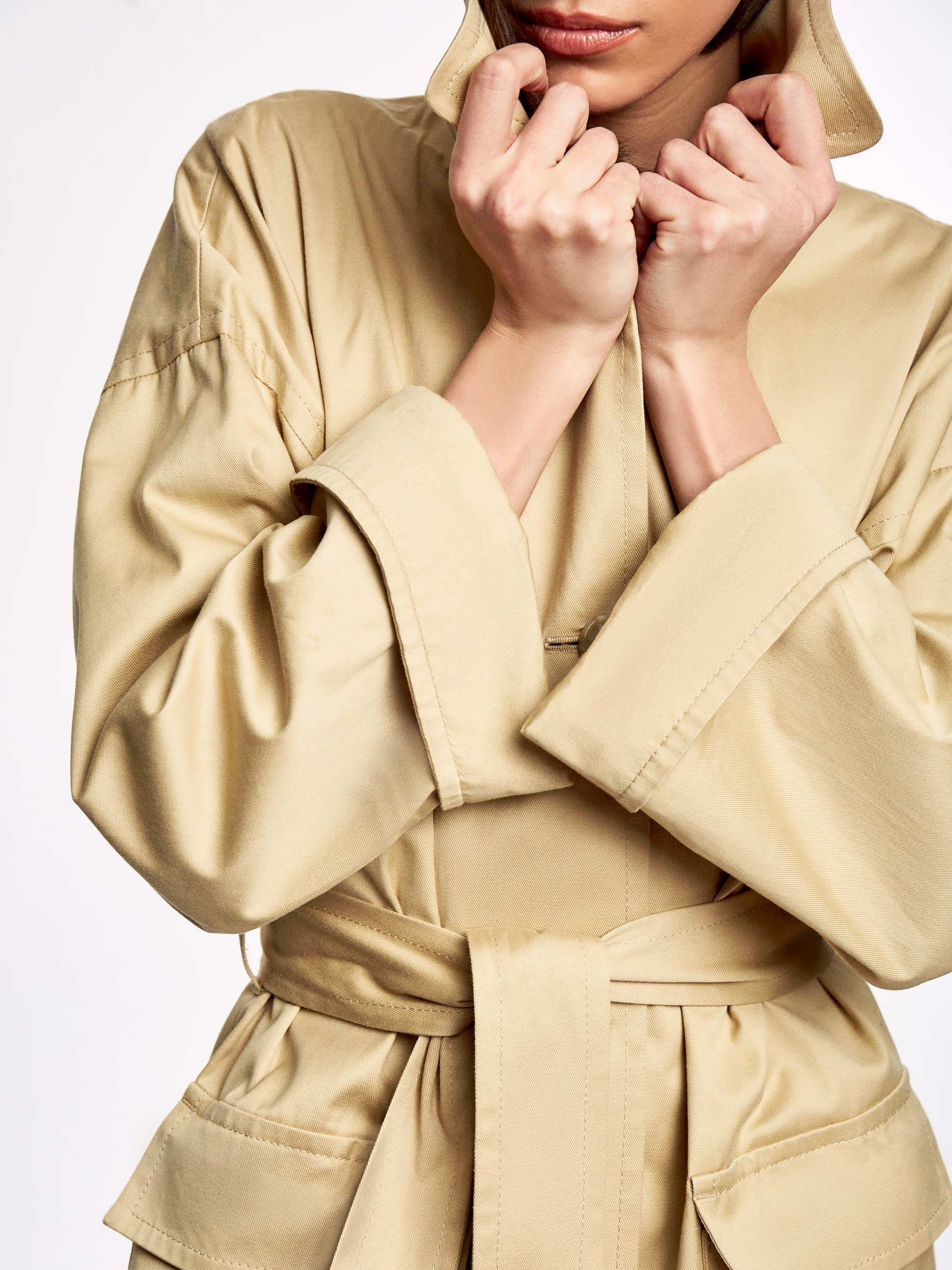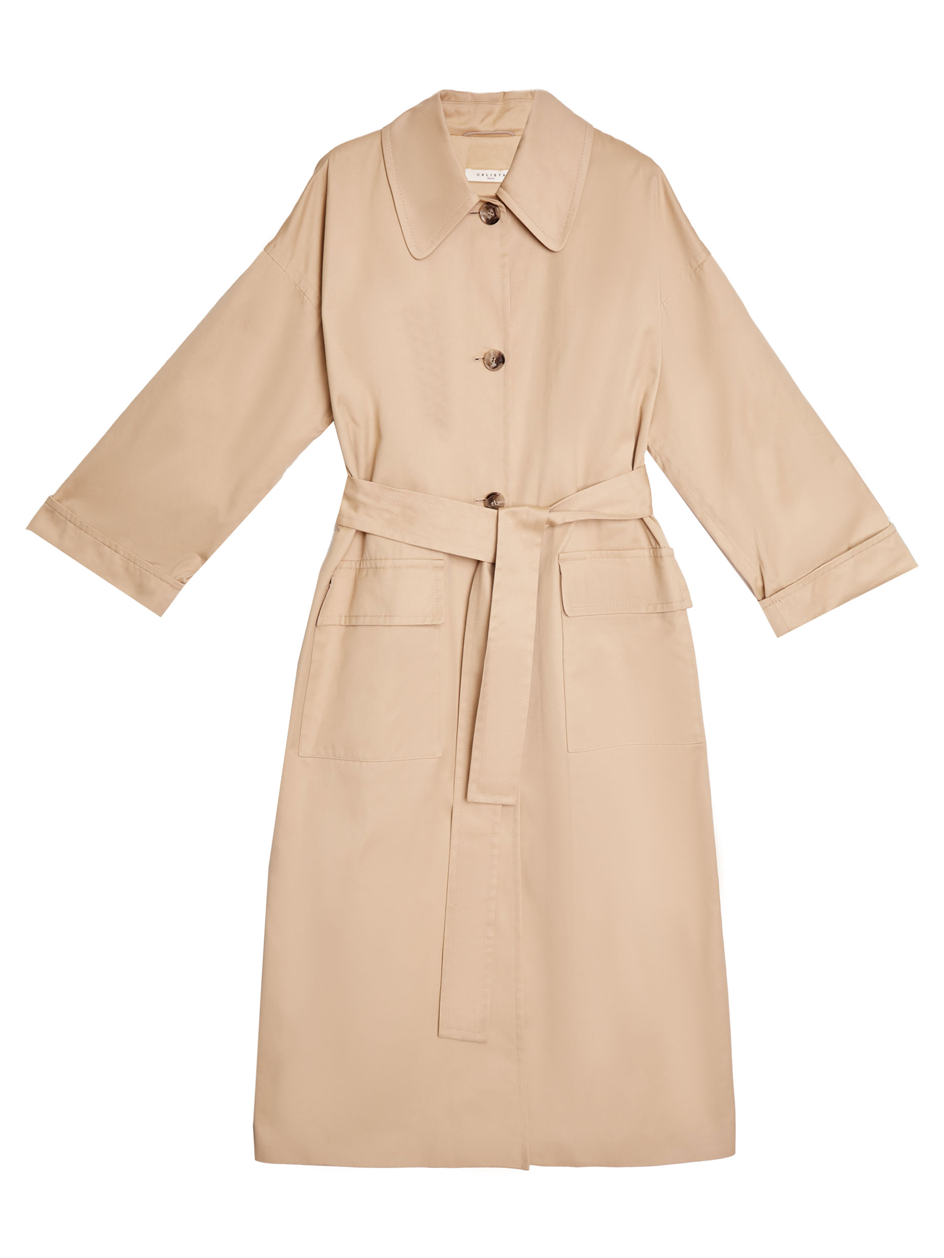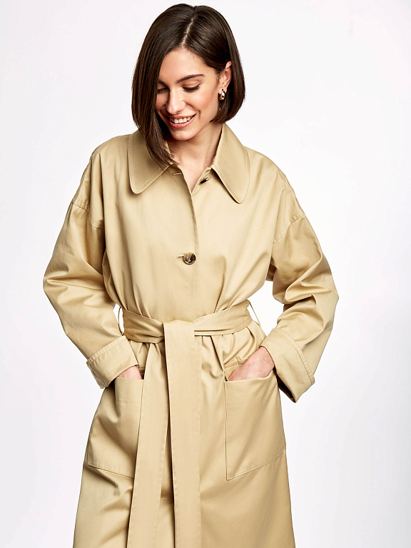 Тренчкот свободного кроя из хлопка. Отложной воротник, спущенная линия плеч, свободные рукава с отворотами, накладные карманы с клапанами, подкладка. В комплекте пояс.